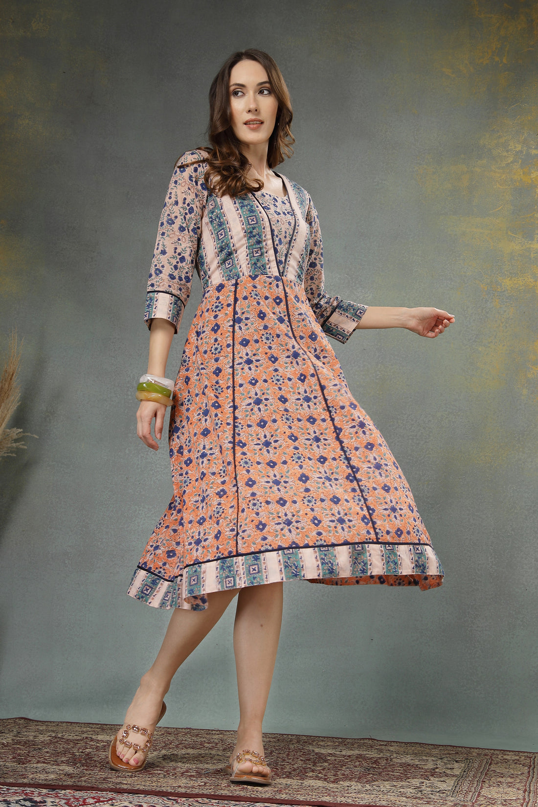 Ancestor Hand-Block Printed Cotton A-Line Dress with 3/4 Sleeves