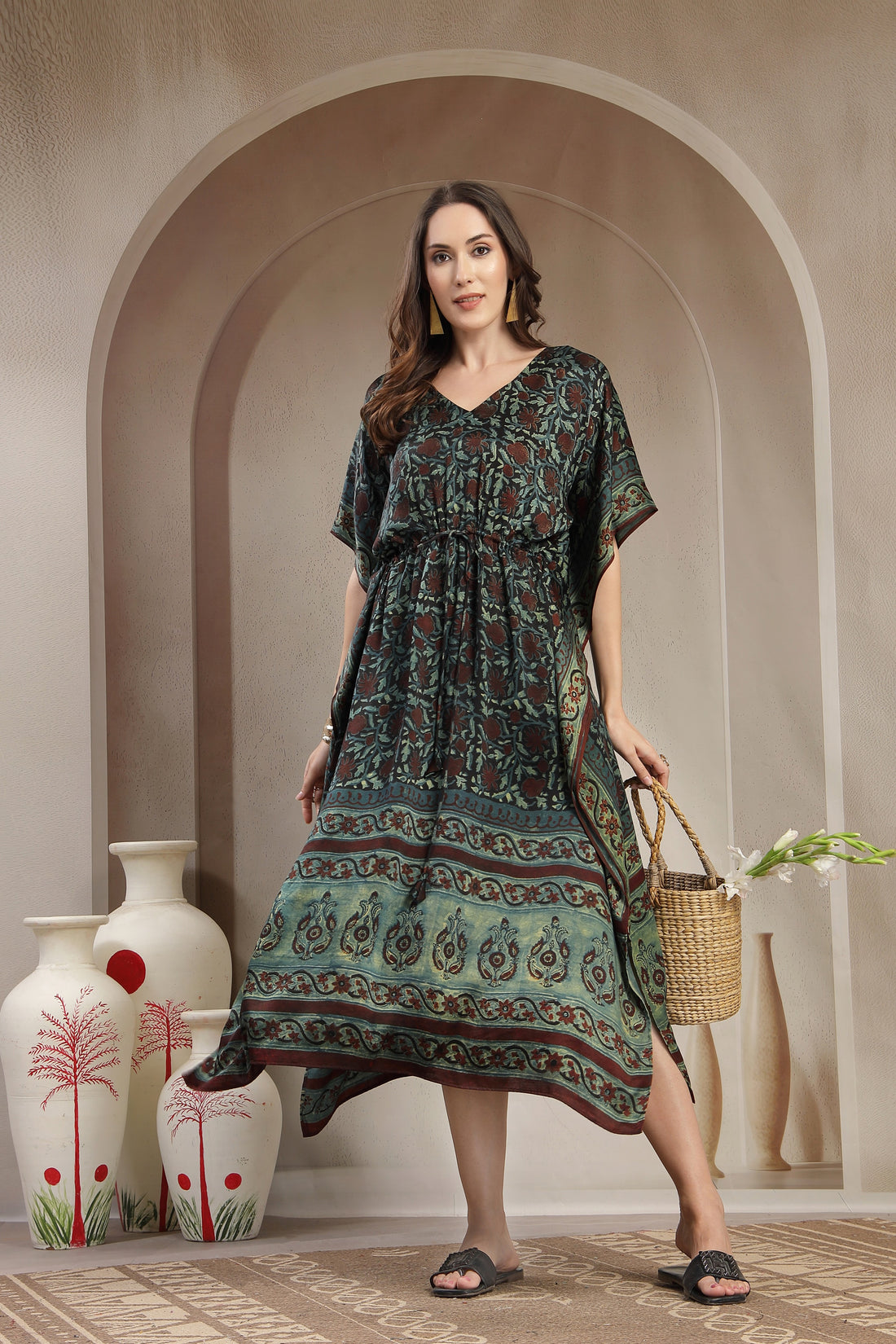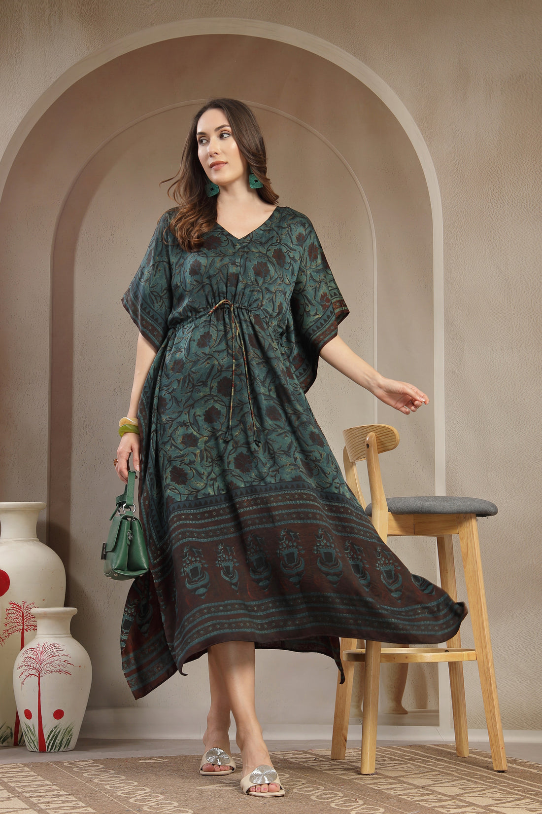 Elegant Forest Green Modal Satin Printed Kaftan Dress | Soft Flowing Silhouette