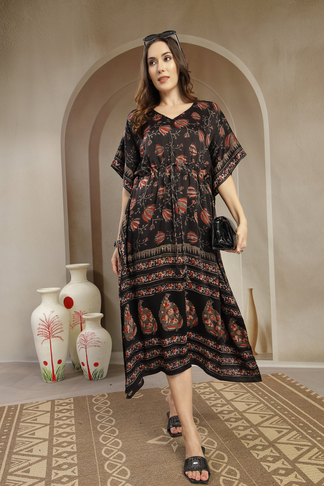 Classic Black Modal Satin Printed Kaftan Dress | Elegant Flow & Soft Luxe Feel