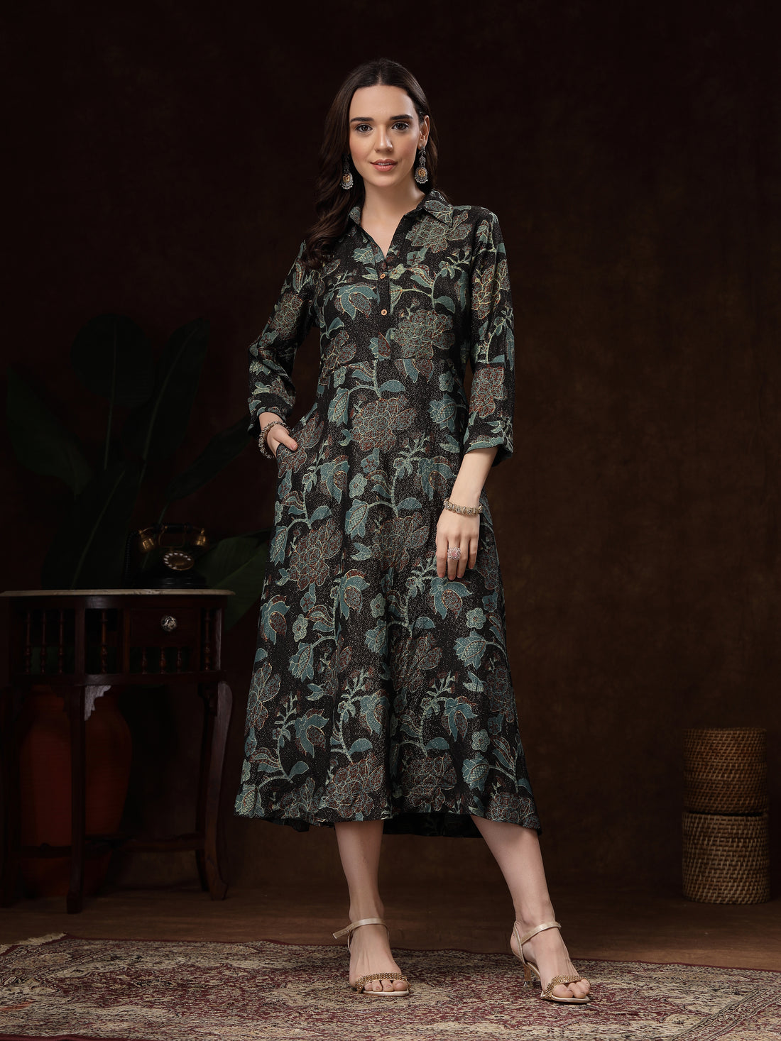 Elegant Green Printed A-Line Midi Dress – Collared Neck