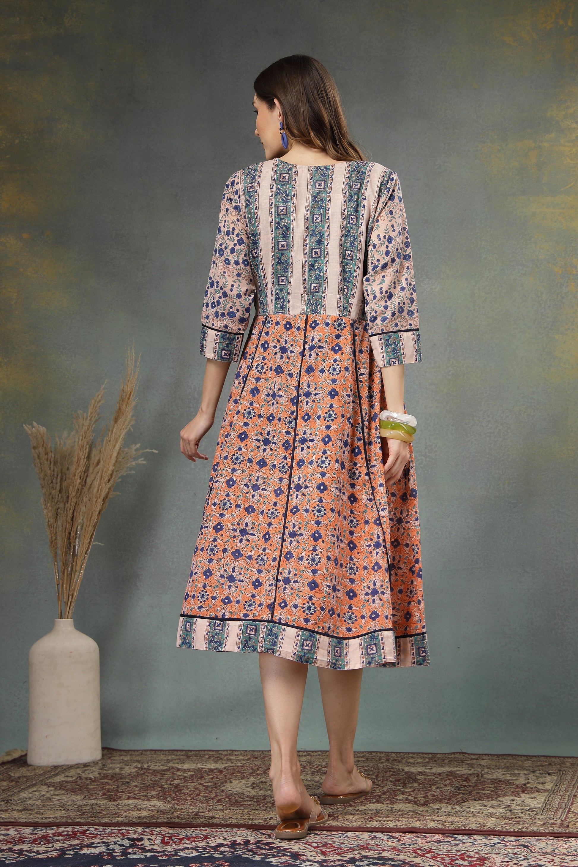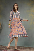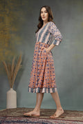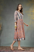 Ancestor Hand-Block Printed Cotton A-Line Dress with 3/4 Sleeves