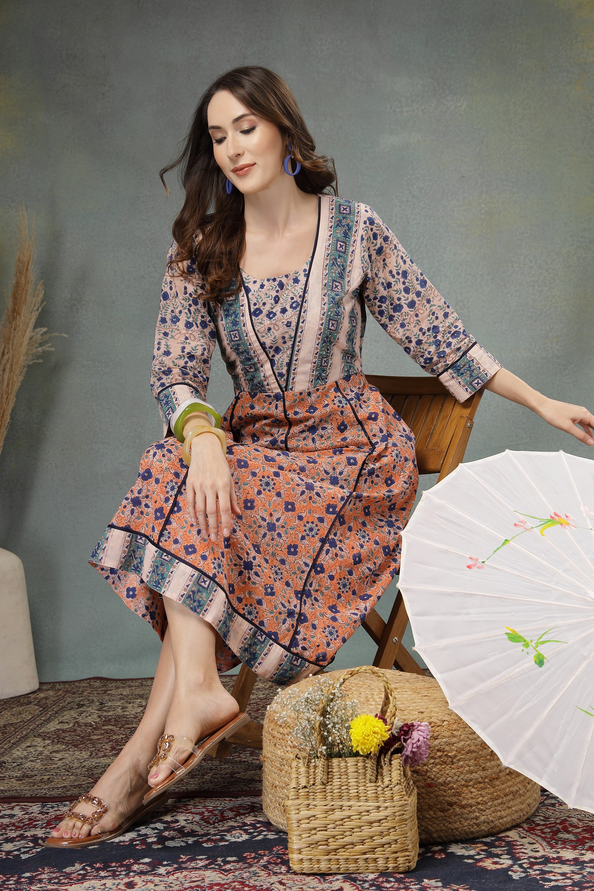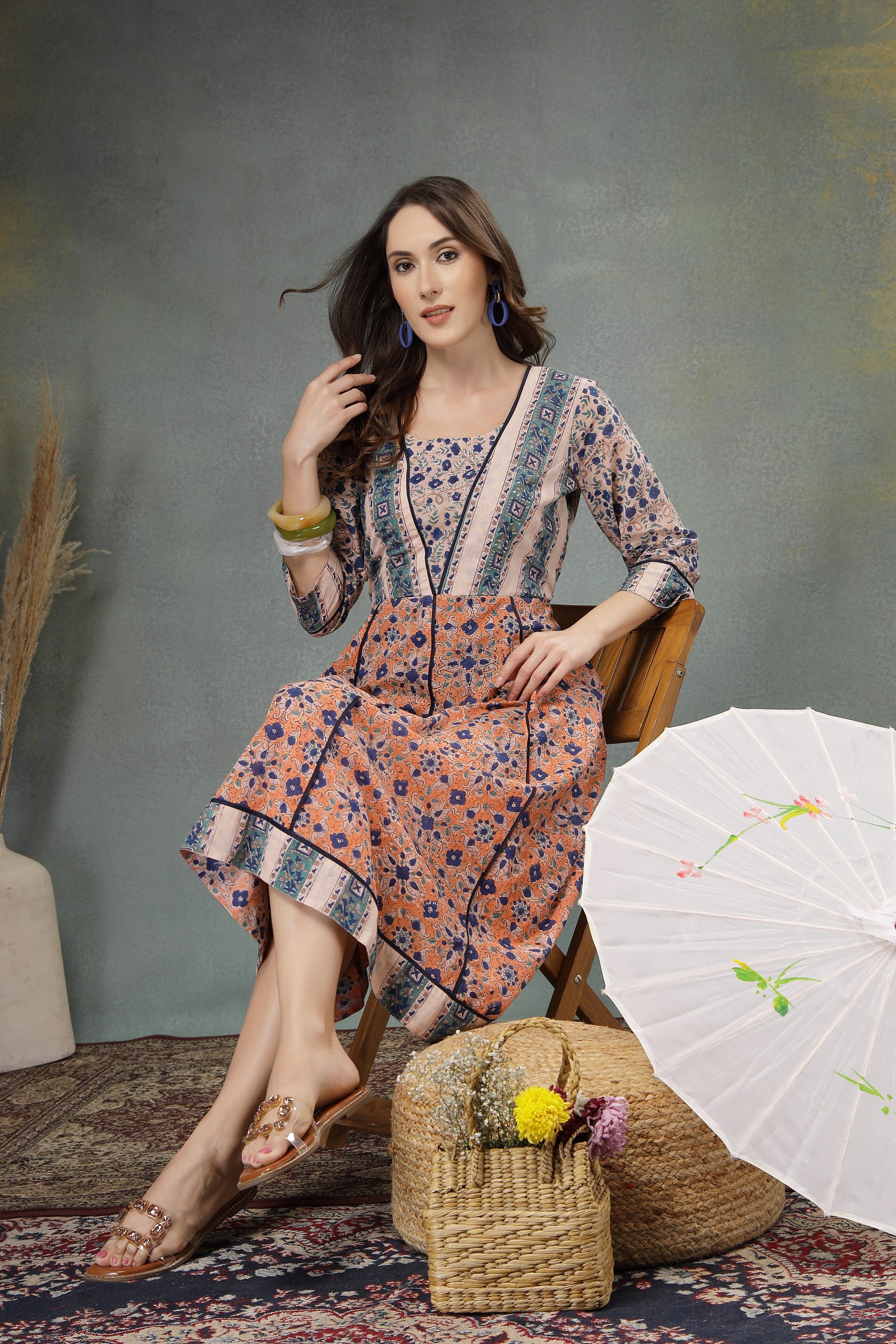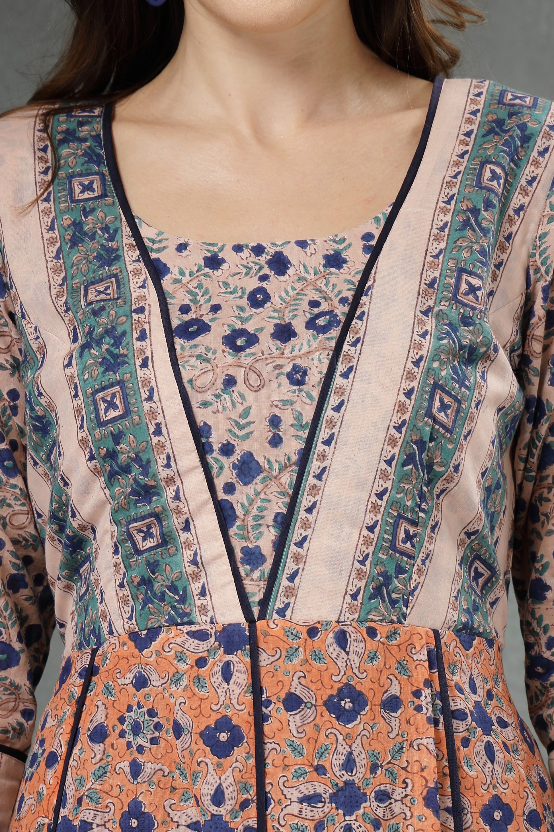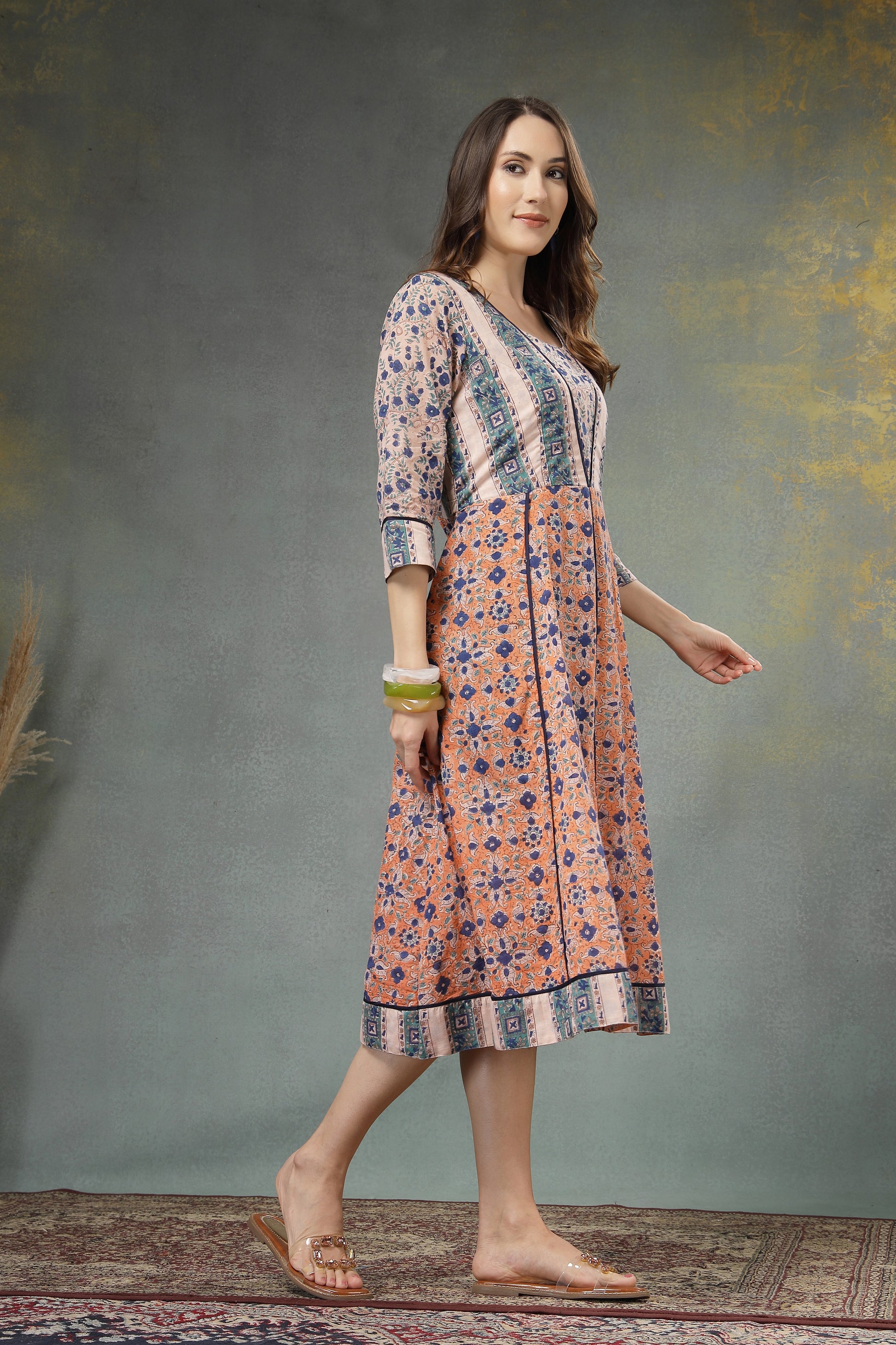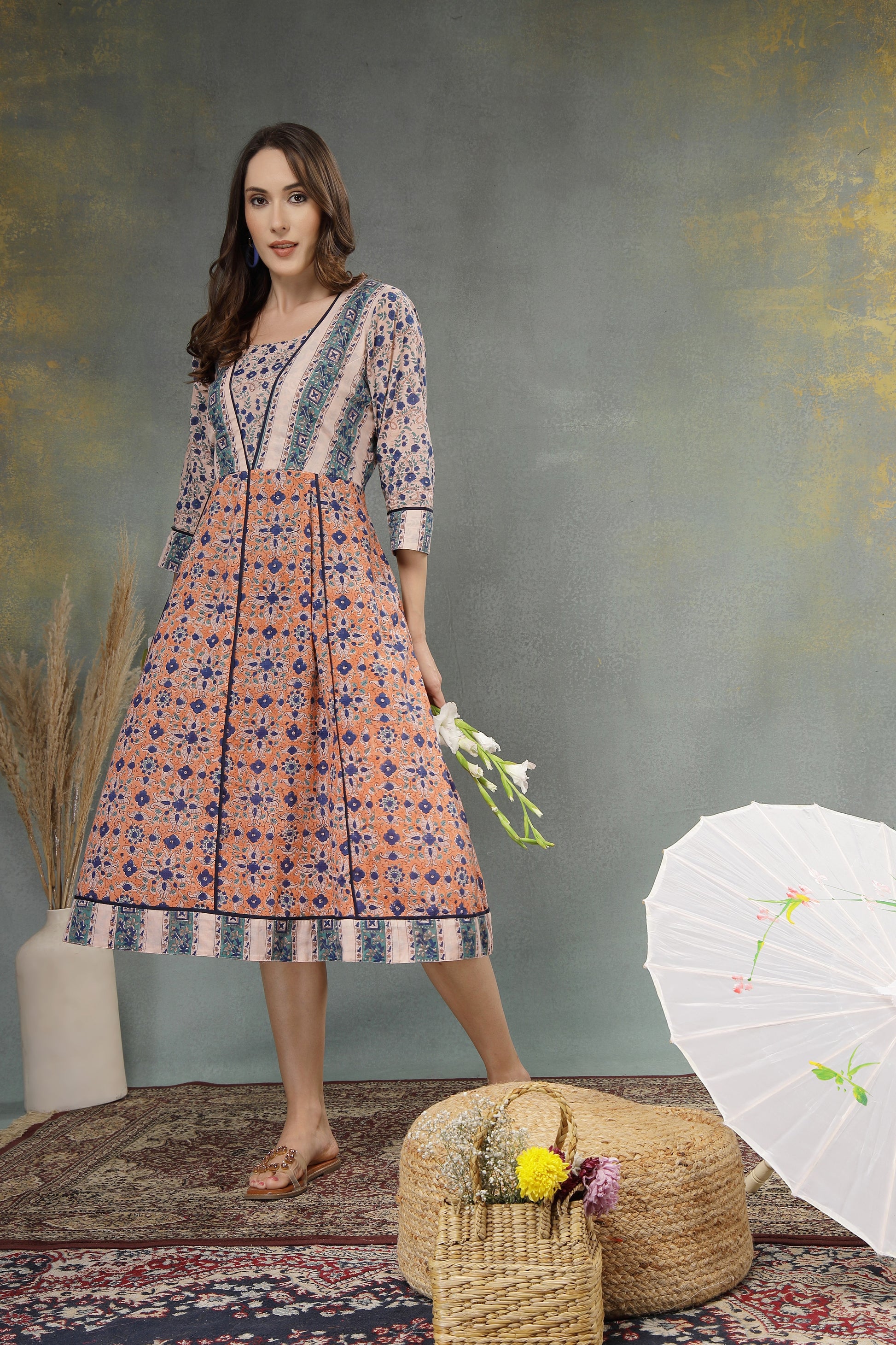 Step into effortless elegance with this beautifully crafted cotton A-line dress. Designed with a harmonious blend of floral prints and contrasting panels, this dress offers a graceful silhouette that flows comfortably with every step. The breathable cotton fabric ensures all-day comfort, making it perfect for casual outings, daytime gatherings, or festive brunches. Thoughtful detailing at the neckline, sleeves, and hem adds a refined ethnic touch, while the flattering fit enhances your natural charm.