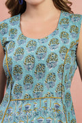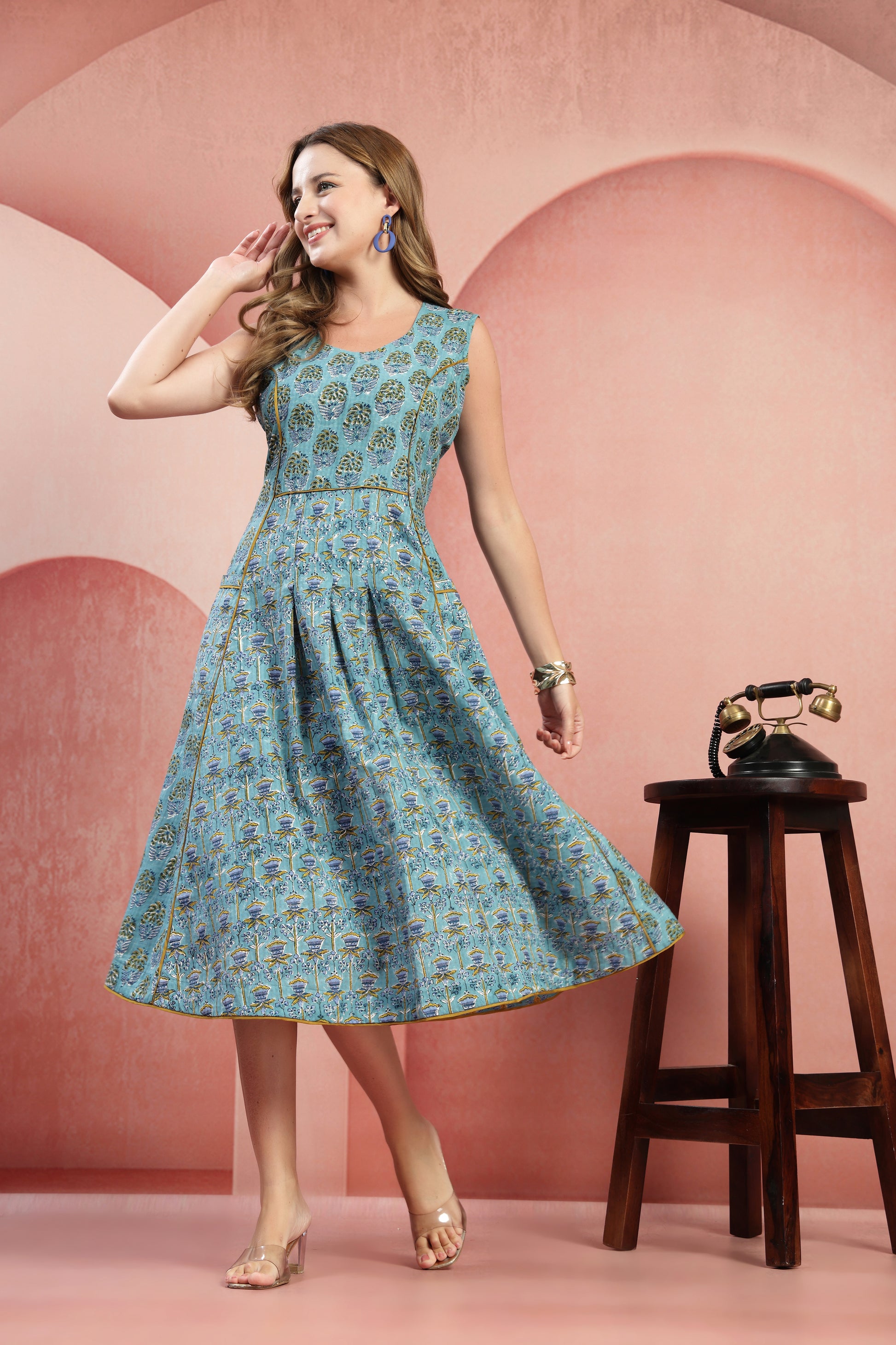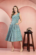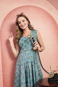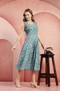 Elevate your everyday style with our Hand-Printed Paneled Cotton Dress. This unique midi-length garment features a masterfully crafted multi-panel construction that blends complementary floral patterns for a modern, bohemian look. Designed with a sleeveless bodice and a gracefully pleated skirt, this dress offers a timeless fit-and-flare silhouette perfect for warm-weather elegance.
