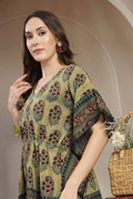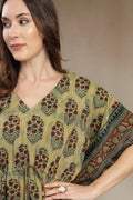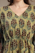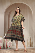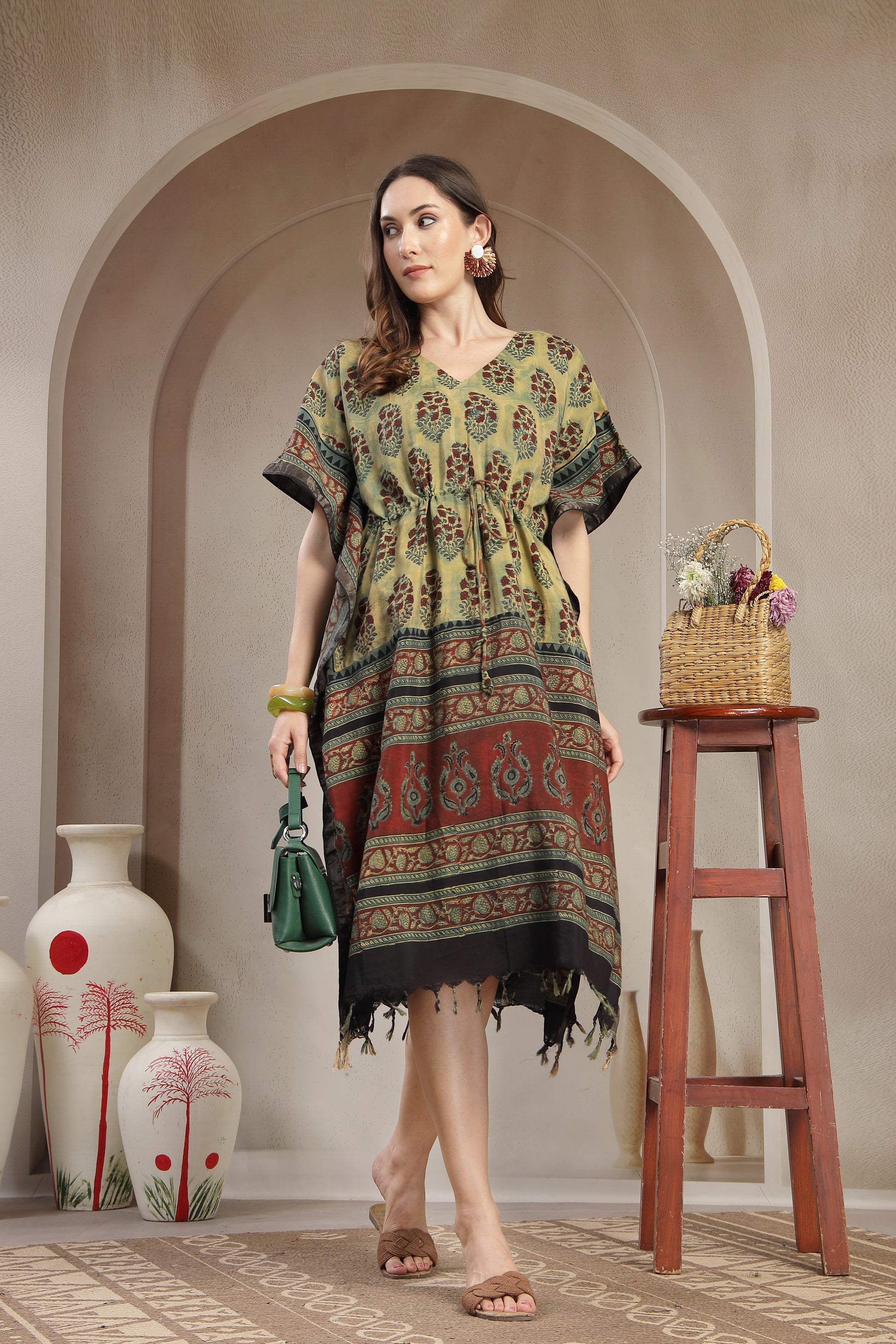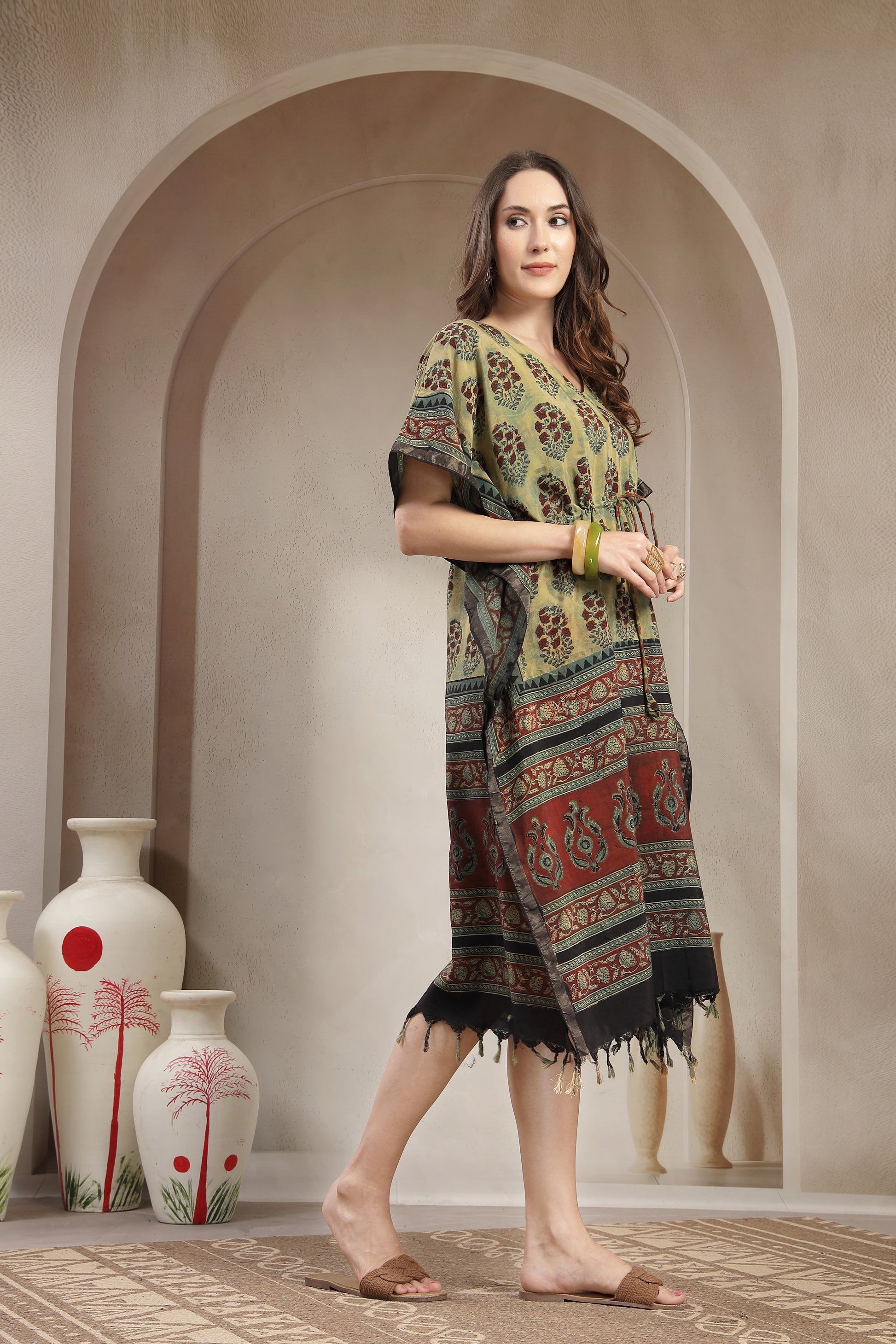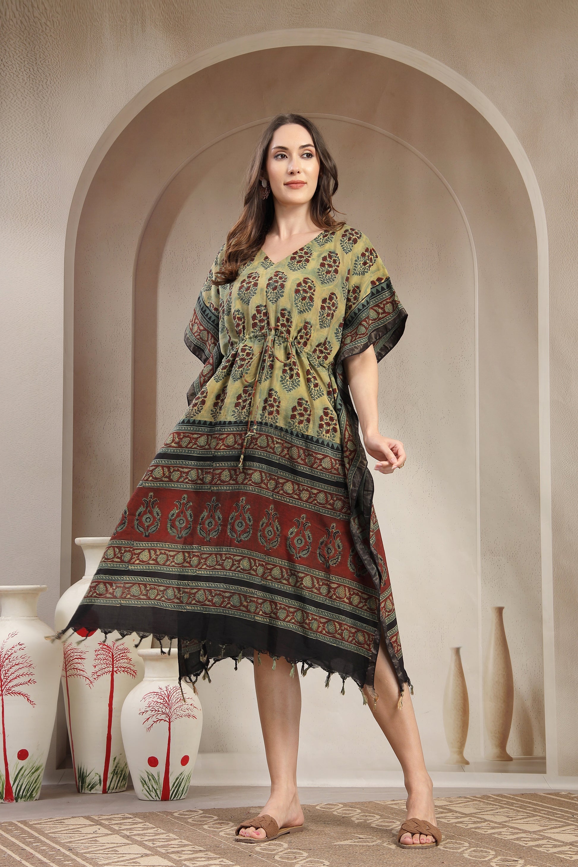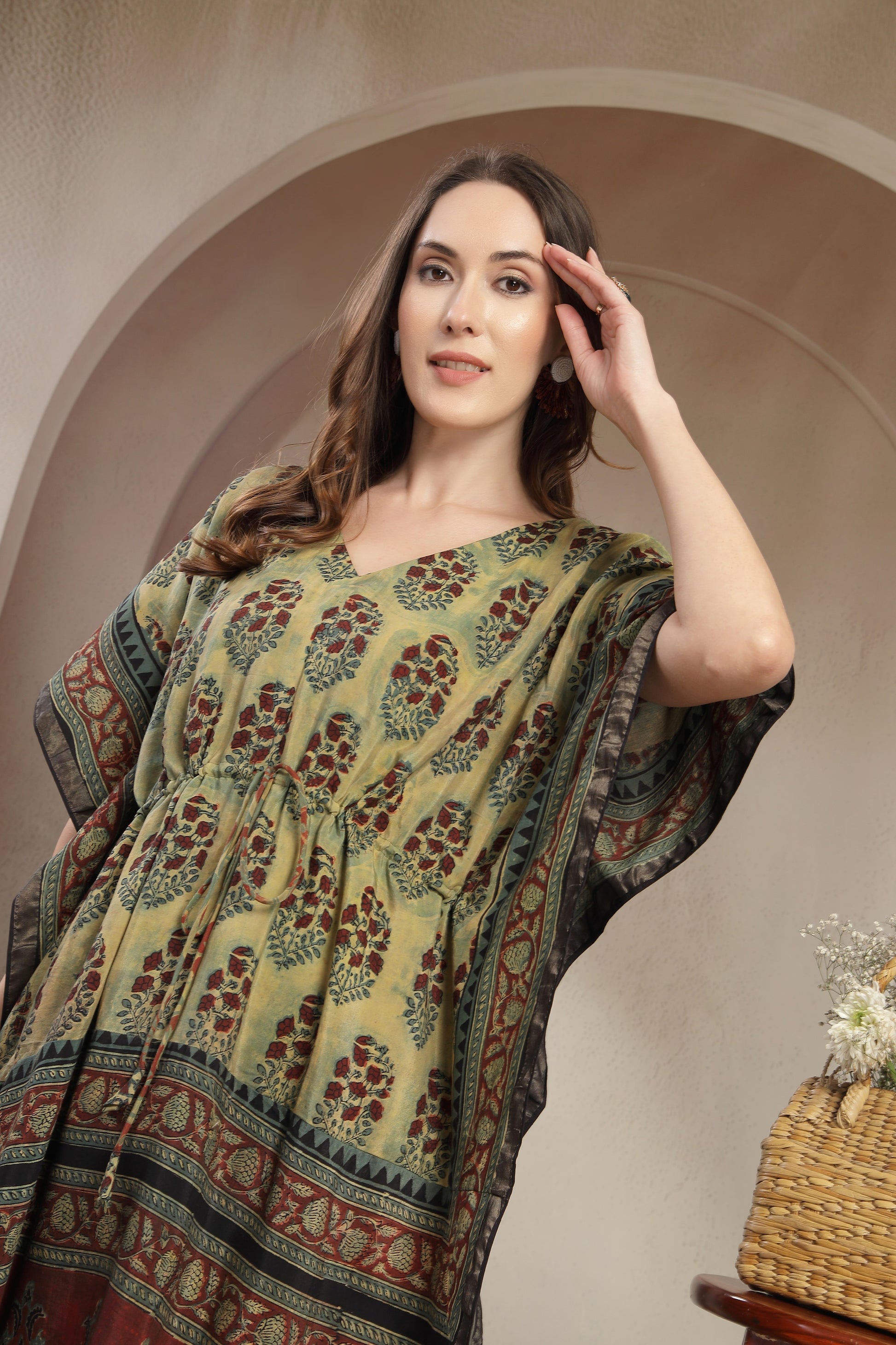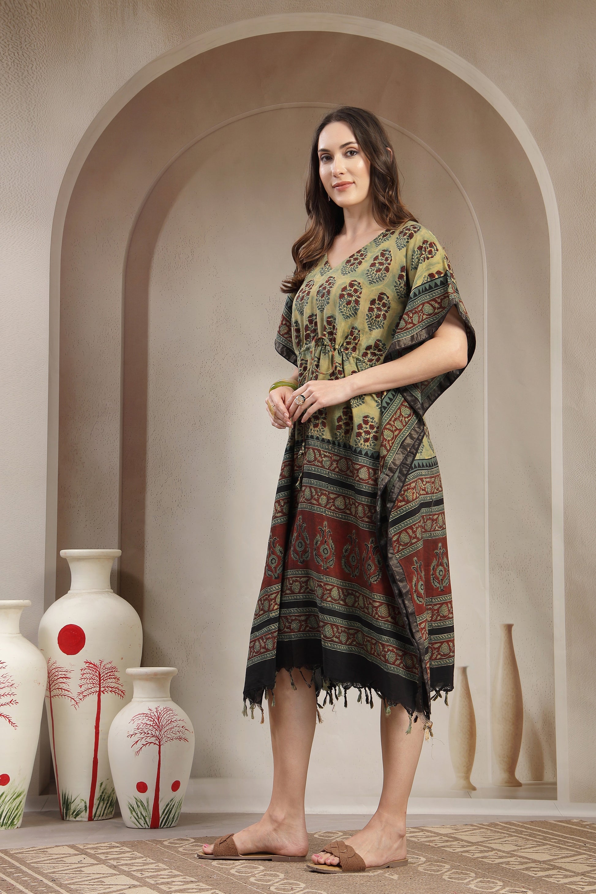 Assam Silk Hand-Block Printed Kaftan Dress with Drawstring Waist