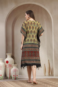 The relaxed silhouette with a soft drawstring waist ensures a flattering fit for all body types, while the flowing sleeves add a graceful drape. Finished with delicate tassel detailing at the hem, this kaftan is perfect for casual outings, festive gatherings, resort wear, or elegant lounging.