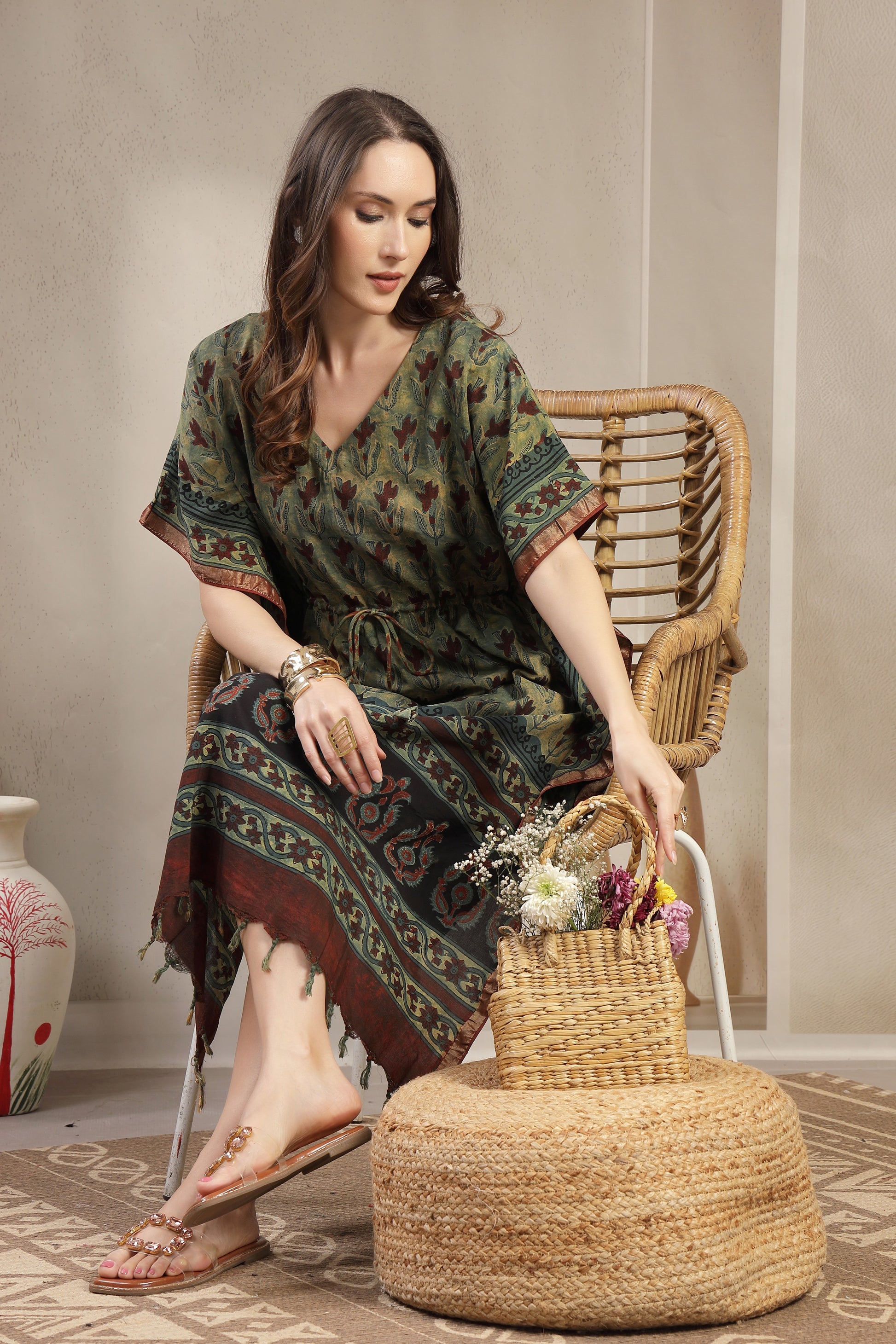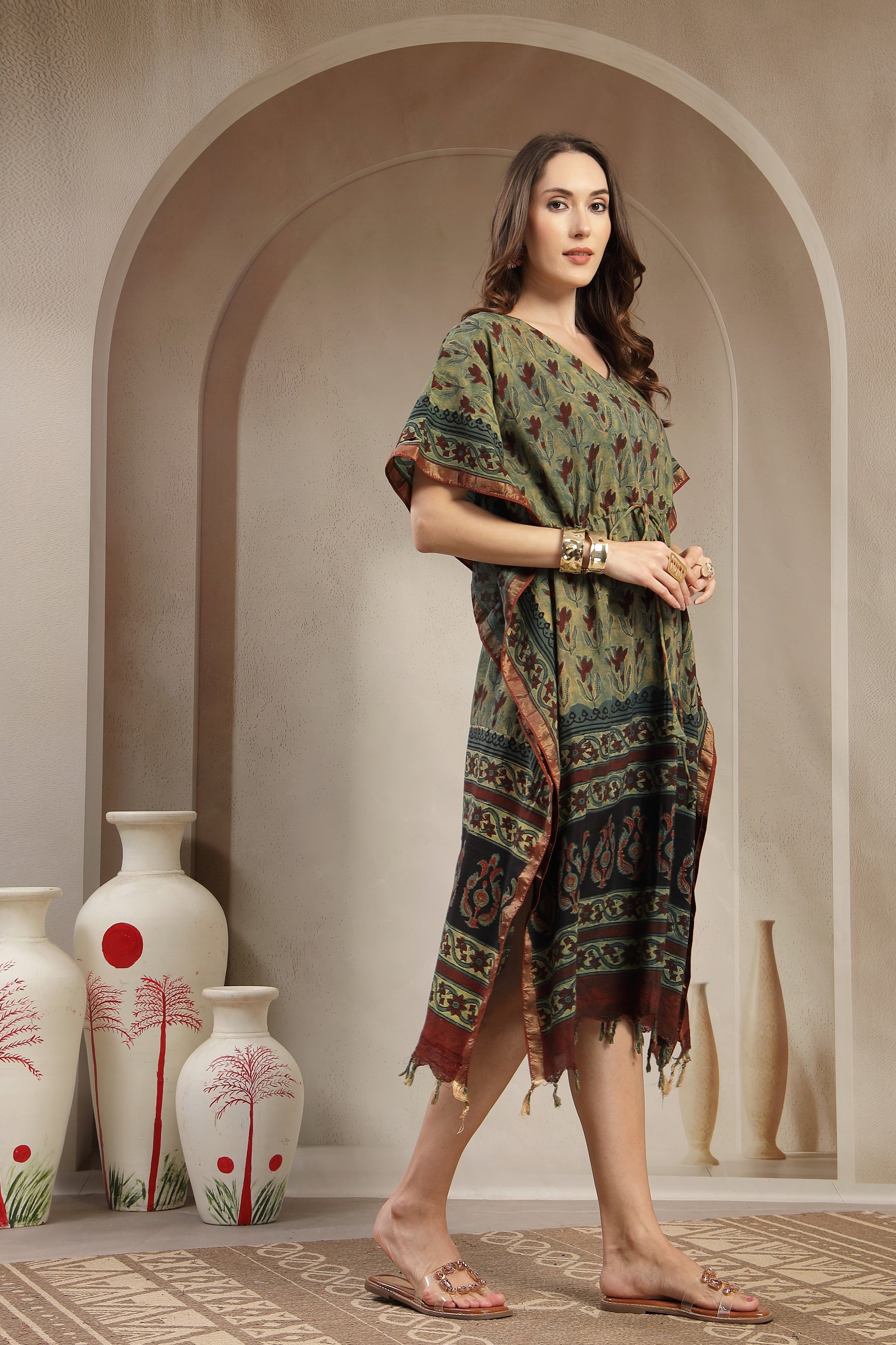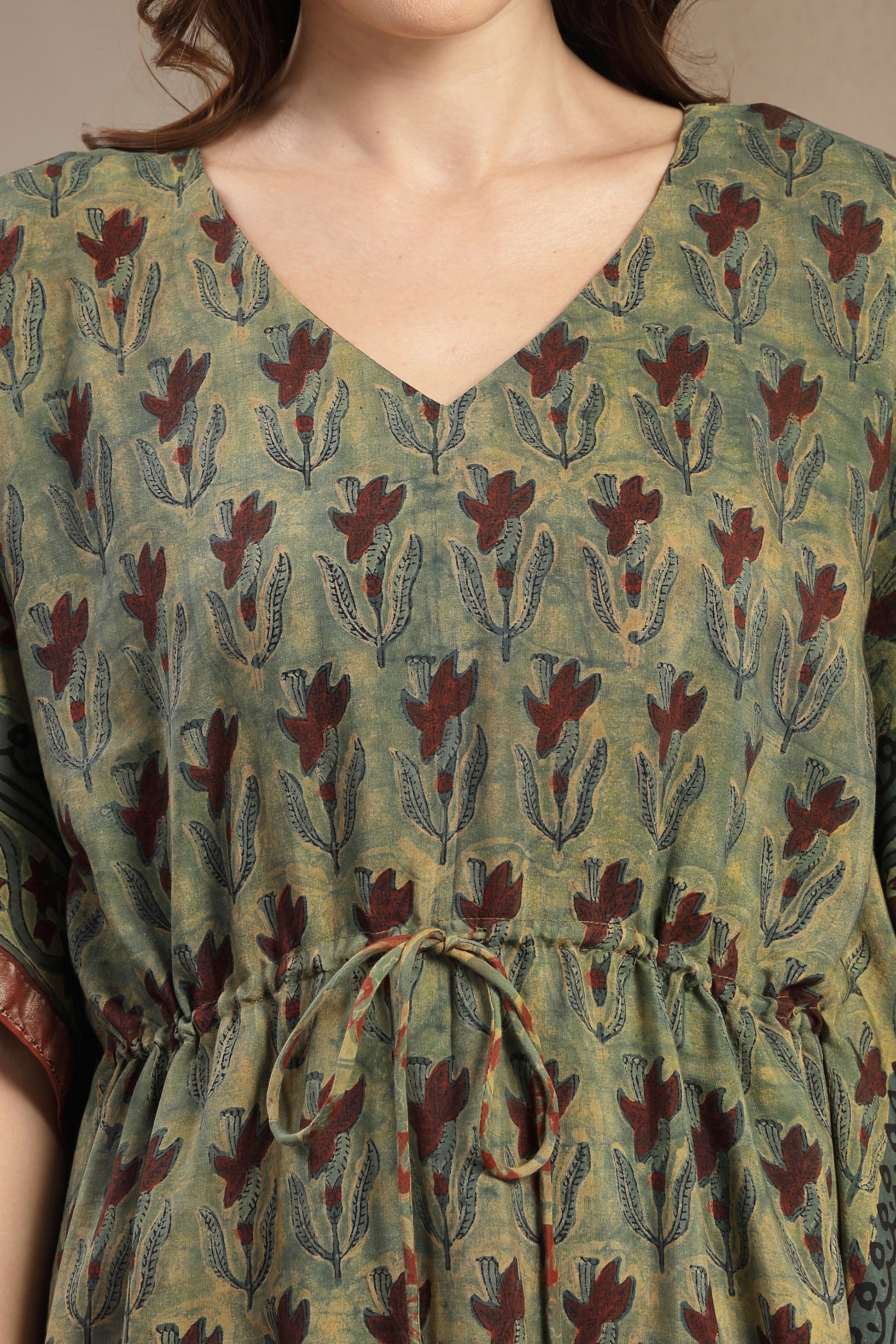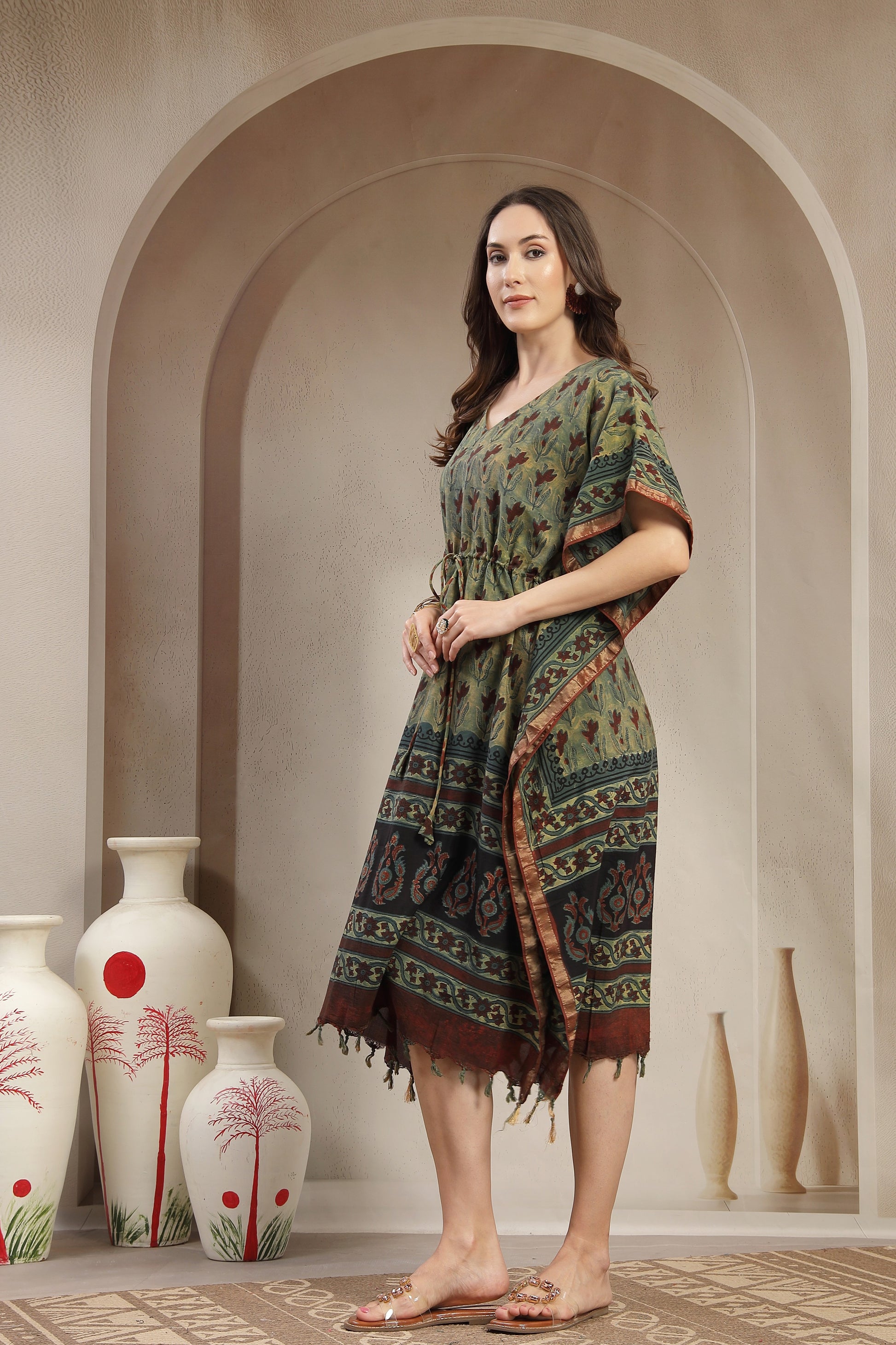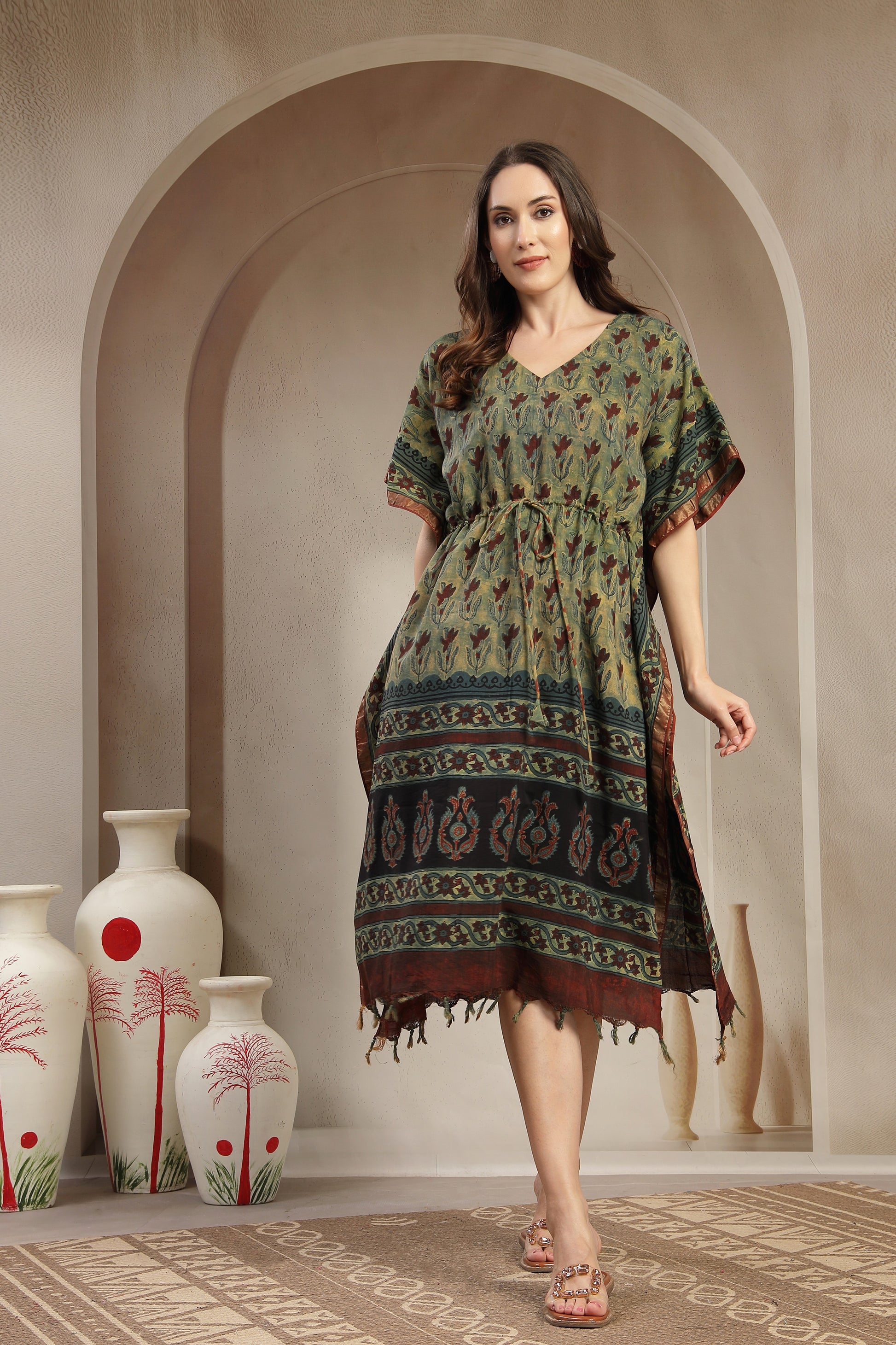 Assam Silk Printed Kaftan Dress with Drawstring Waist