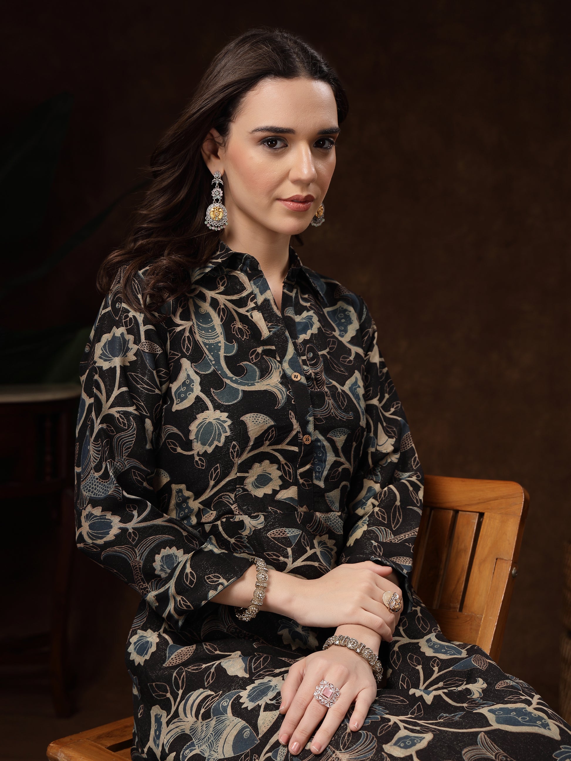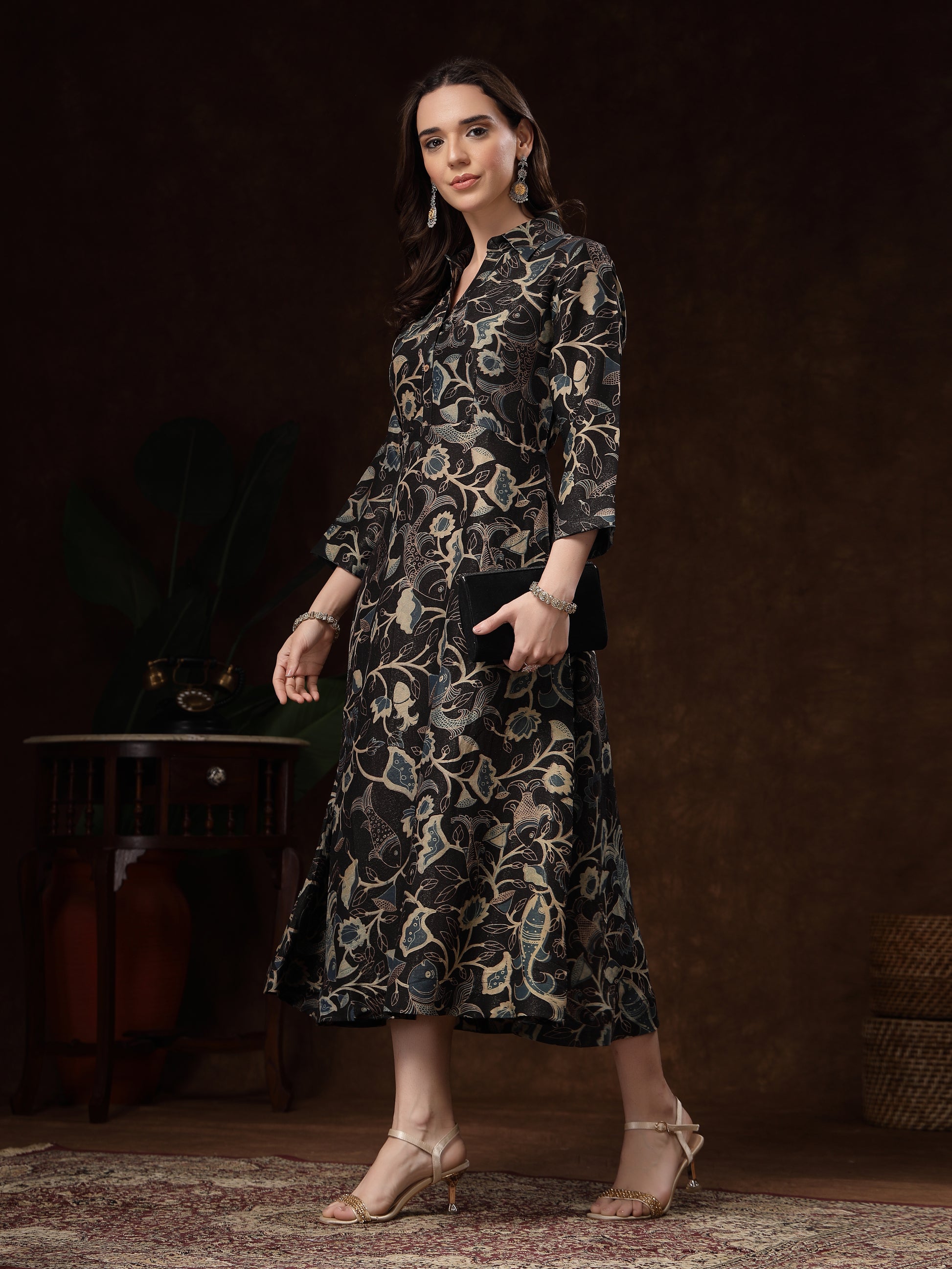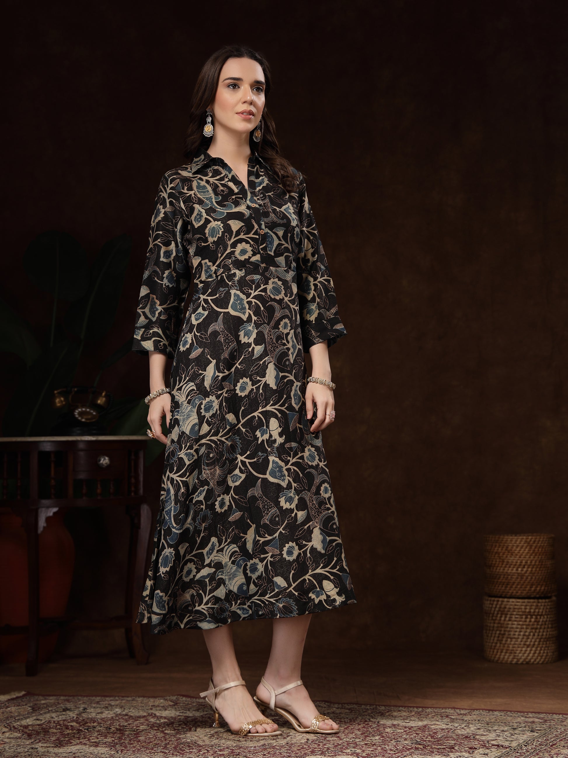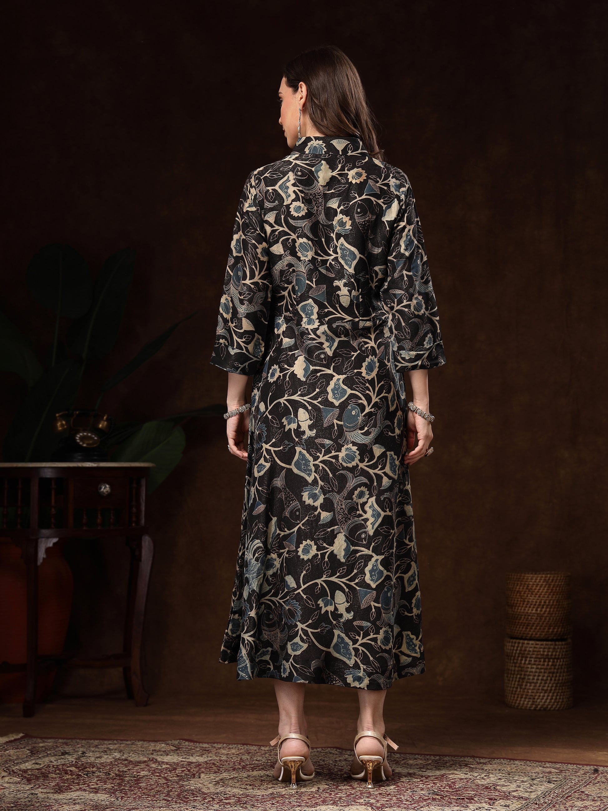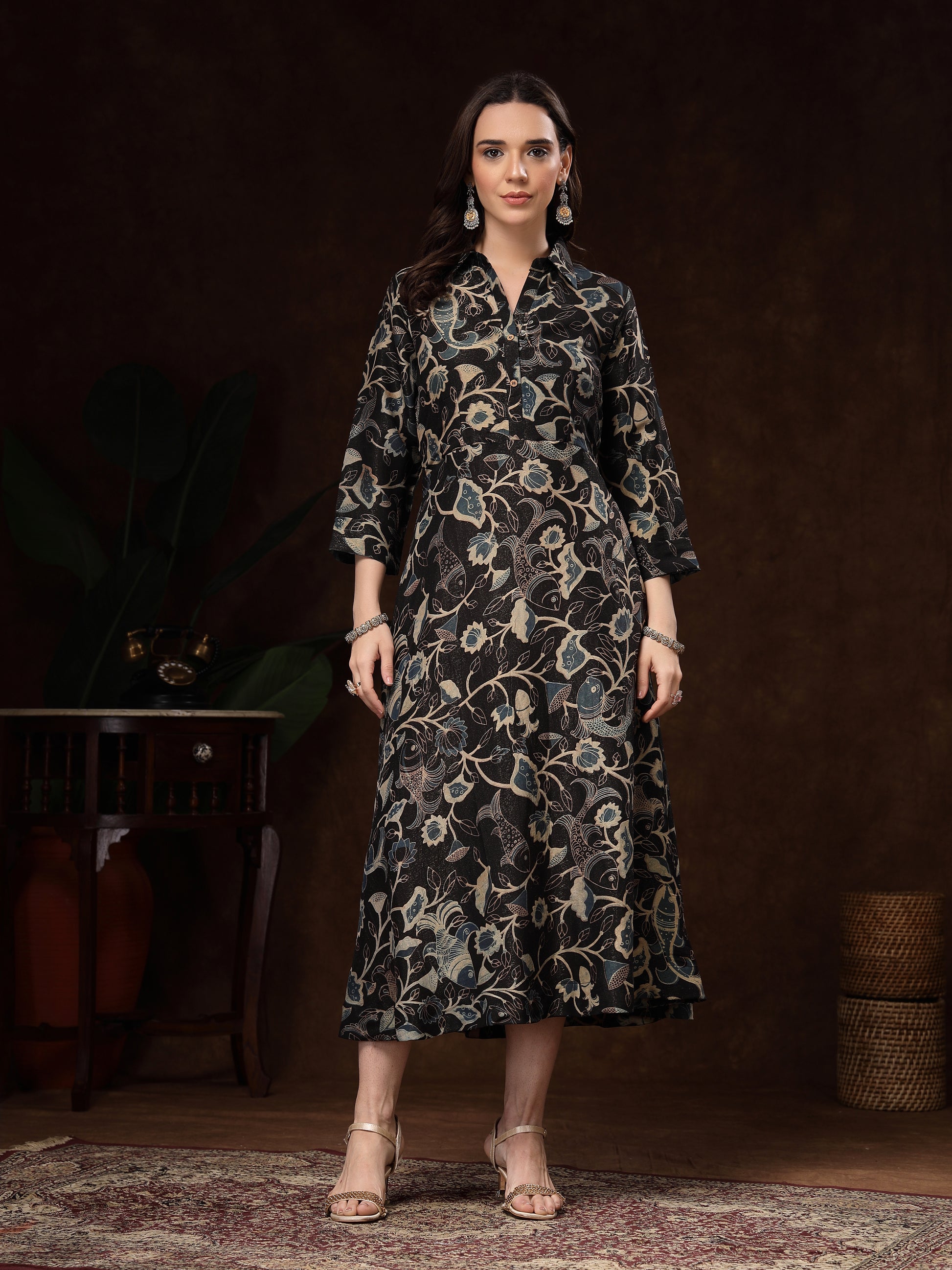 The three-quarter sleeves and collared neckline bring a modern fusion touch, making it perfect for festive gatherings, celebrations, or evening outings. Pair it with statement jewellery and heels to complete the luxurious look.