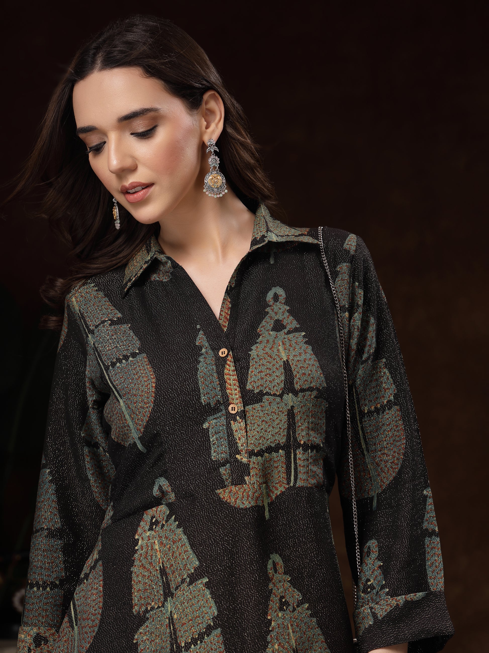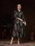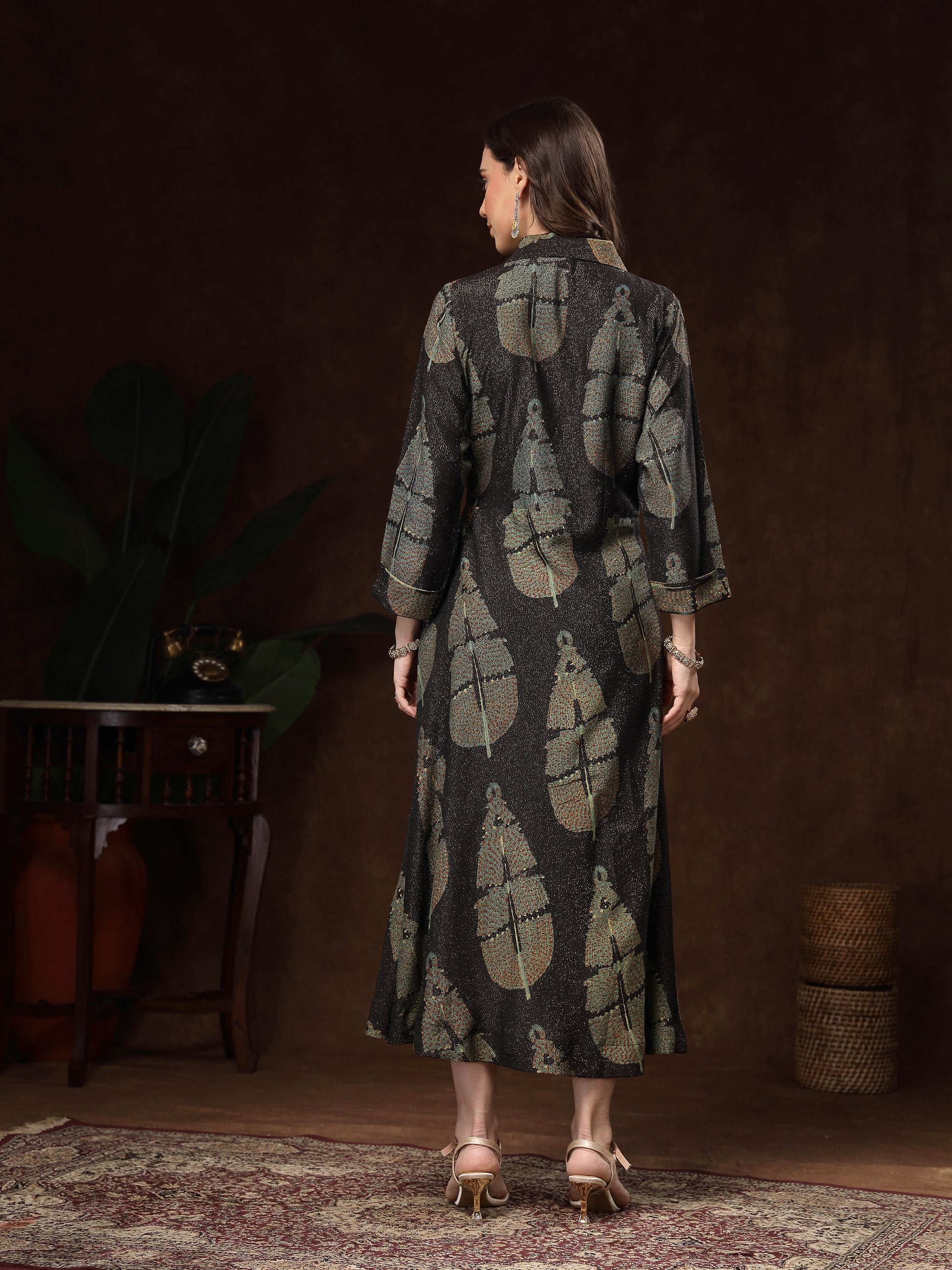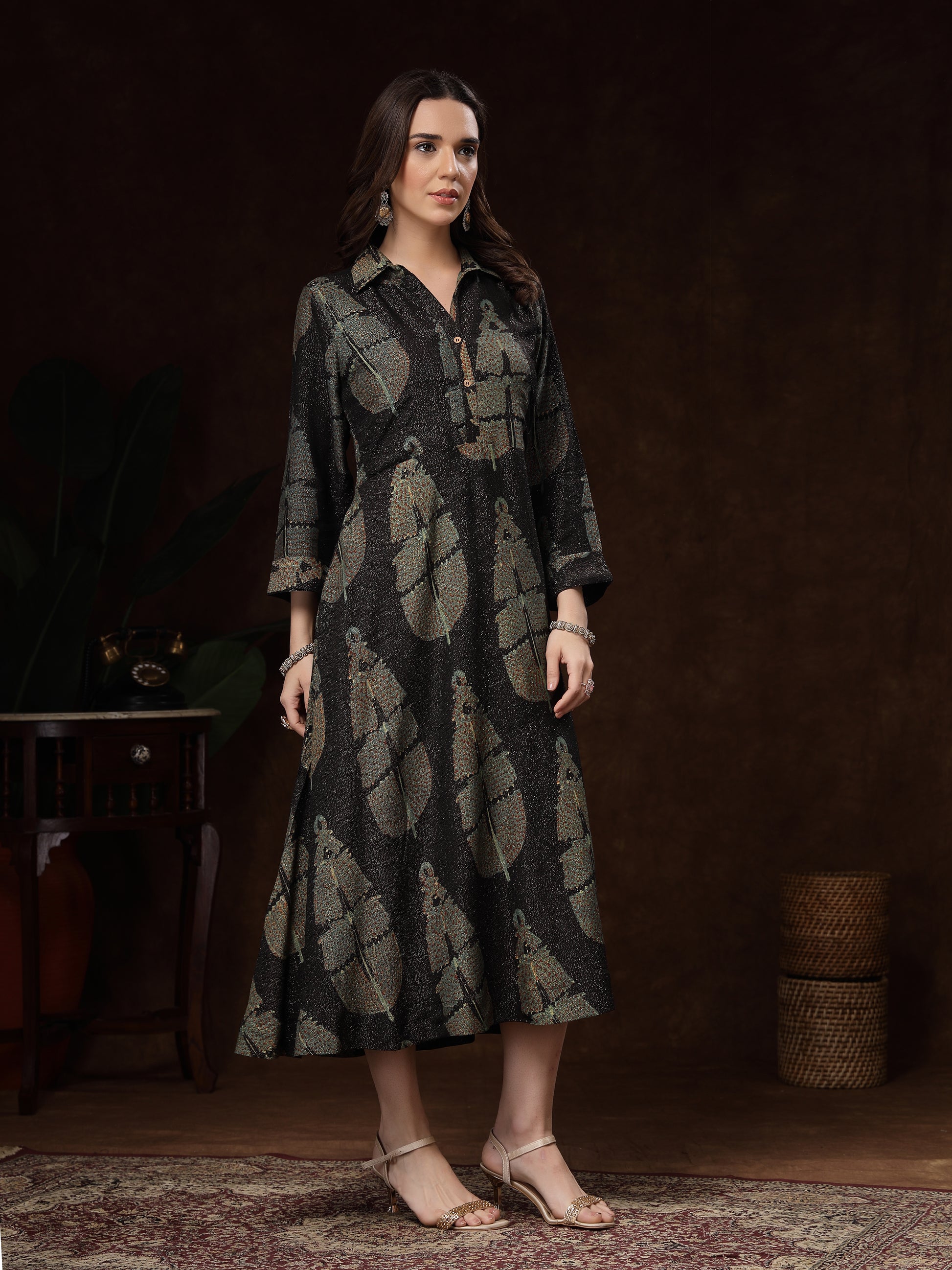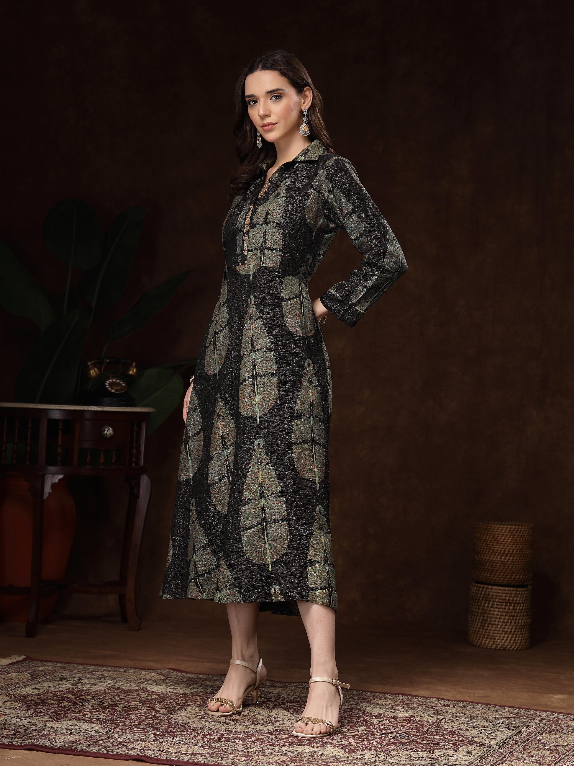The dress comes with a sharp shirt-style collar, 3/4 sleeves, and a subtle button placket that adds a touch of sophistication. Perfect for parties, dinner outings, festive gatherings, or statement everyday wear — this dress gives a refined, premium look without compromising on comfort.