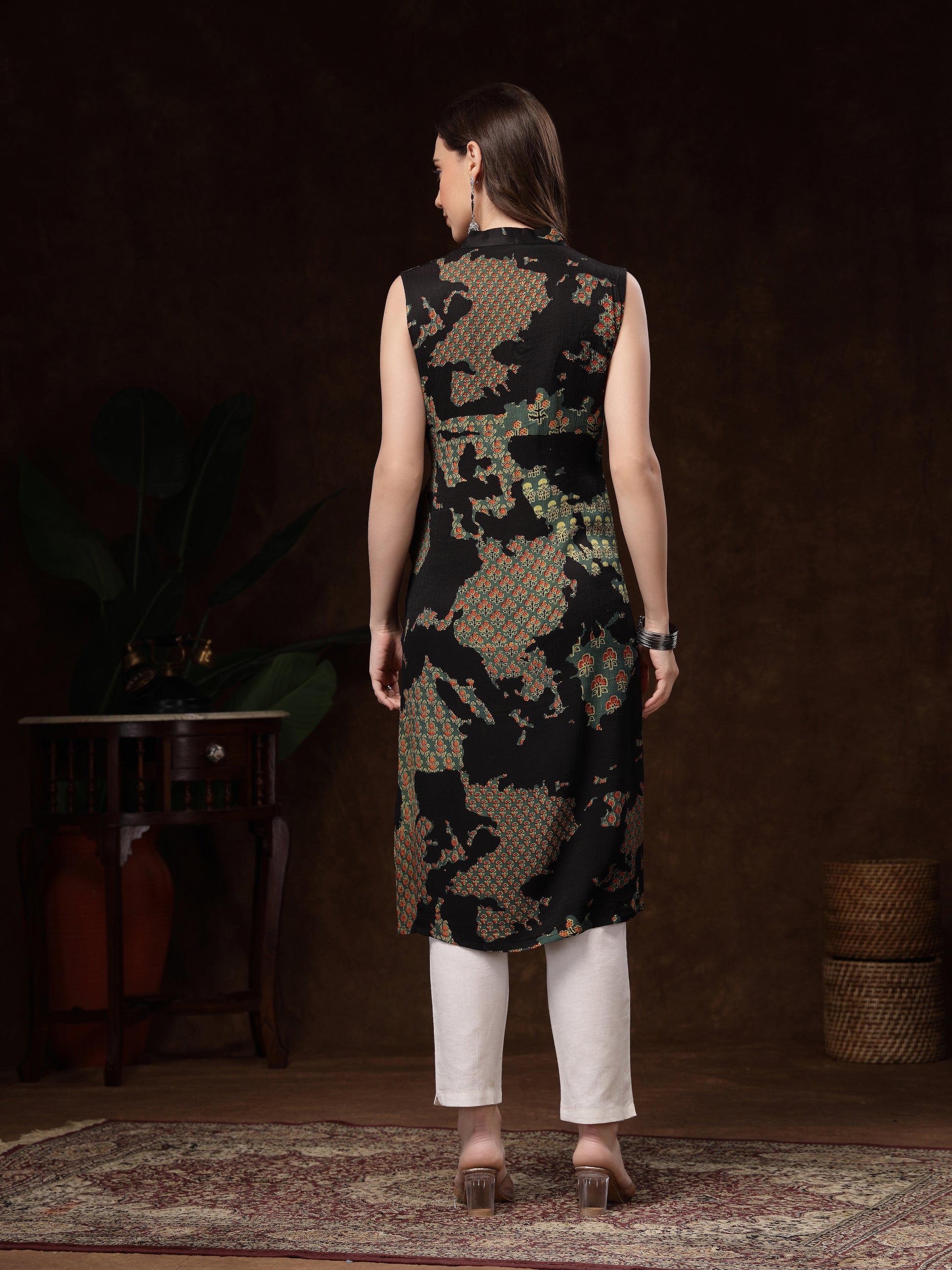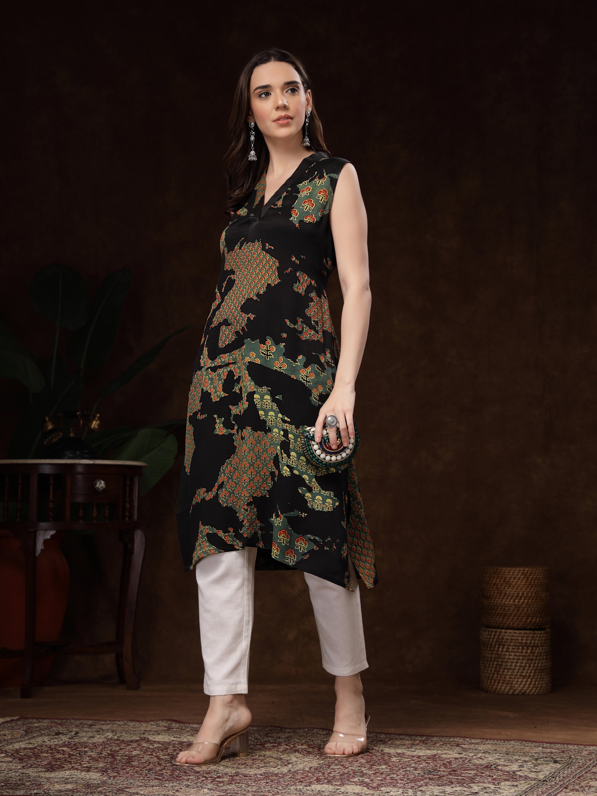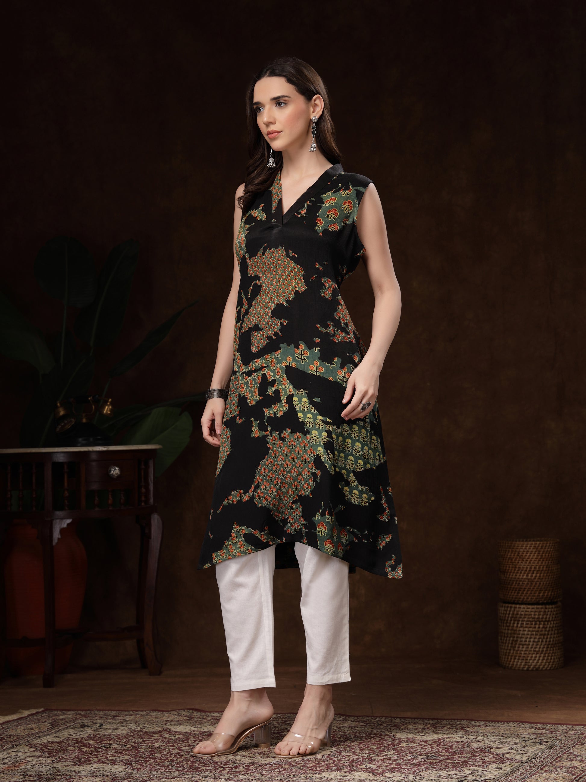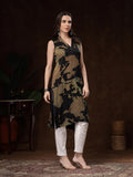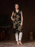 The V-neckline, asymmetric hem, and relaxed straight fit add a modern silhouette, making it perfect for both everyday wear and special outings. Paired best with white or beige bottoms, this kurti brings a touch of sophistication to your wardrobe with minimal effort.