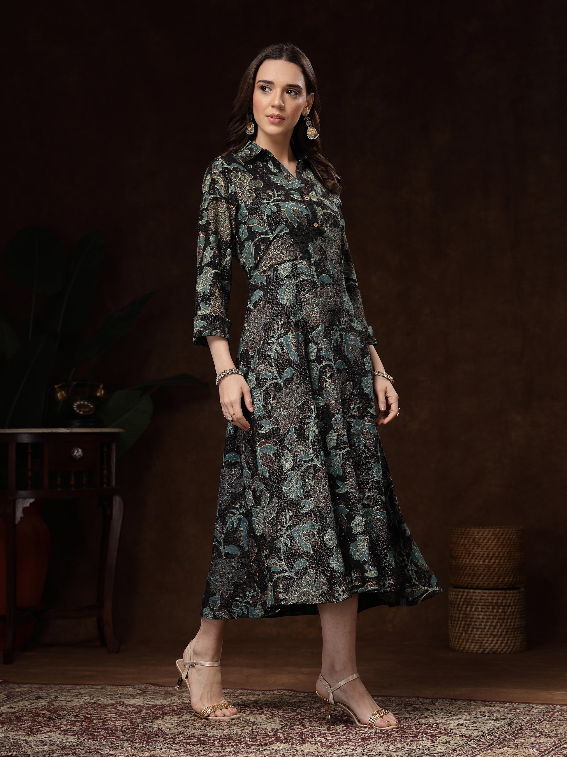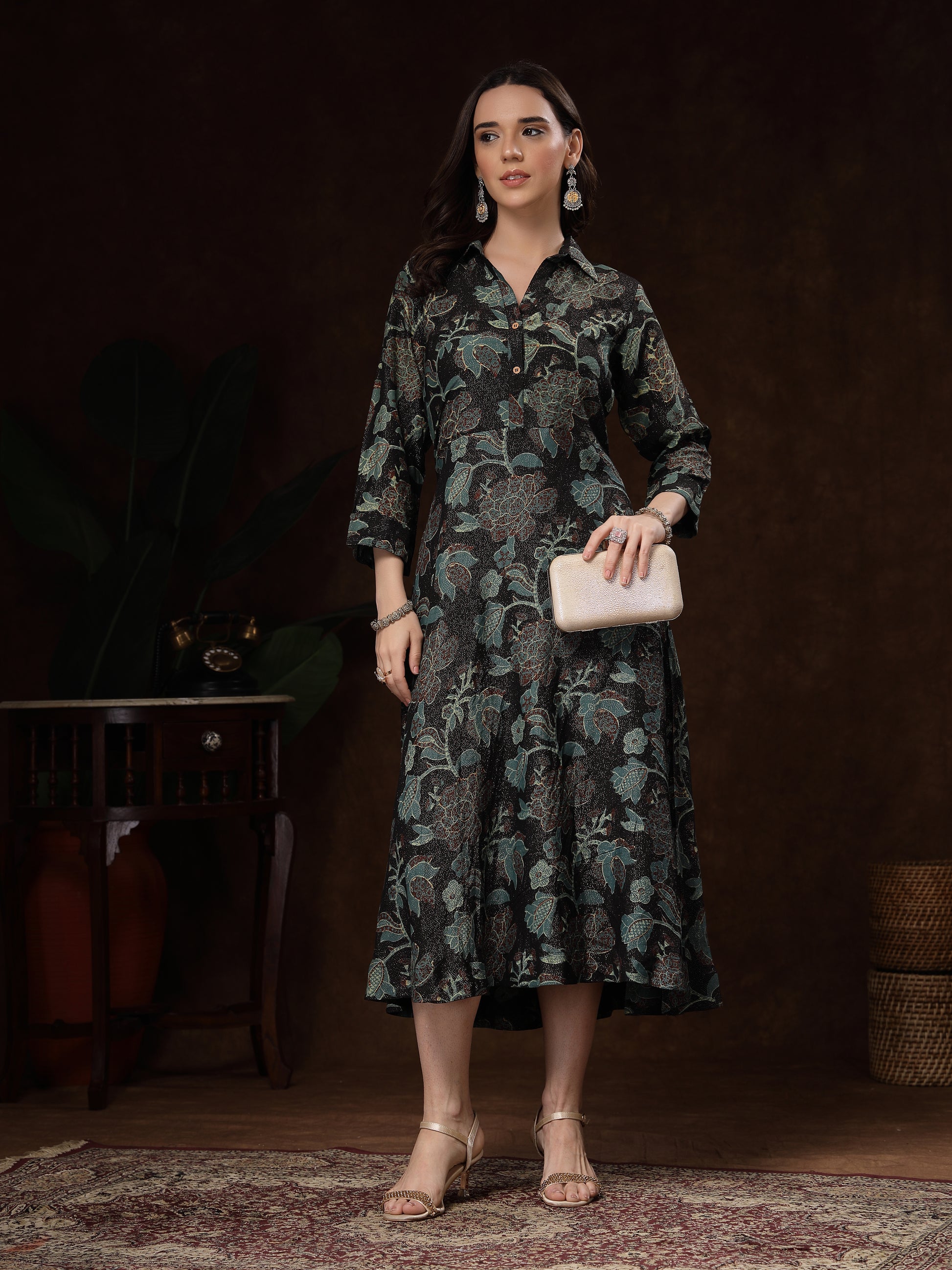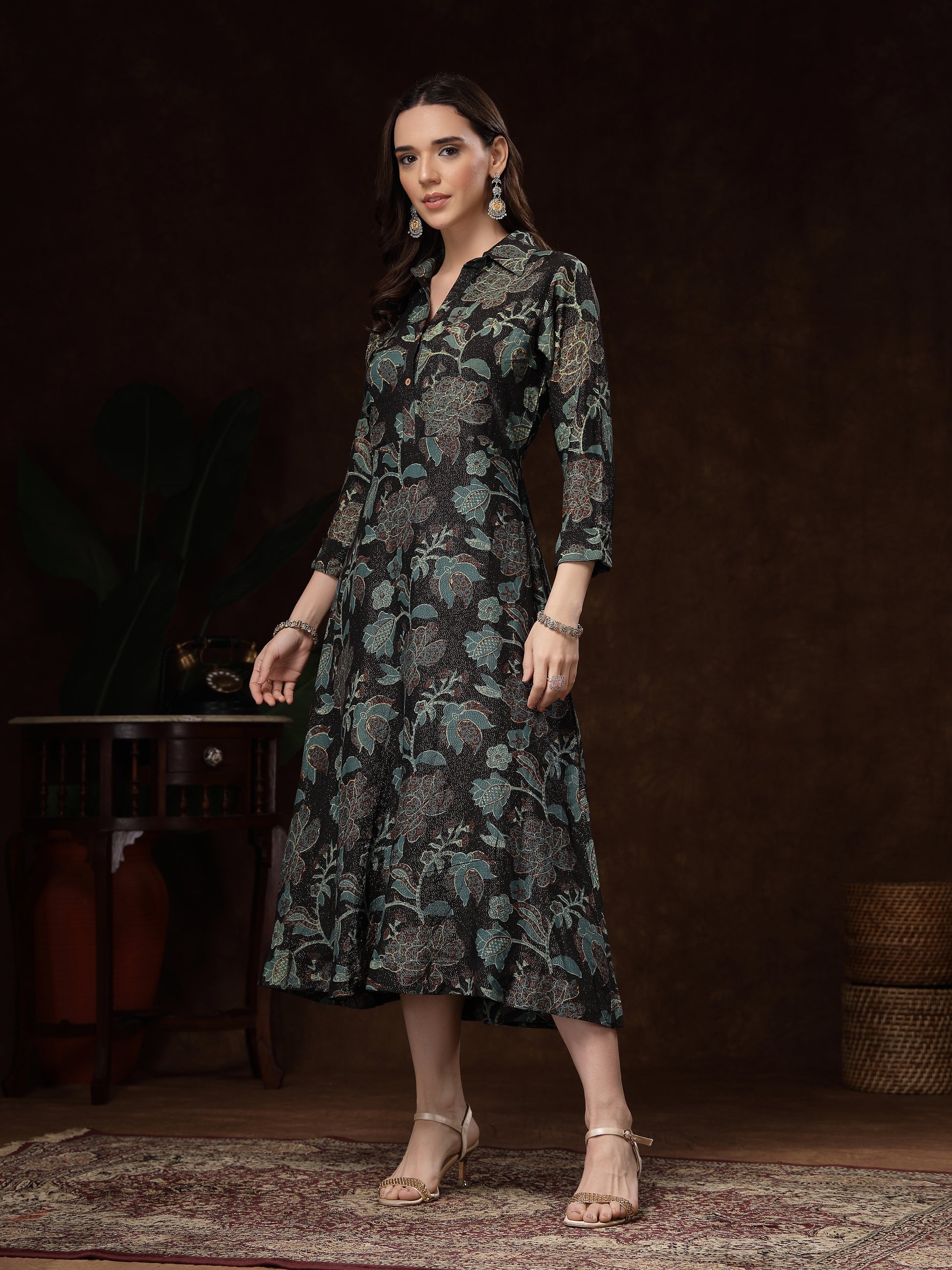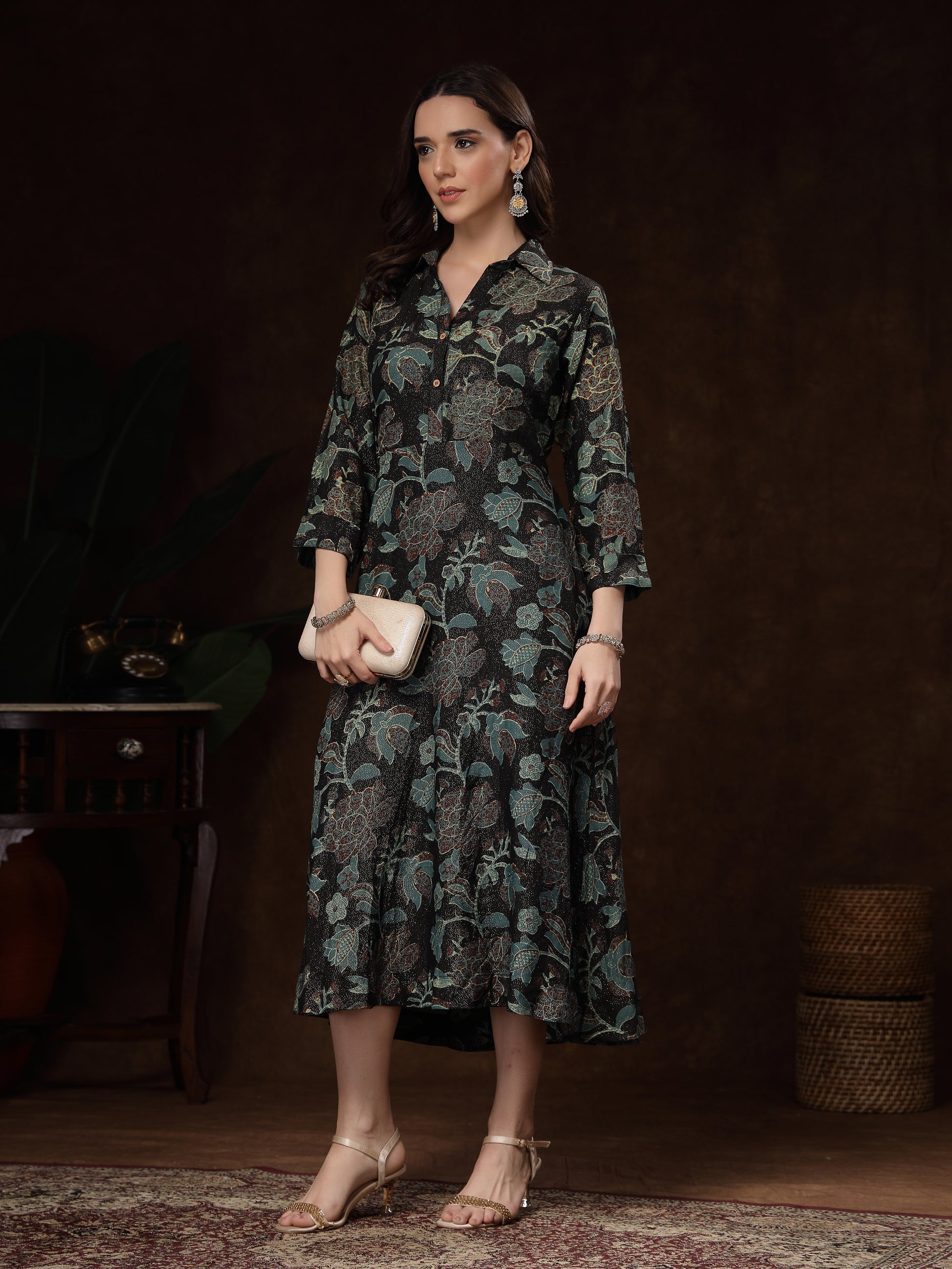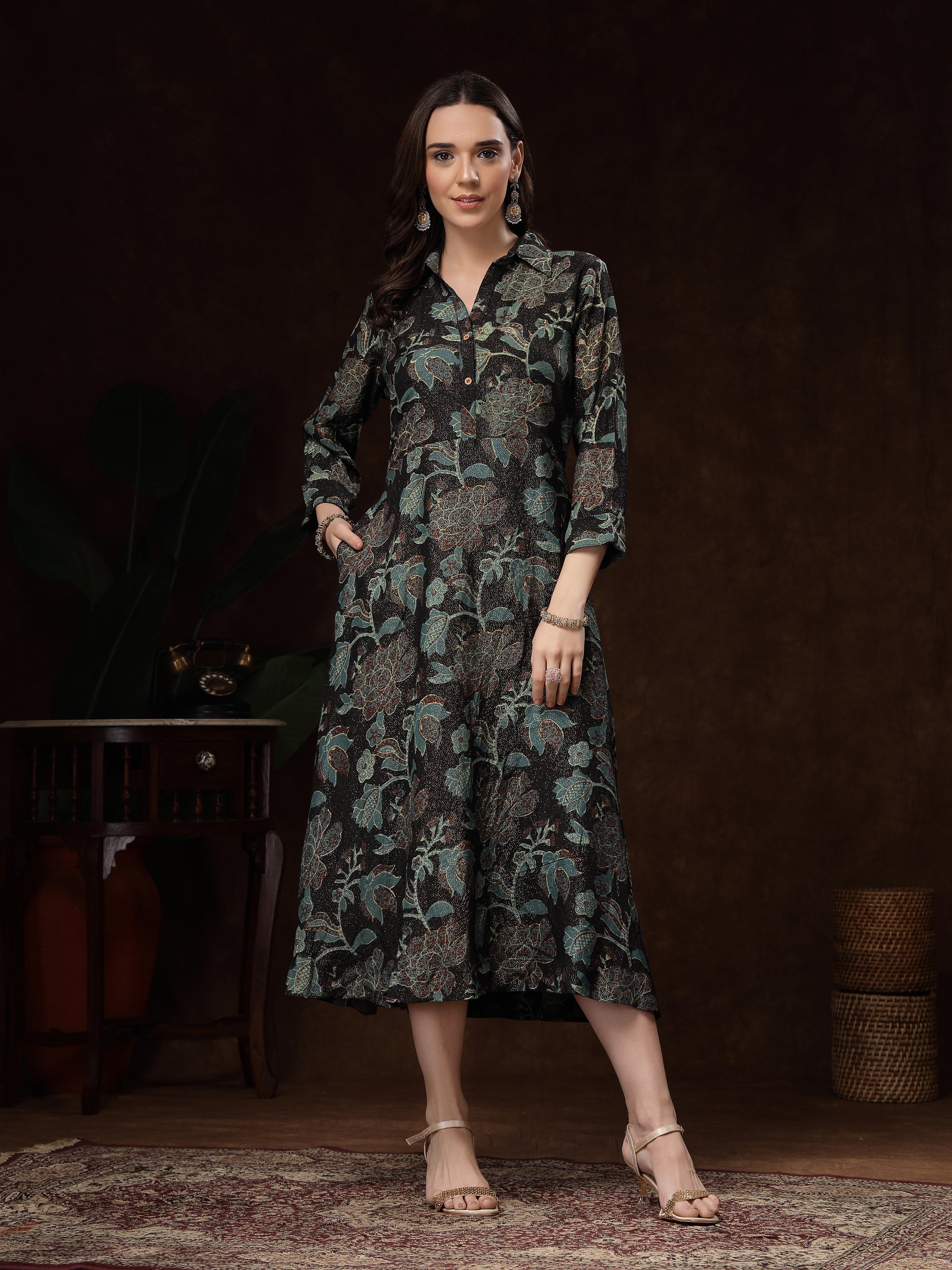 The stand collar and button-down placket add a classic touch, while the three-quarter sleeves and side pockets make it practical and stylish. Perfect for brunch outings, festive gatherings, office wear, or evening dinners—this dress effortlessly blends comfort, luxury, and chic style.