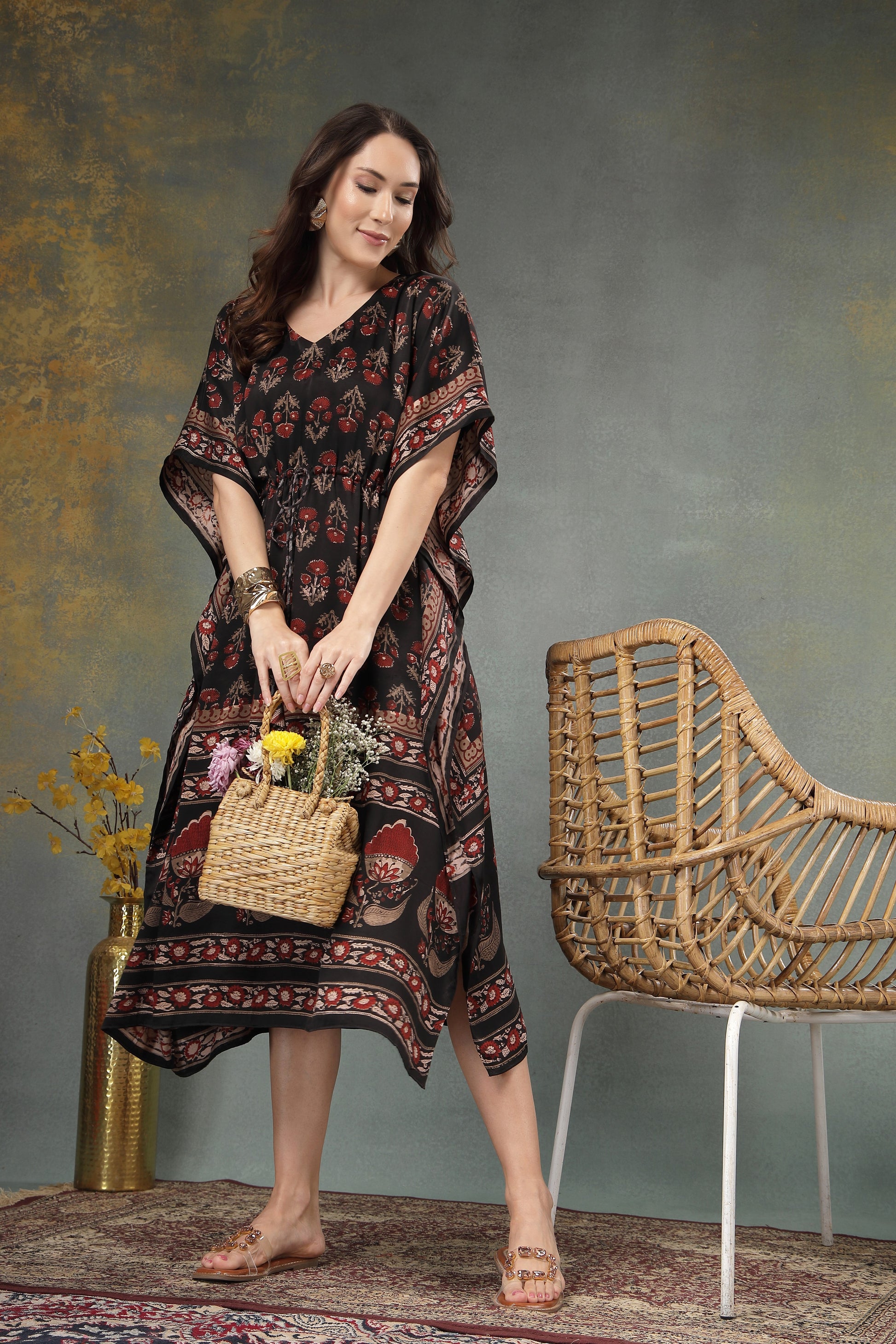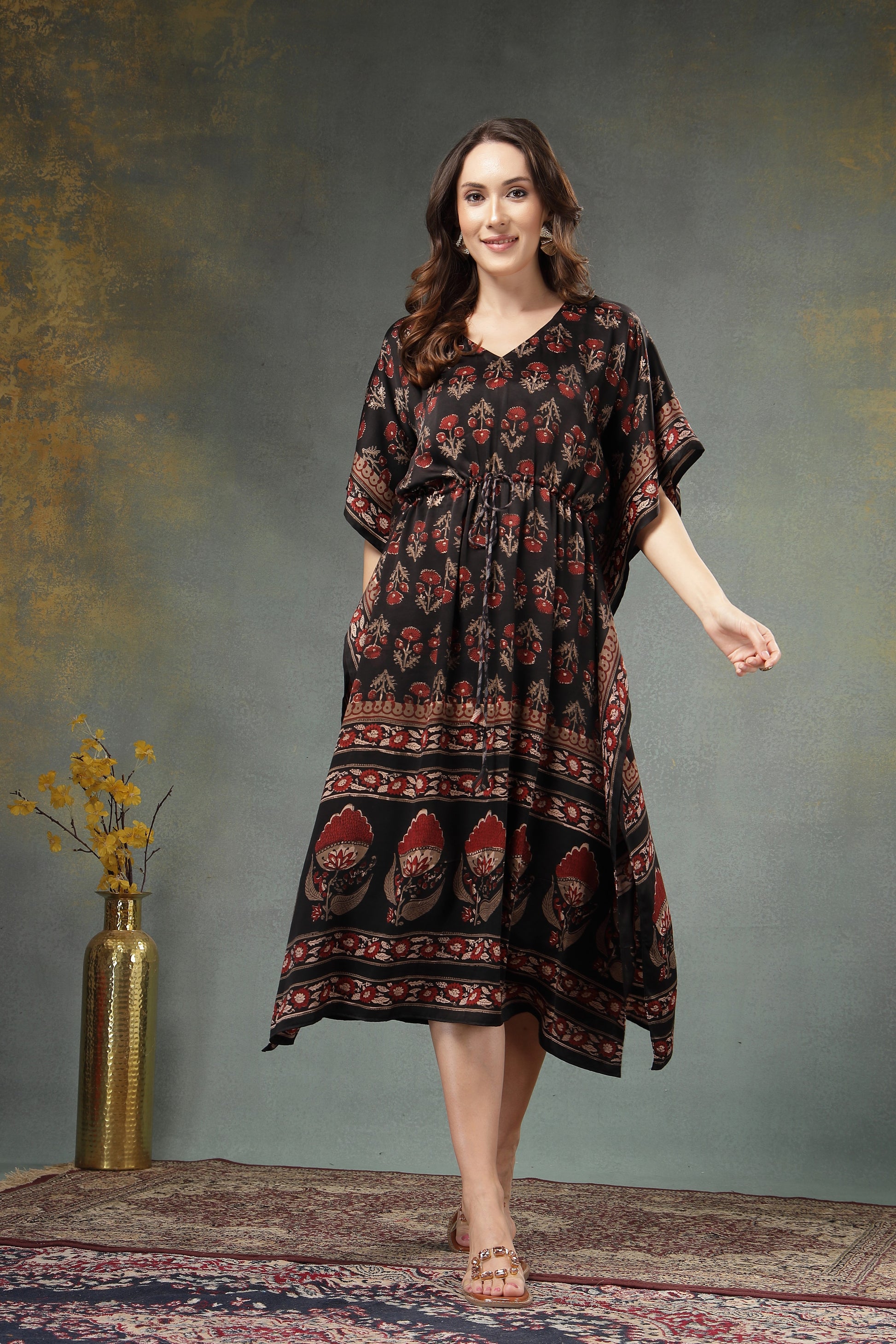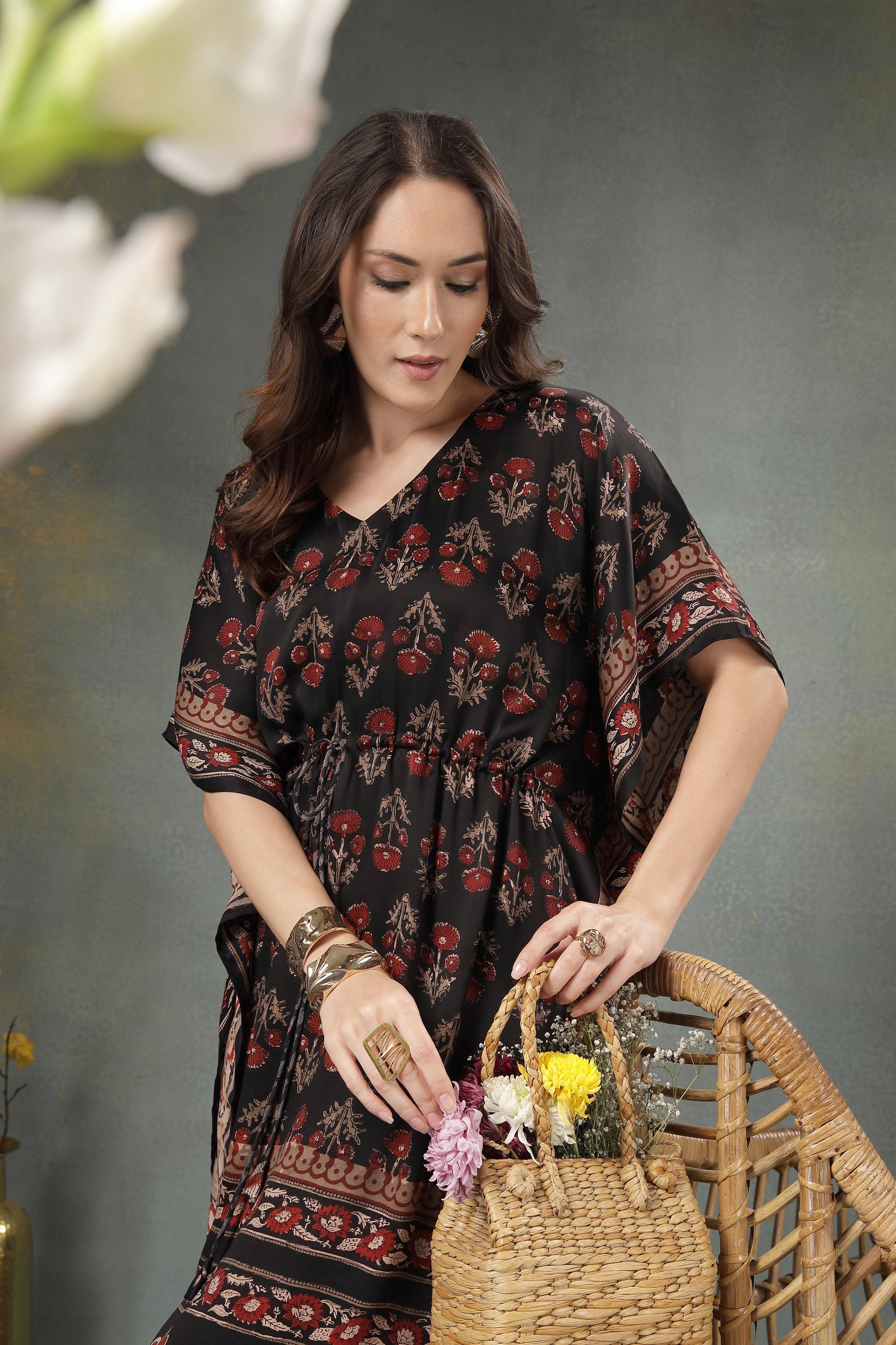 Elevate your everyday style with this elegant Modal Satin Kaftan, crafted for comfort and effortless grace. The silky-smooth modal satin fabric drapes beautifully, offering a soft feel and subtle sheen. Featuring a timeless floral print with rich border detailing, this kaftan is designed with a flattering V-neckline and an adjustable drawstring waist for a relaxed yet defined fit. Perfect for casual wear, resort outings, and relaxed festive occasions, this kaftan blends comfort with understated sophistication.