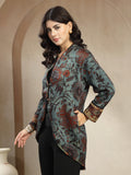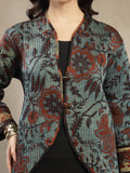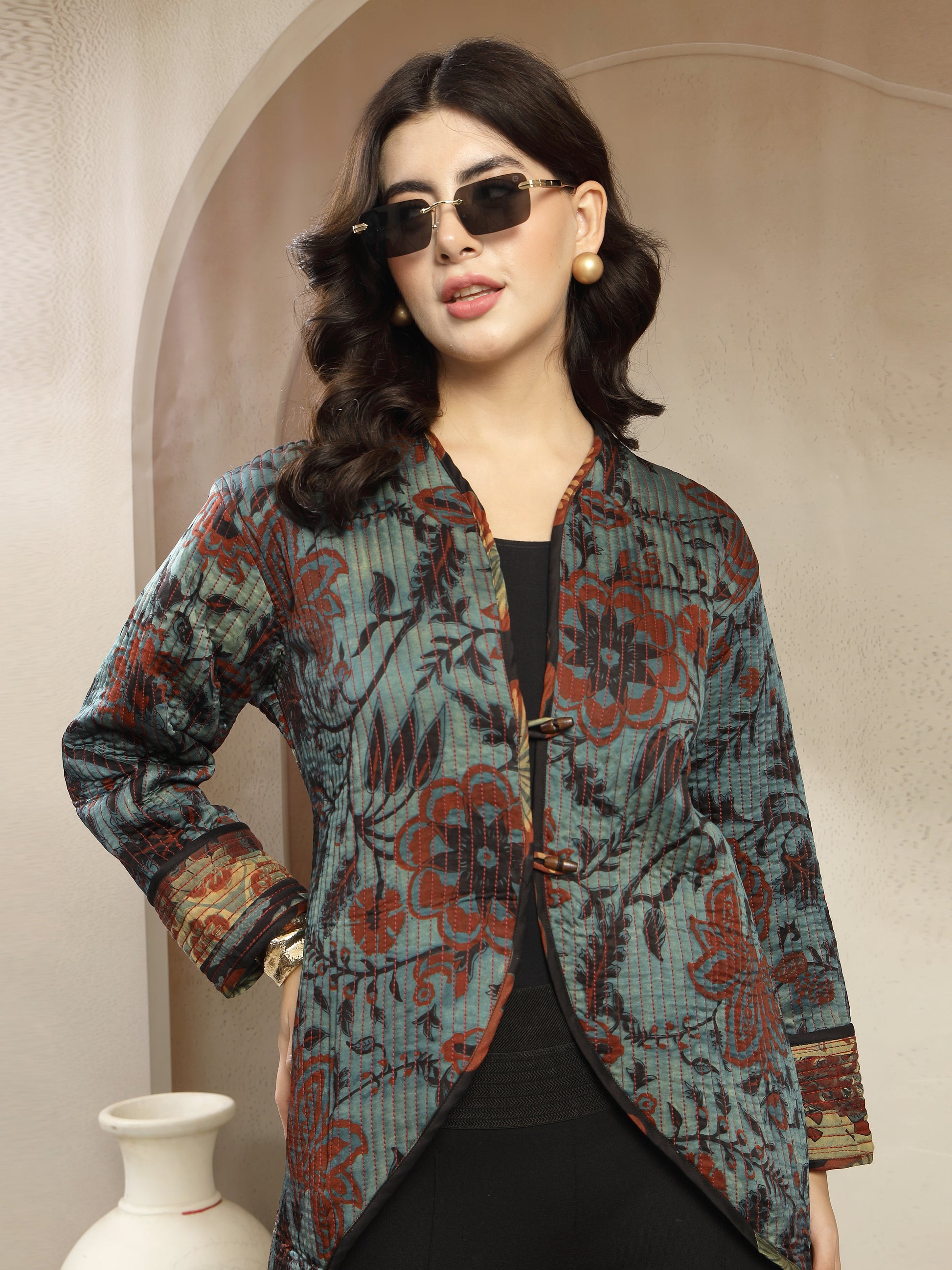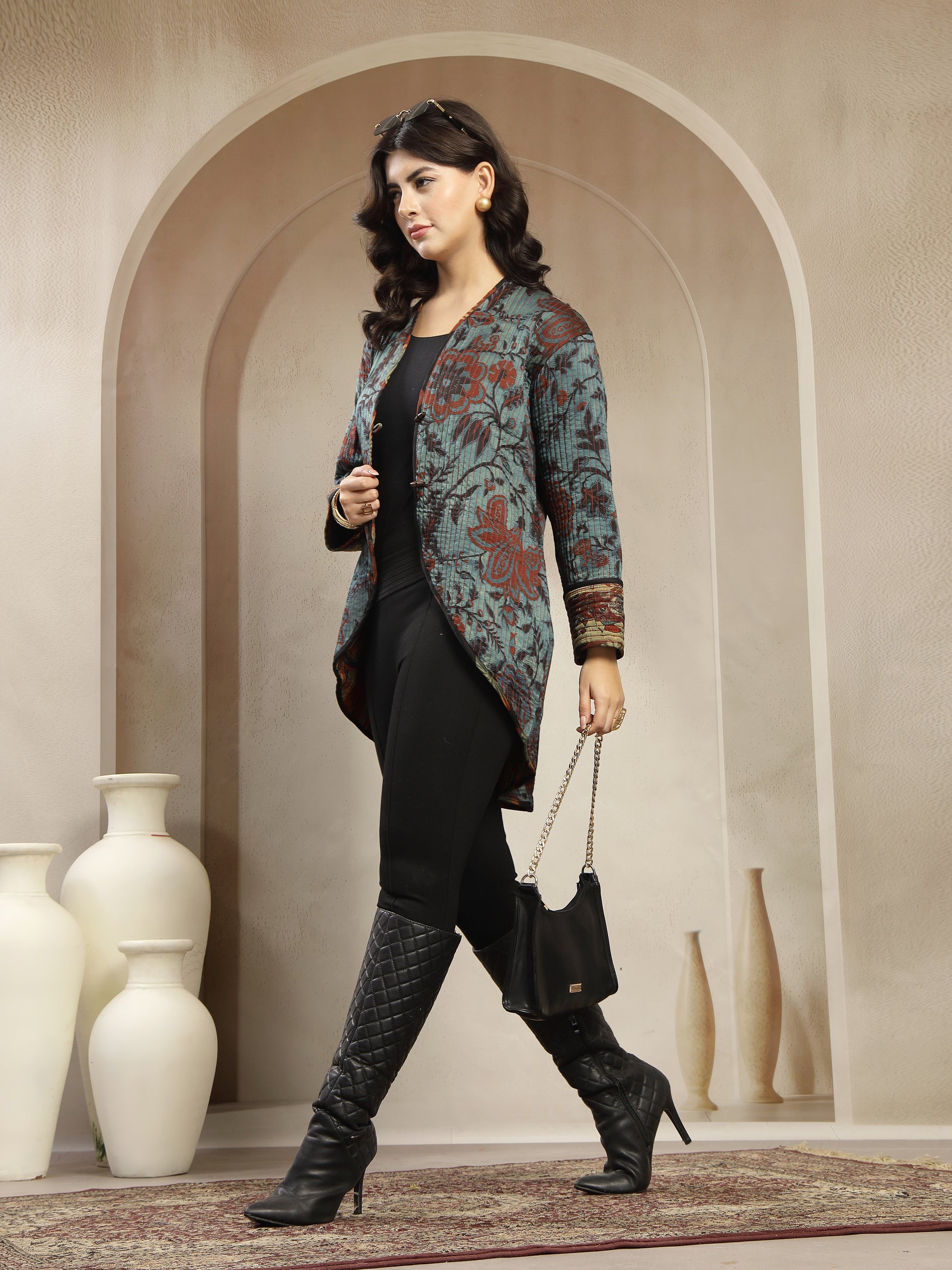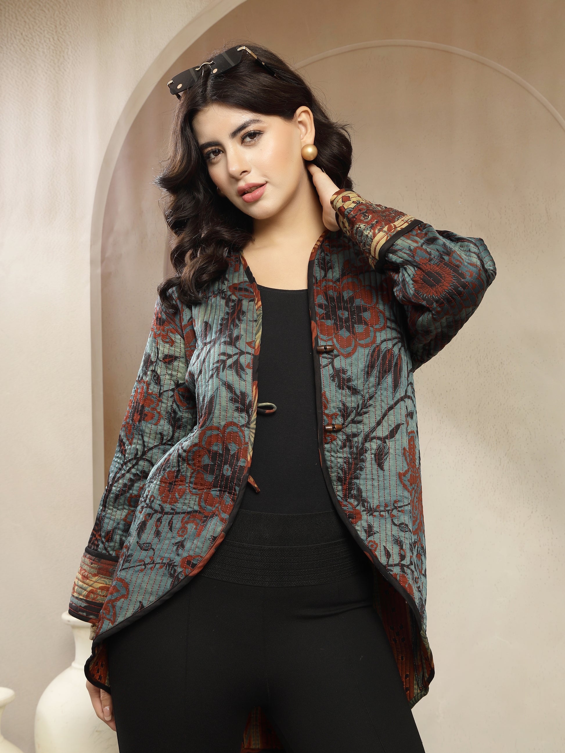 Elevate your wardrobe with this elegant floral jacquard long jacket, designed to blend sophistication with everyday comfort. Crafted from a rich, textured fabric featuring a stunning blend of teal, black, and deep rust floral motifs, this jacket instantly adds a touch of artistry to any outfit.