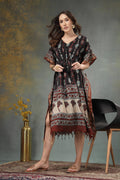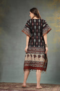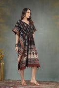 The sophisticated all-over ethnic-inspired print, complemented by a contrast border and delicate tassel detailing at the hem, adds a refined artisanal touch. A flattering V-neckline and adjustable waist tie enhance the silhouette while maintaining a relaxed, flowy fit.
