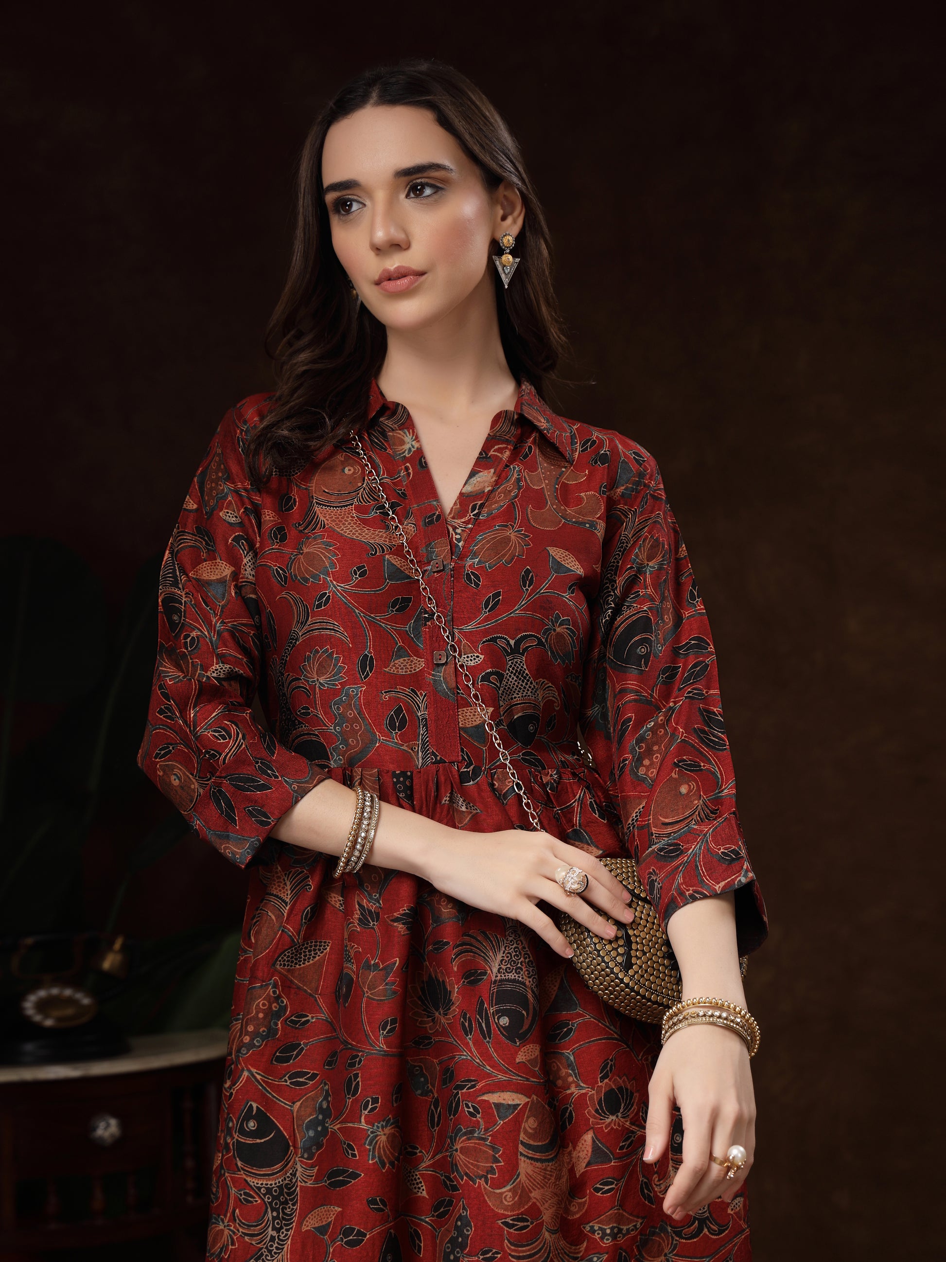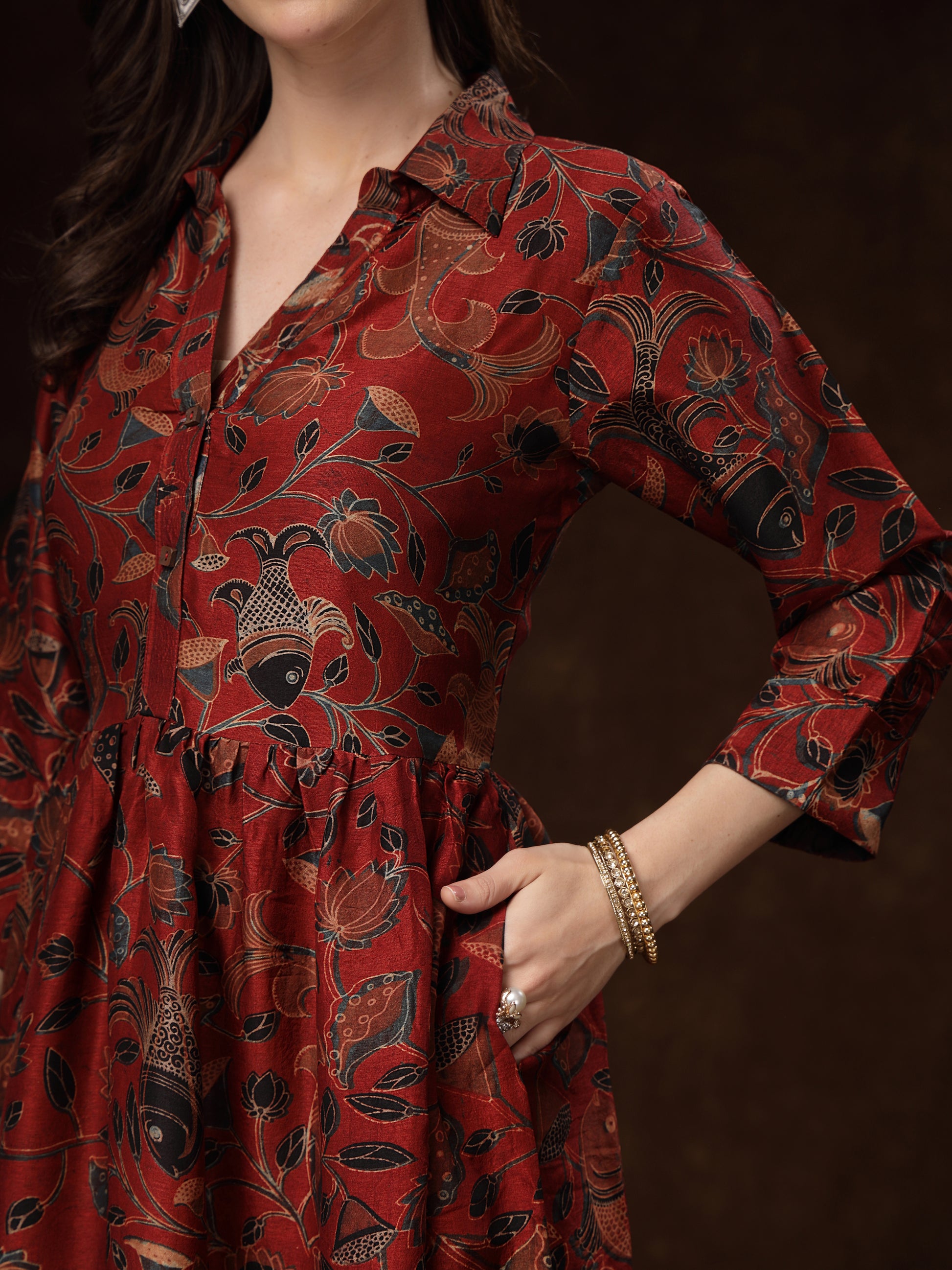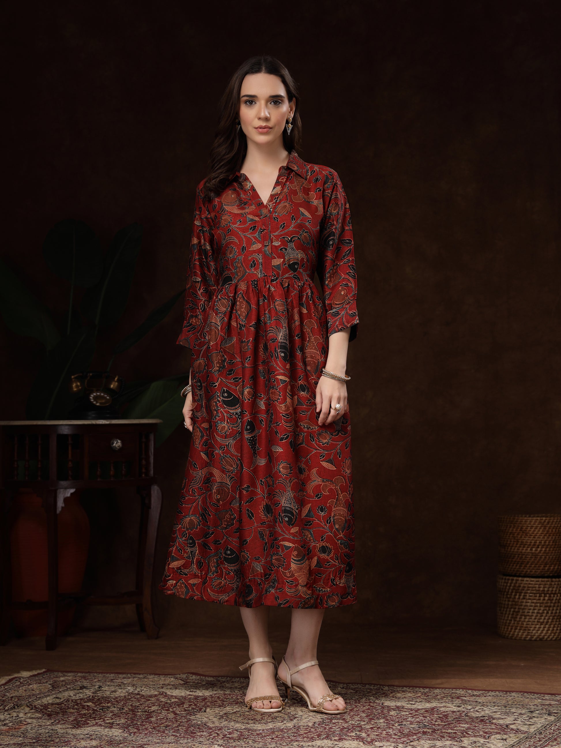 The soft, breathable satin drapes elegantly, while the gathered waist adds a flattering flow to the silhouette. A classic shirt collar, button-down front, and 3/4th sleeves give it a sophisticated yet relaxed charm. Whether you're attending festive gatherings, casual brunches, or cultural events, this piece offers effortless style with a touch of heritage.