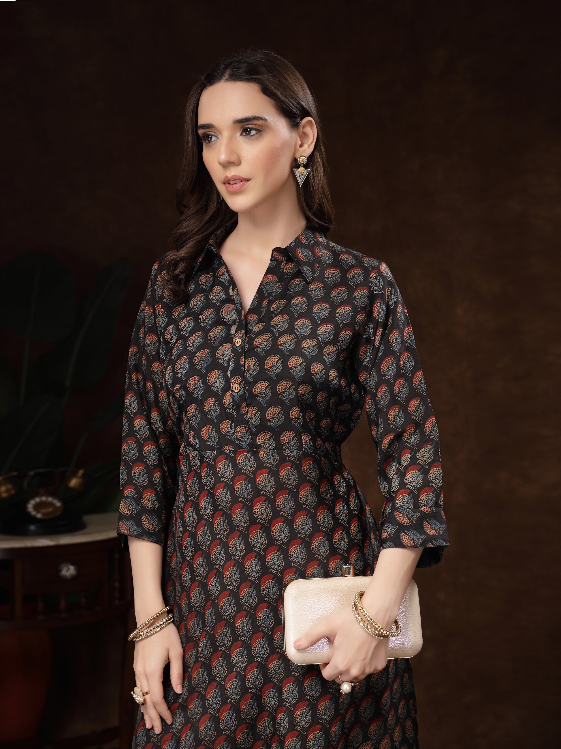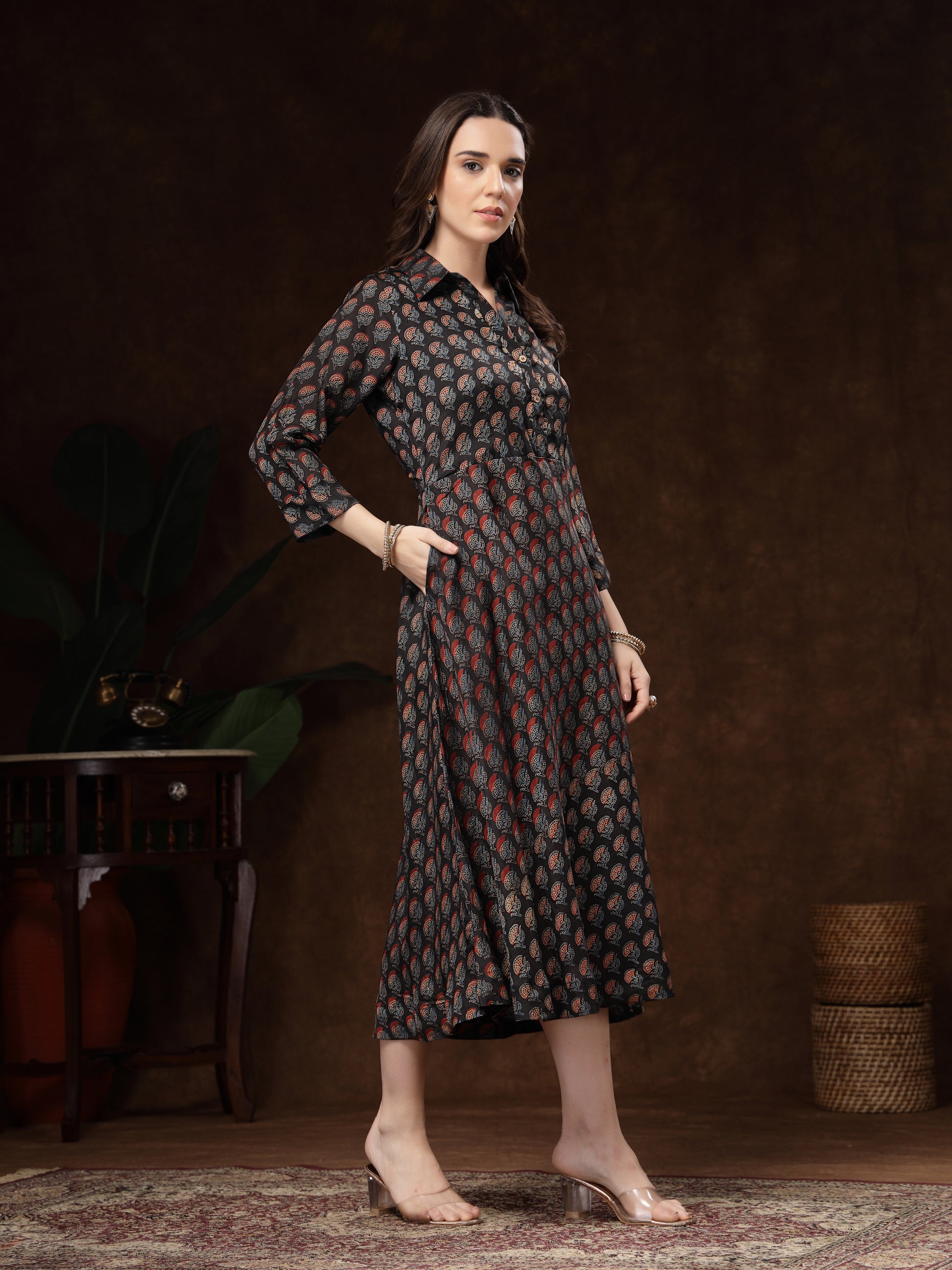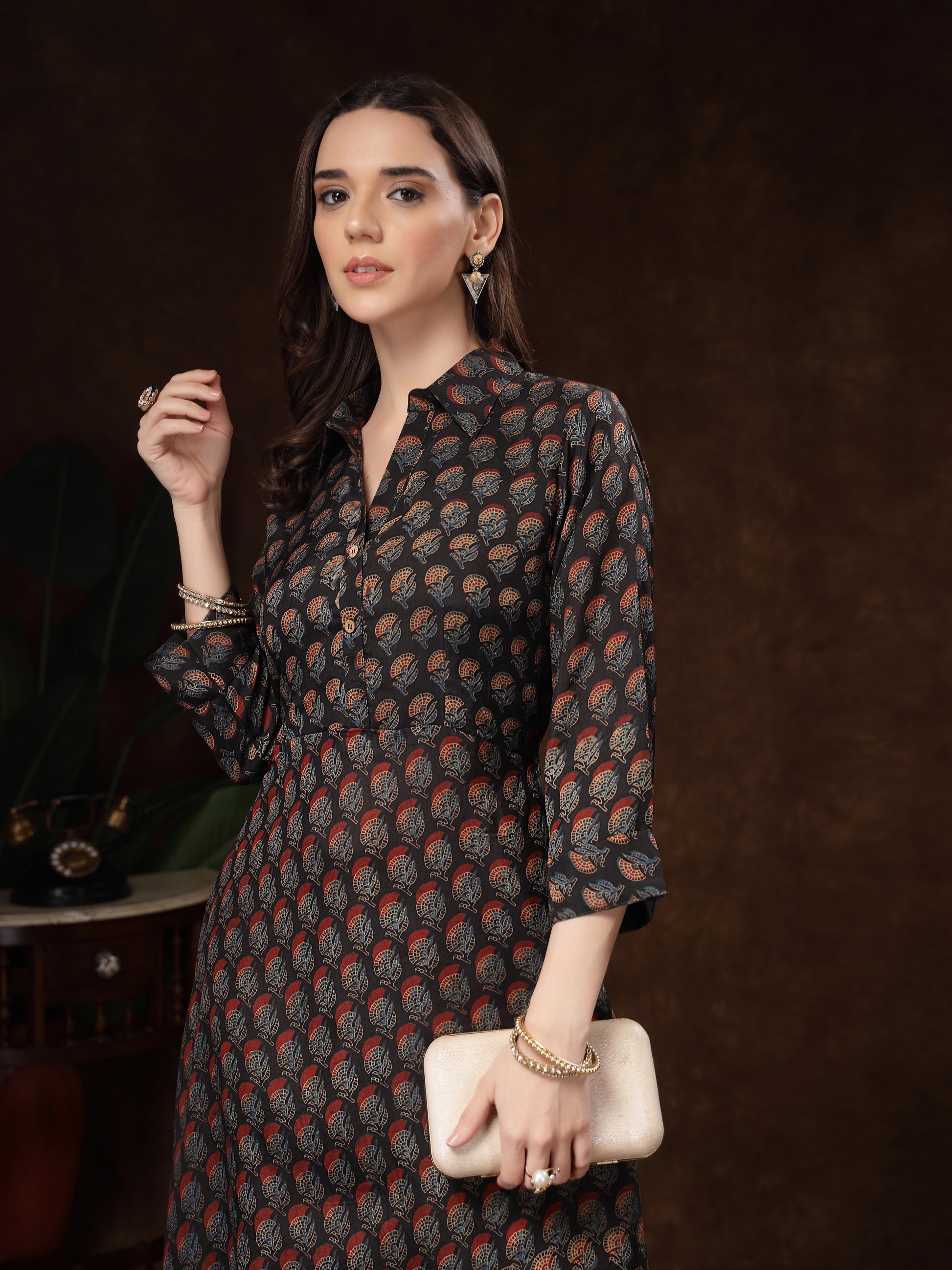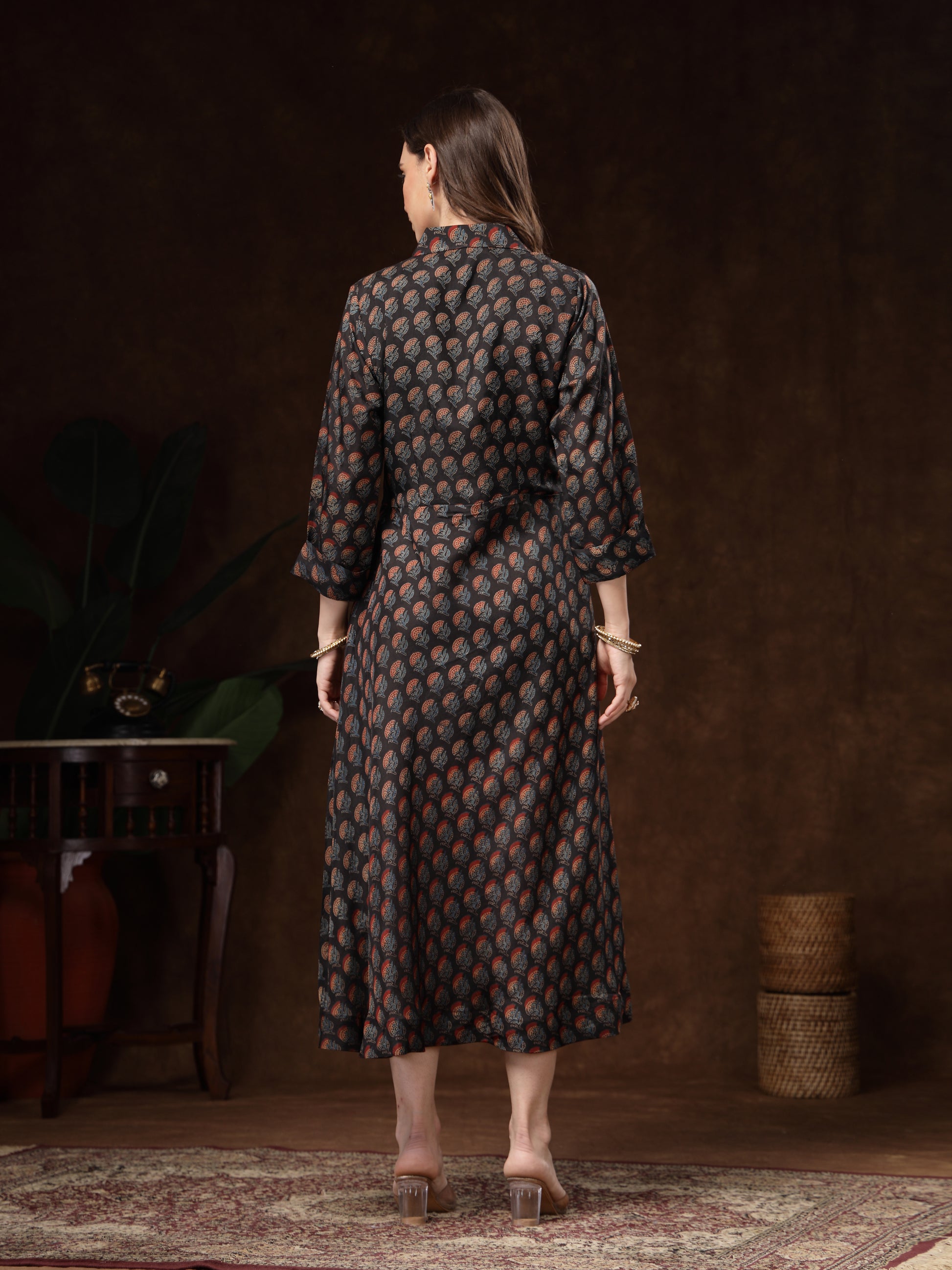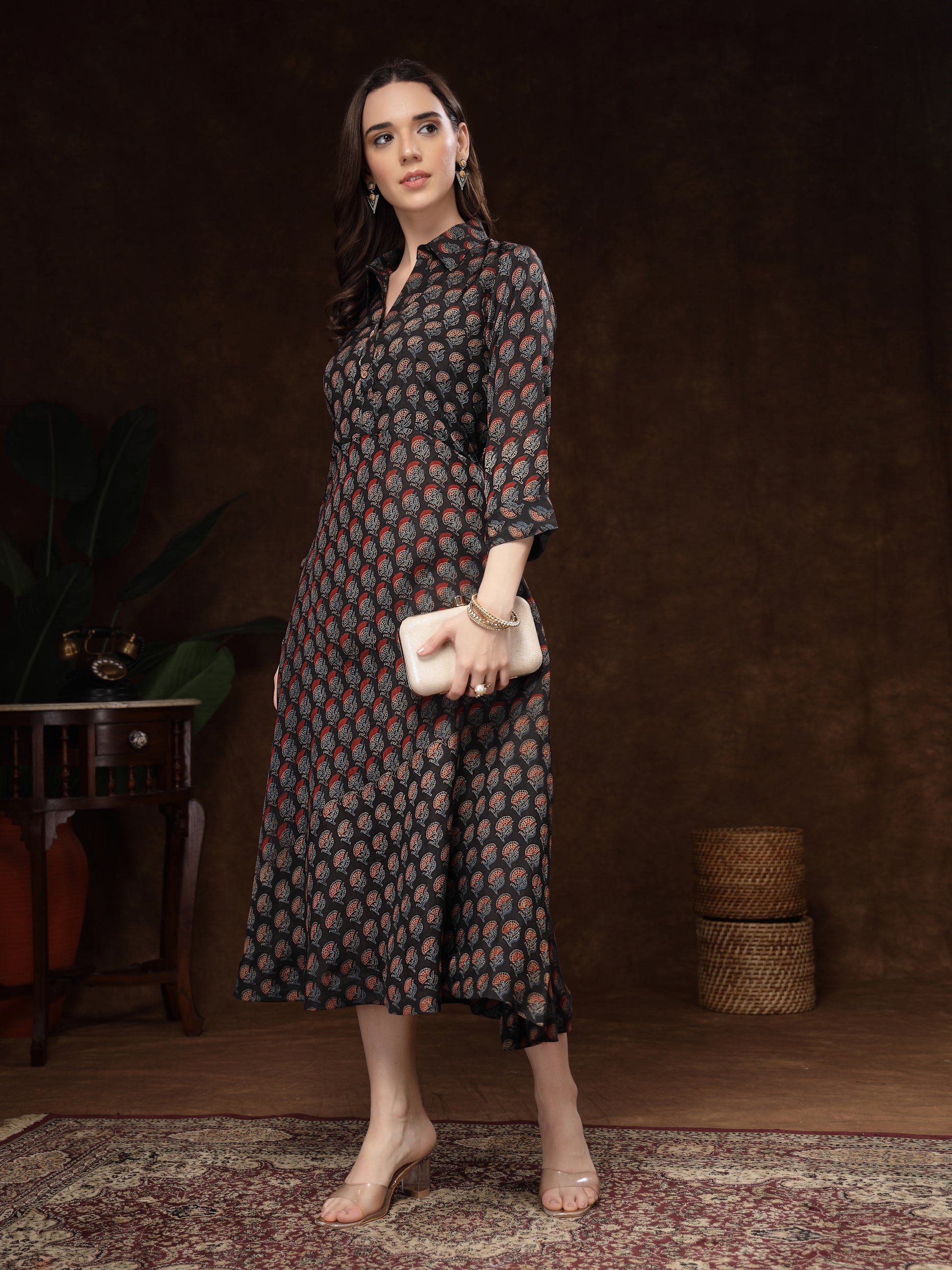Color: Black base with multi-tone prints (rust, beige, blue)
