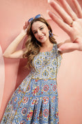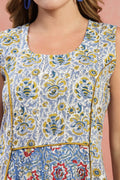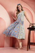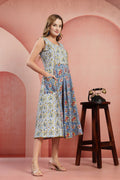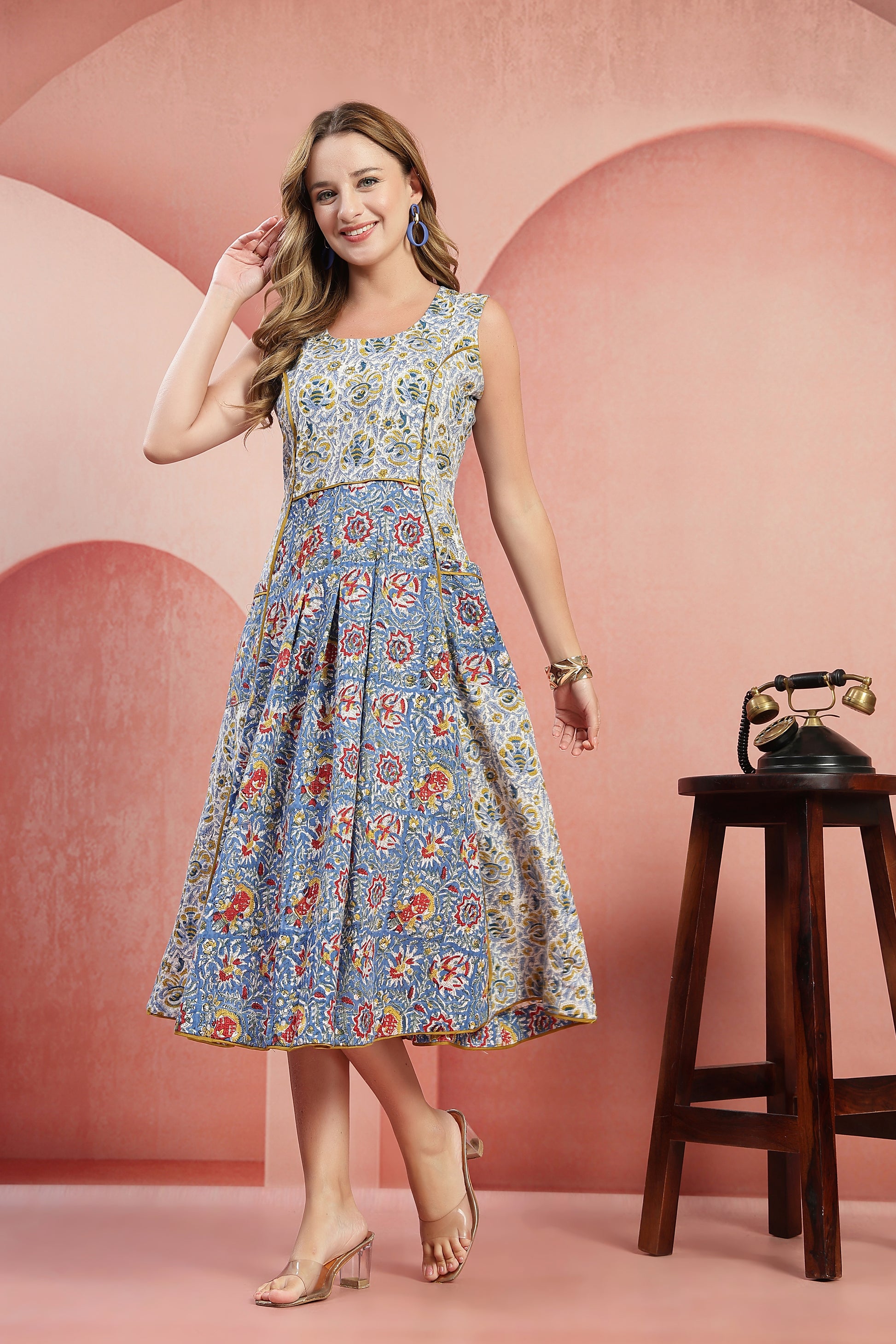Step into effortless elegance with our Hand-Printed Paneled Cotton Midi Dress. This unique piece features a sophisticated multi-panel construction that artfully blends complementary botanical and geometric motifs. Designed with a flattering sleeveless bodice and a gracefully pleated skirt, this dress offers a timeless silhouette that moves beautifully with you.