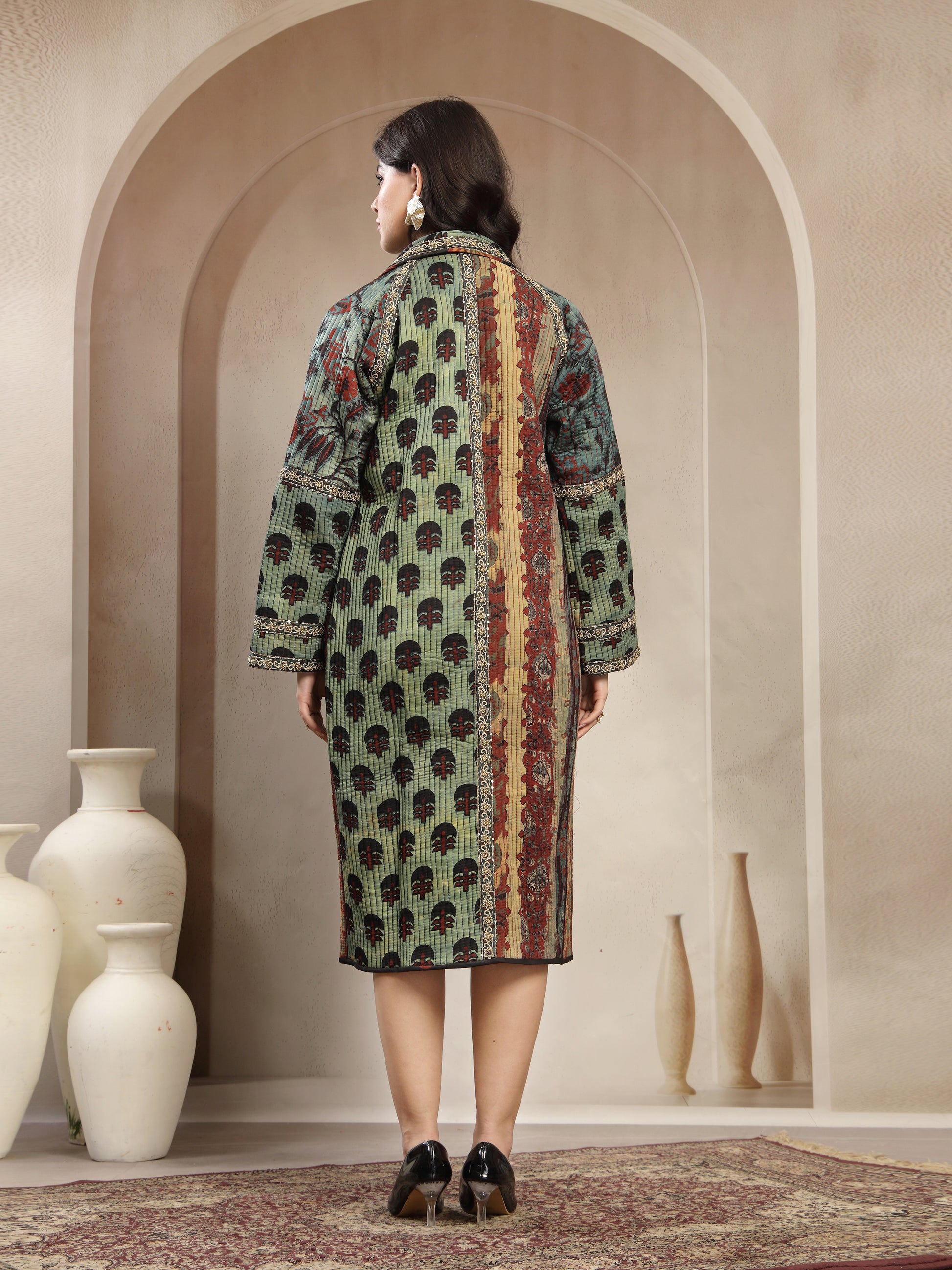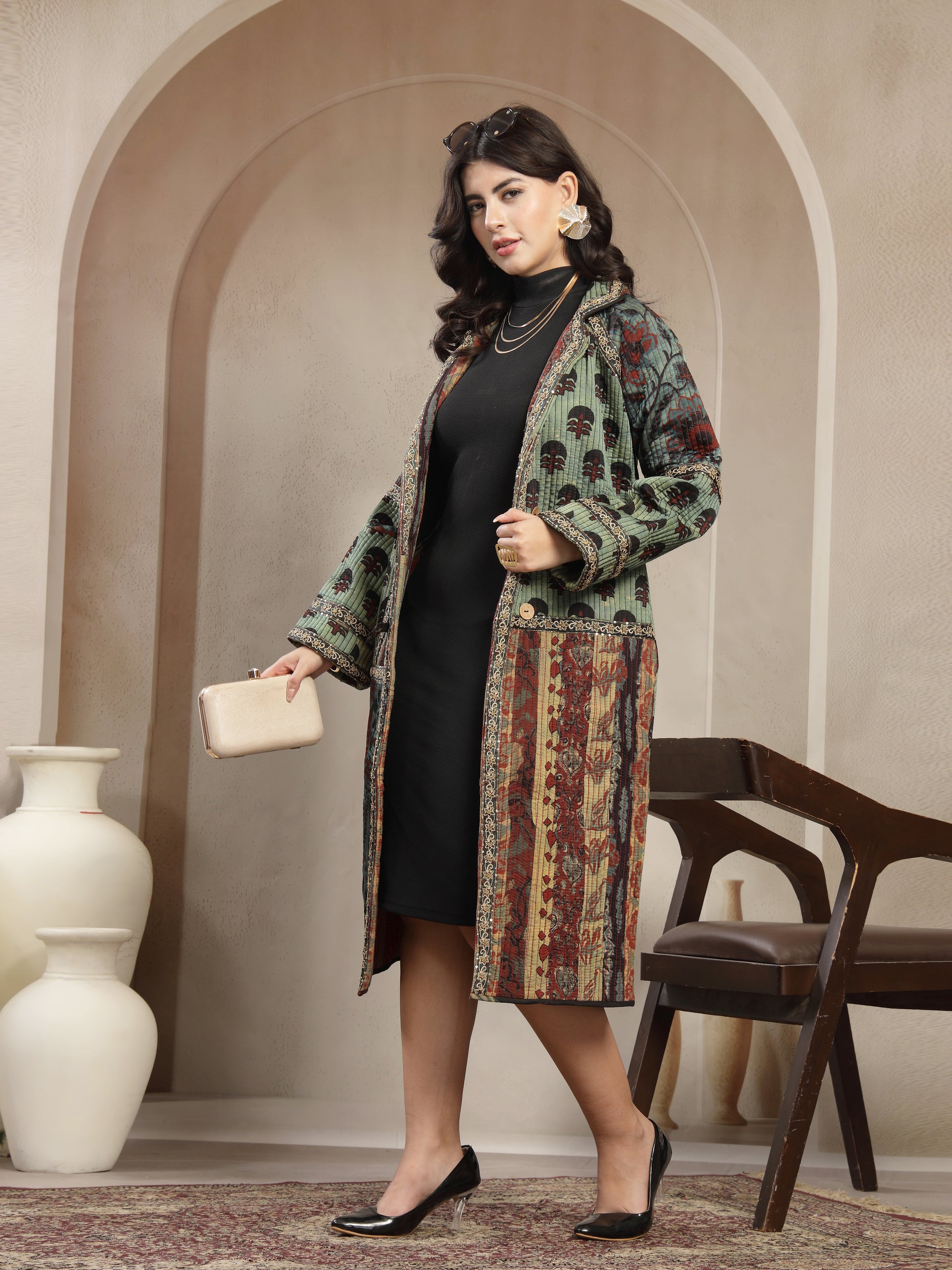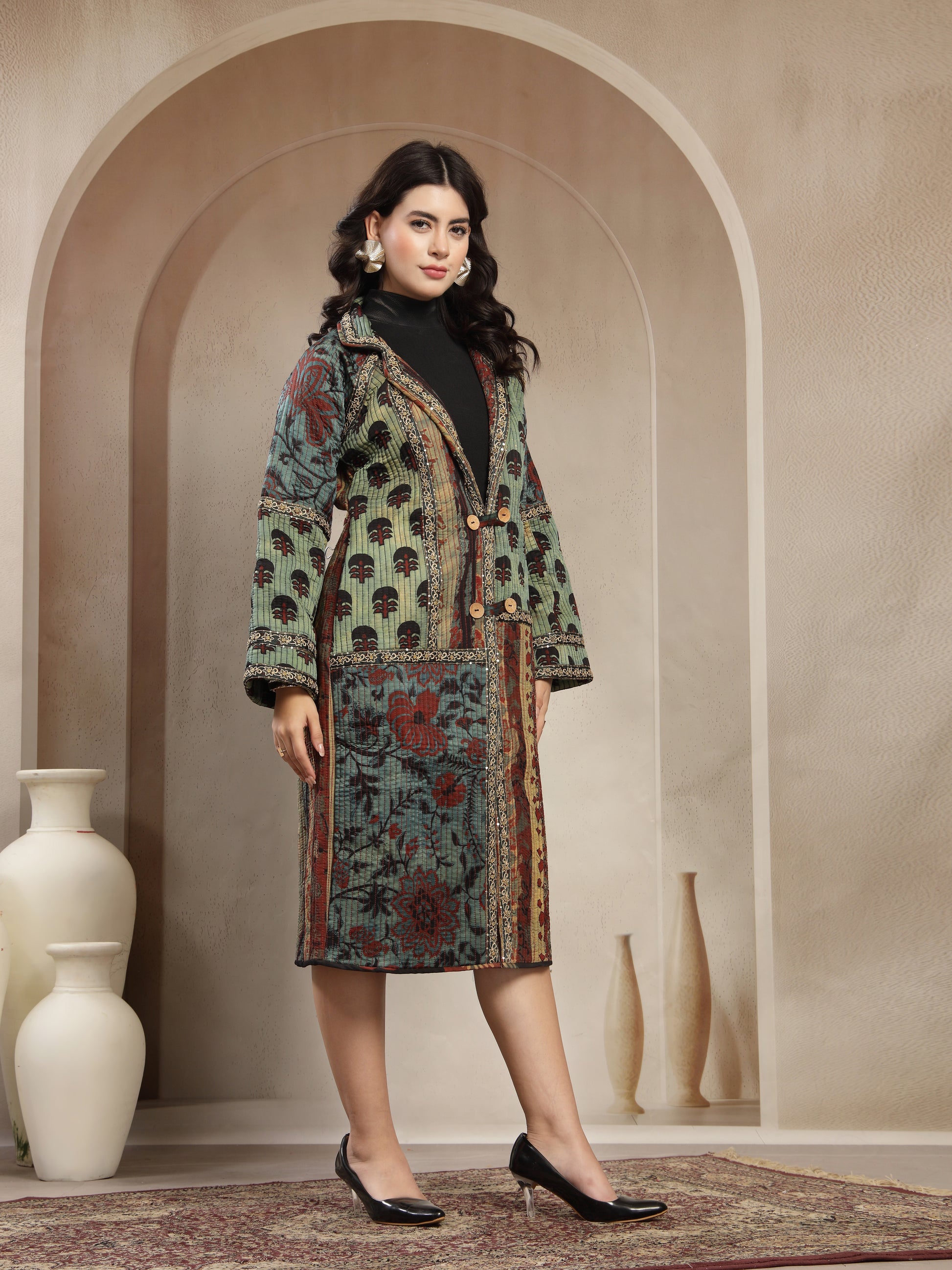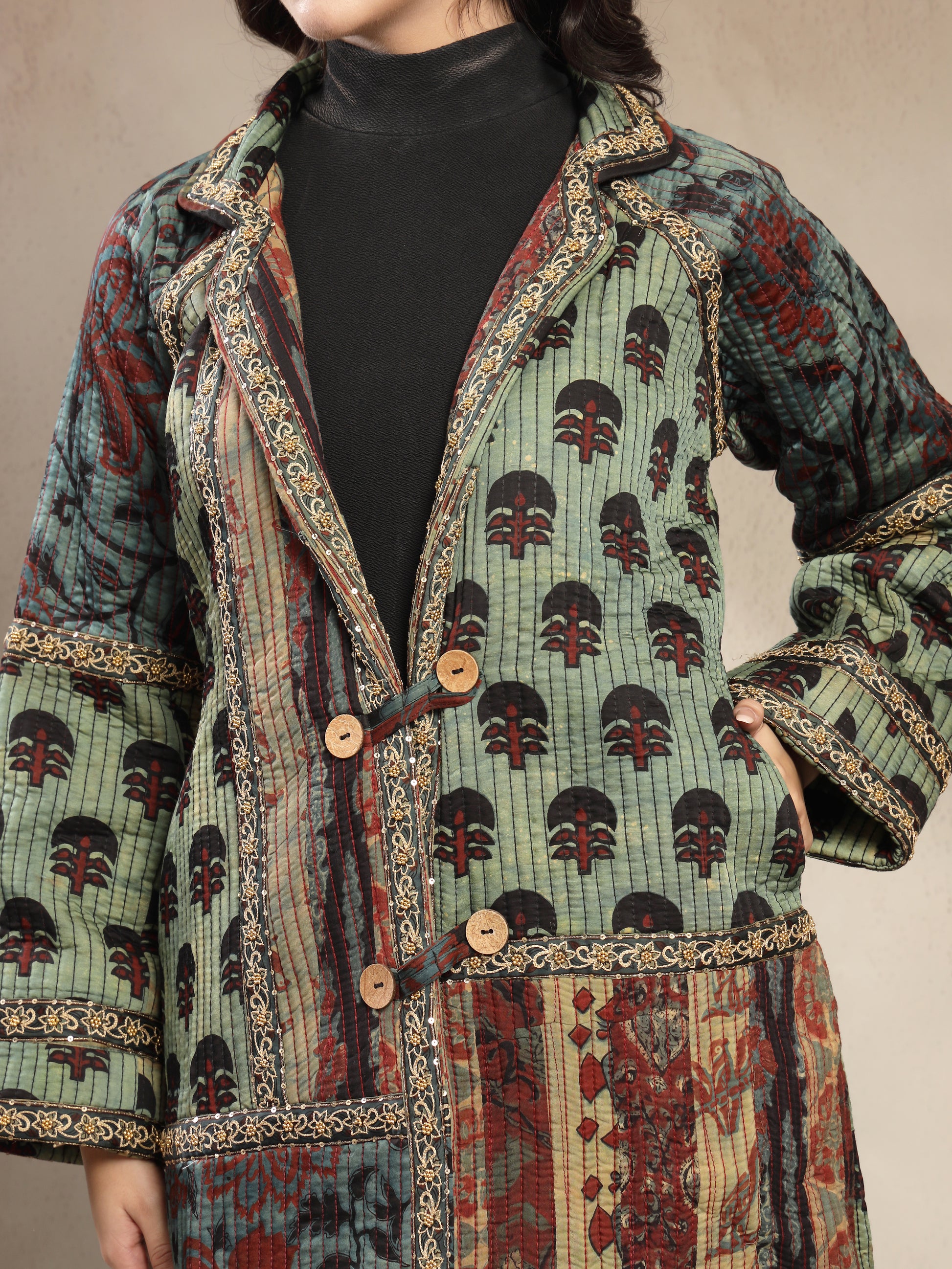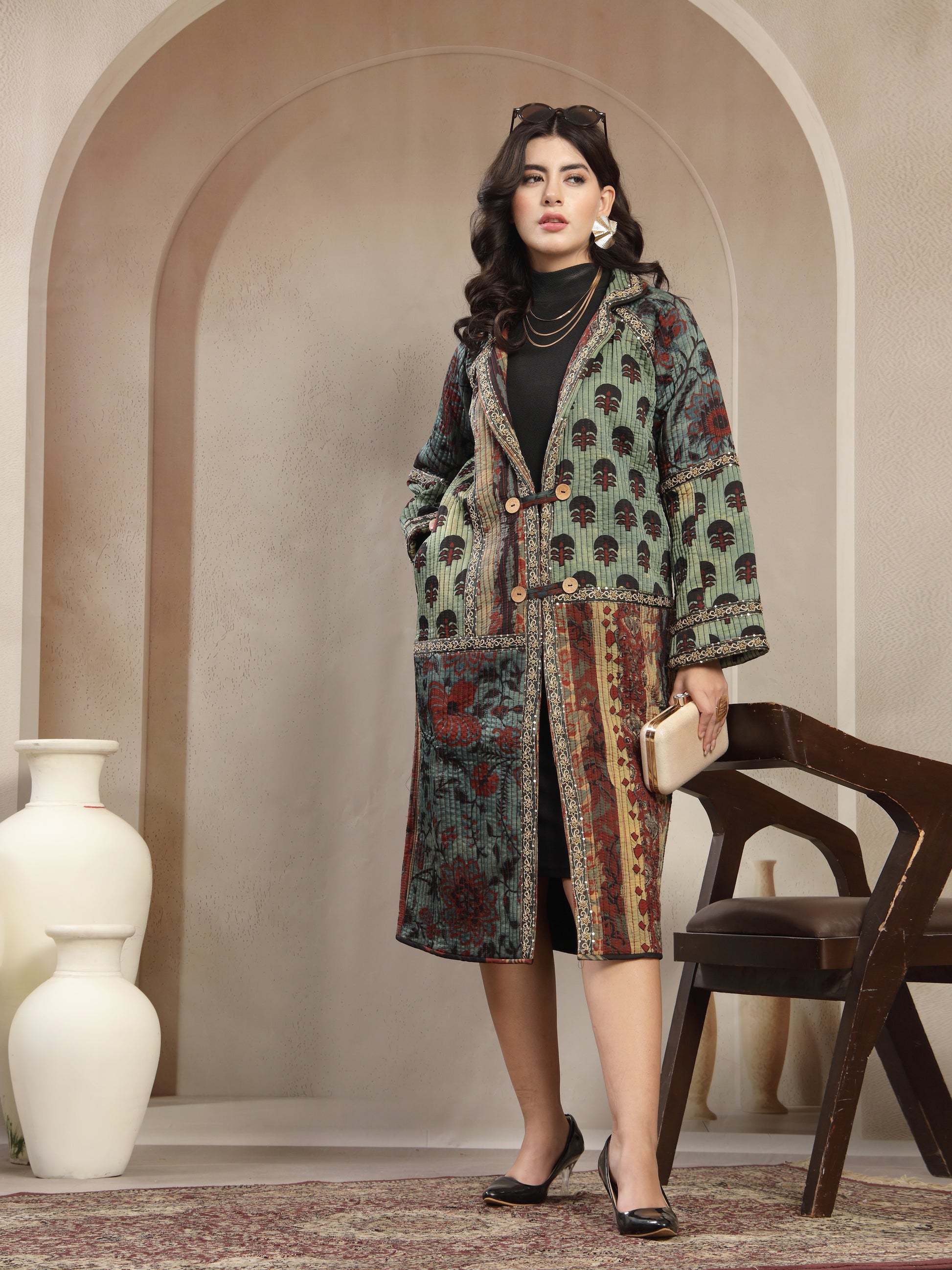 Elevate your style with this stunning handcrafted long jacket made from premium modal fabric, known for its luxurious softness, silky drape, and breathable comfort. The jacket showcases a beautiful fusion of ethnic zariwork prints in rich earthy tones, giving it a unique artisanal charm. Featuring a double-button front, relaxed fit sleeves, and intricate detailing along the borders, this piece blends tradition with modern elegance. Perfect for layering over western or ethnic outfits, it adds sophistication to any look.