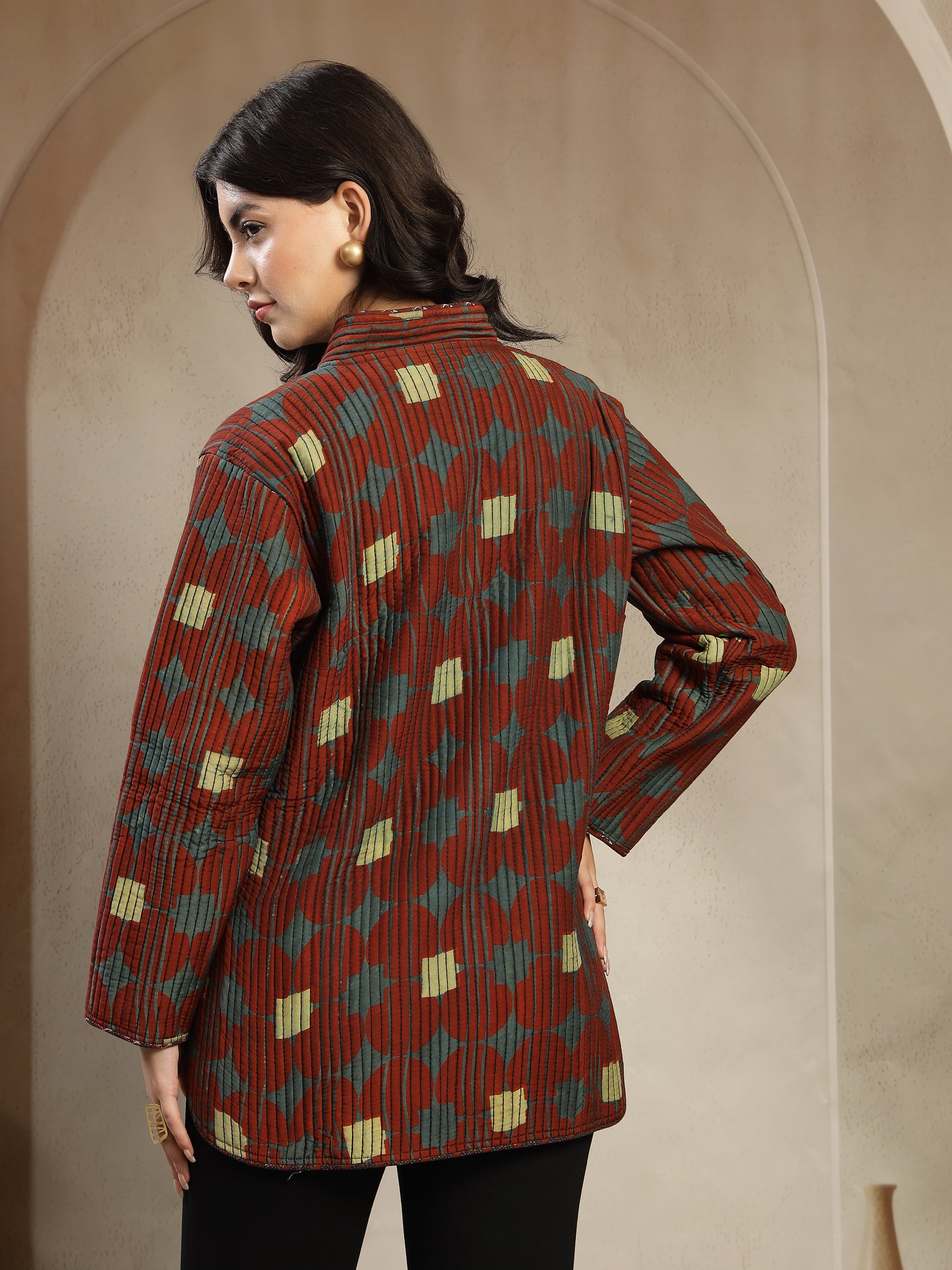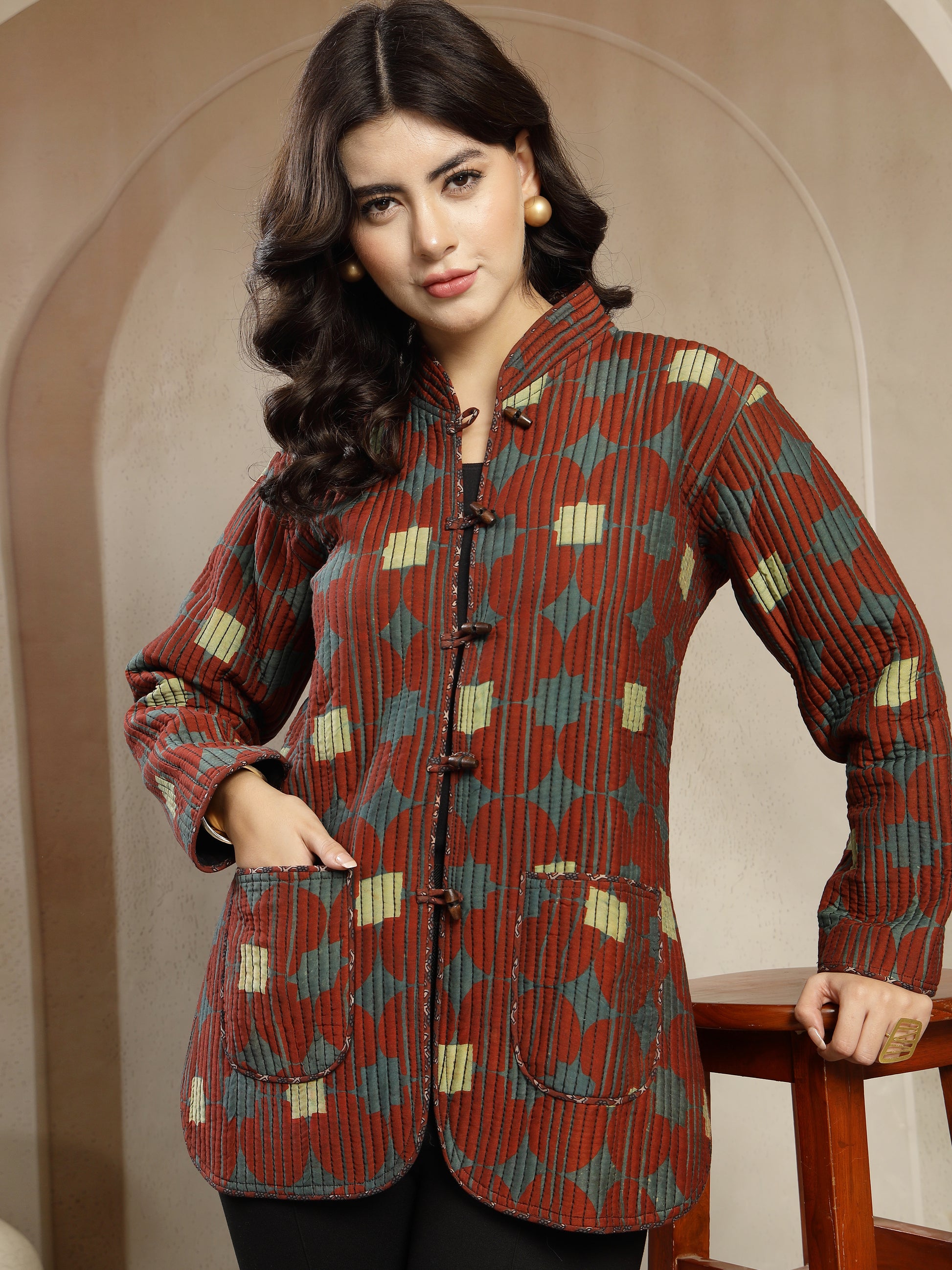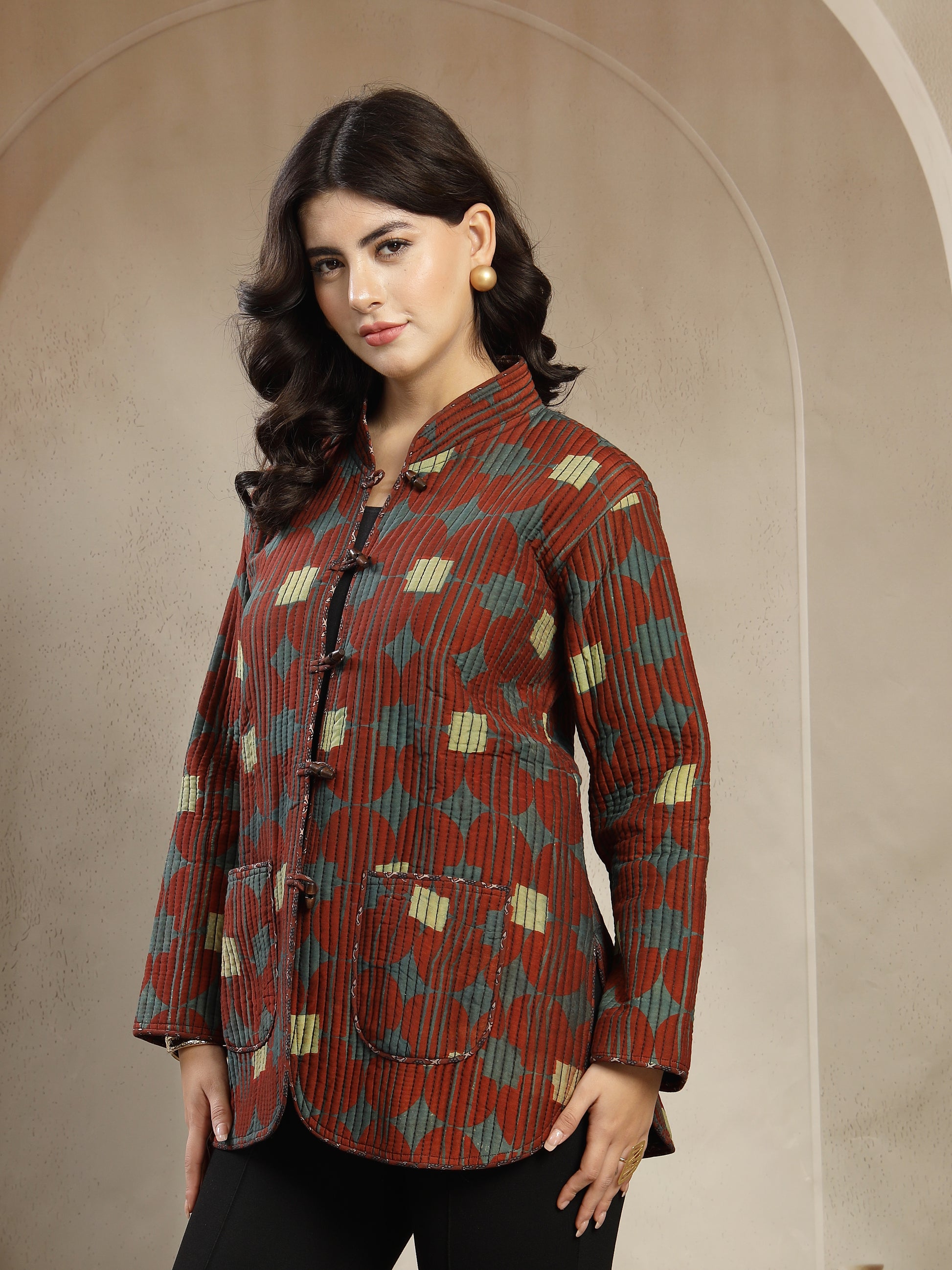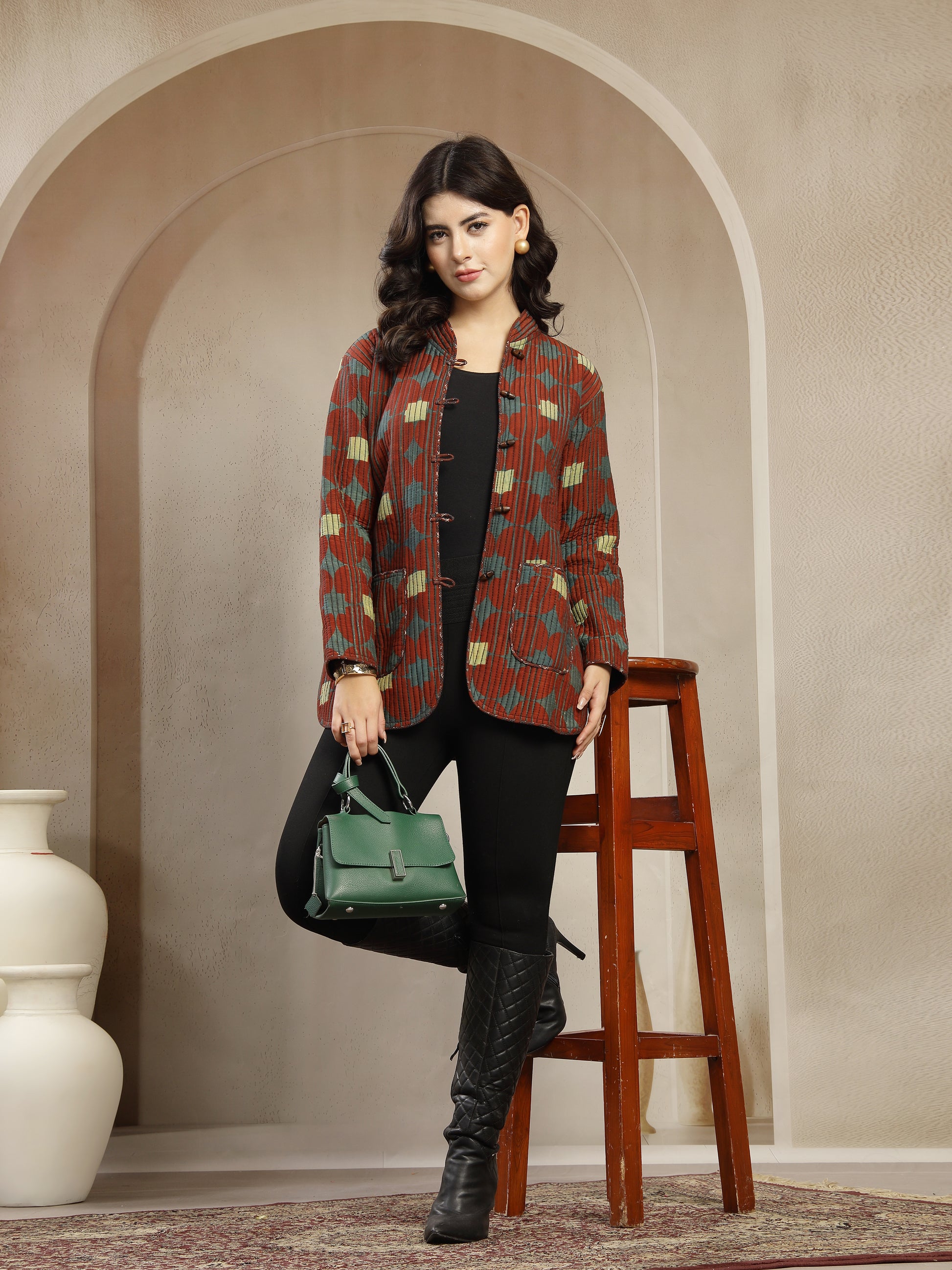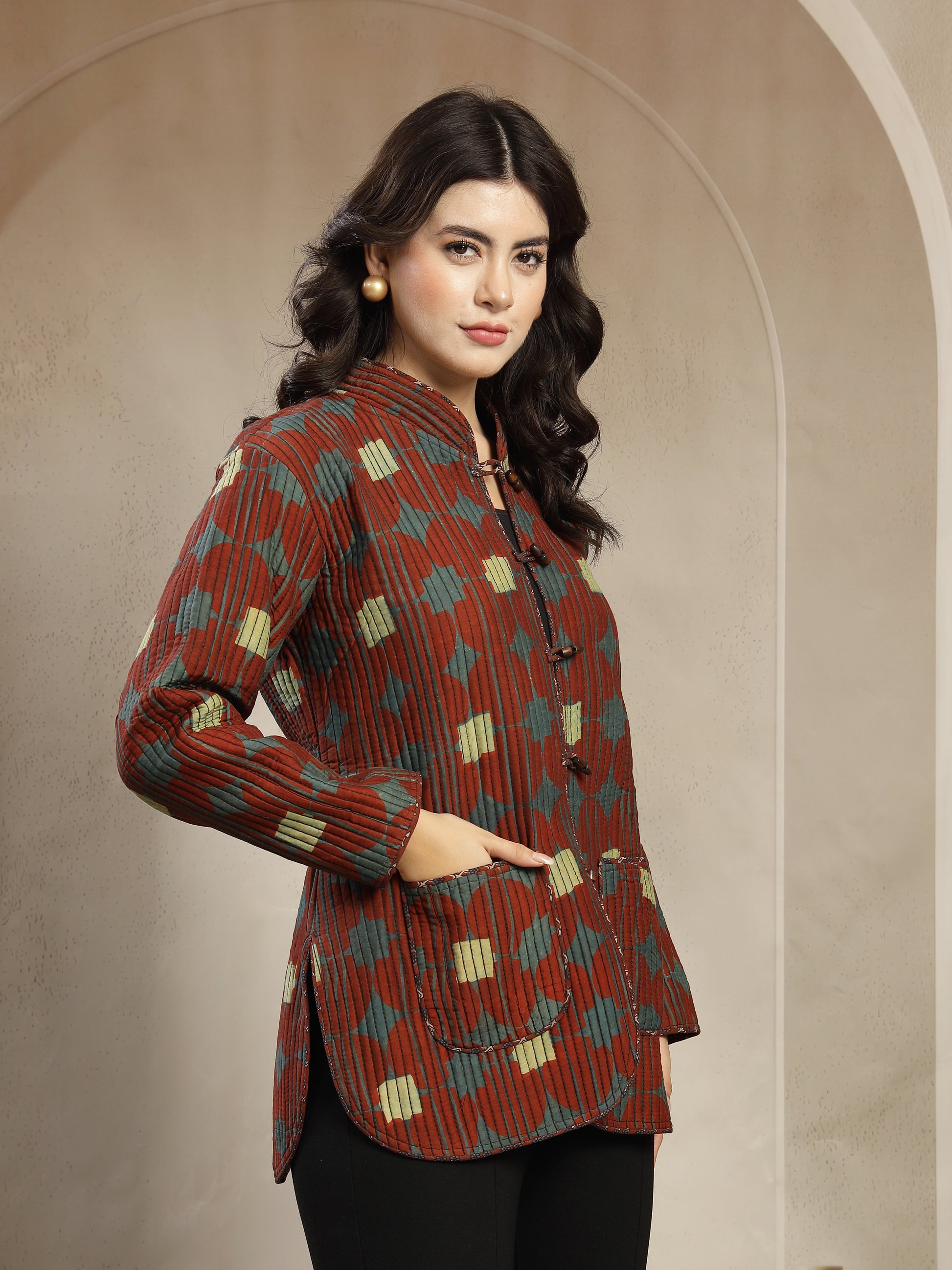 Upgrade your winter wardrobe with this beautifully crafted muslin quilted jacket, designed for comfort, warmth, and effortless style. Featuring a rich blend of earthy tones with an ethnic block-print pattern, this jacket brings together traditional artistry and modern fashion.