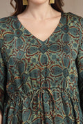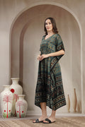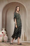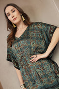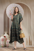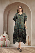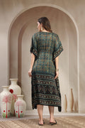 Step into effortless sophistication with this Modal Satin Kaftan, designed to blend comfort with understated luxury. Crafted from fine modal satin, this kaftan offers a silky-smooth feel and an elegant drape that flatters every silhouette. The intricate hand-printed motifs and contrasting ethnic border lend it a rich, artisanal appeal. Finished with a classic V-neckline and a subtle drawstring waist, this piece transitions seamlessly from relaxed daytime wear to refined evening lounging.