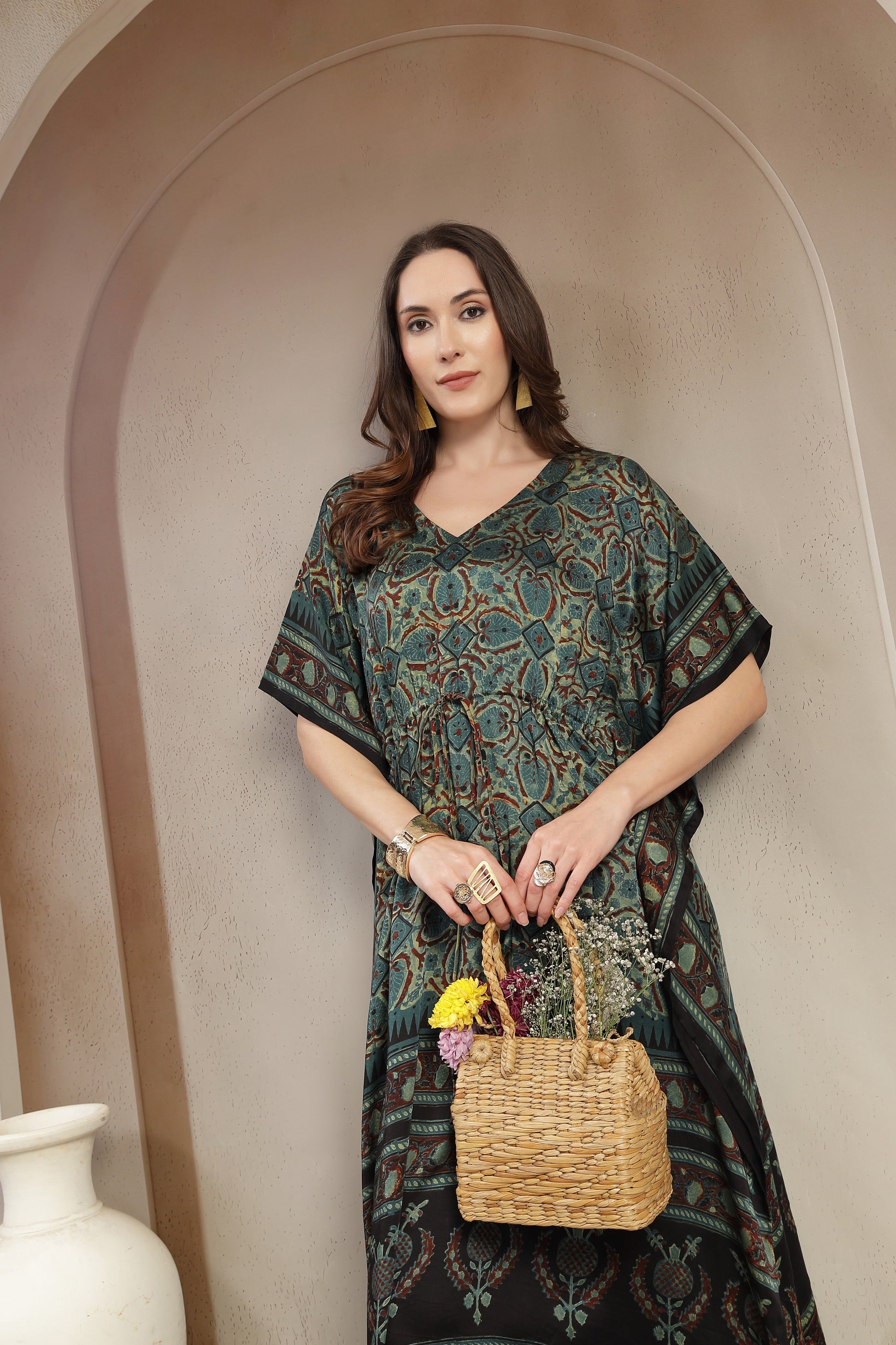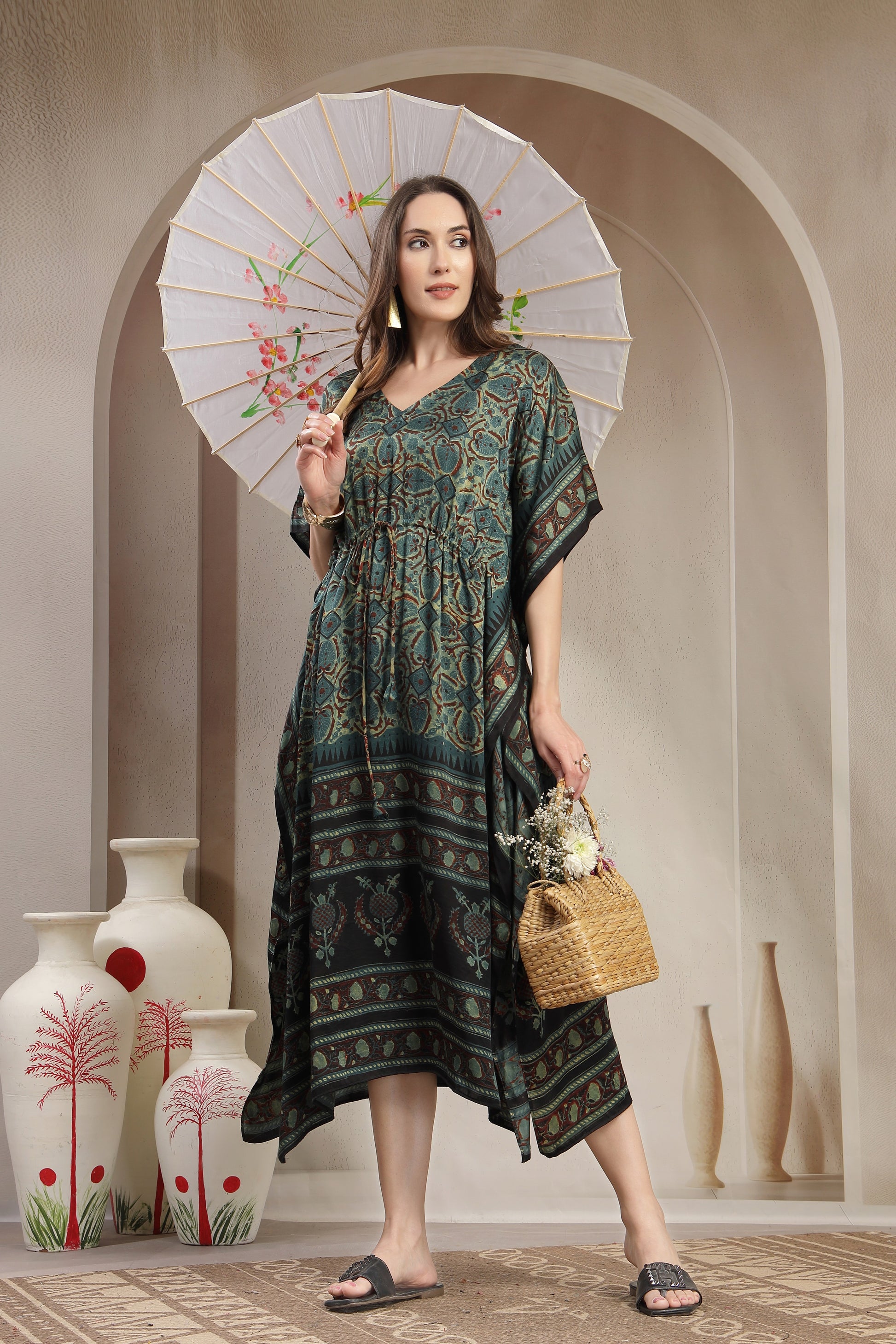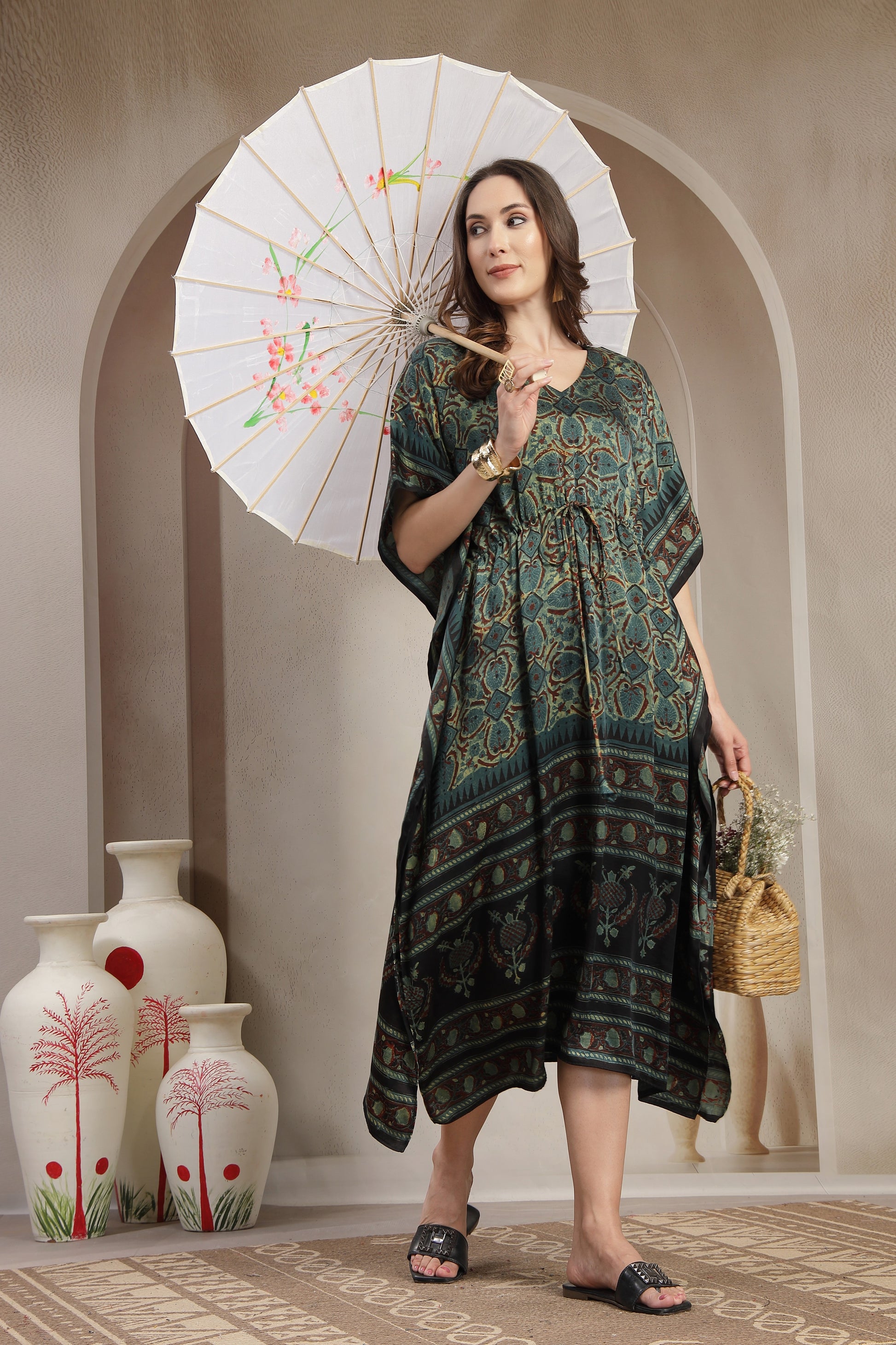 Luxury Hand-Printed Modal Satin Kaftan with Adjustable Waist