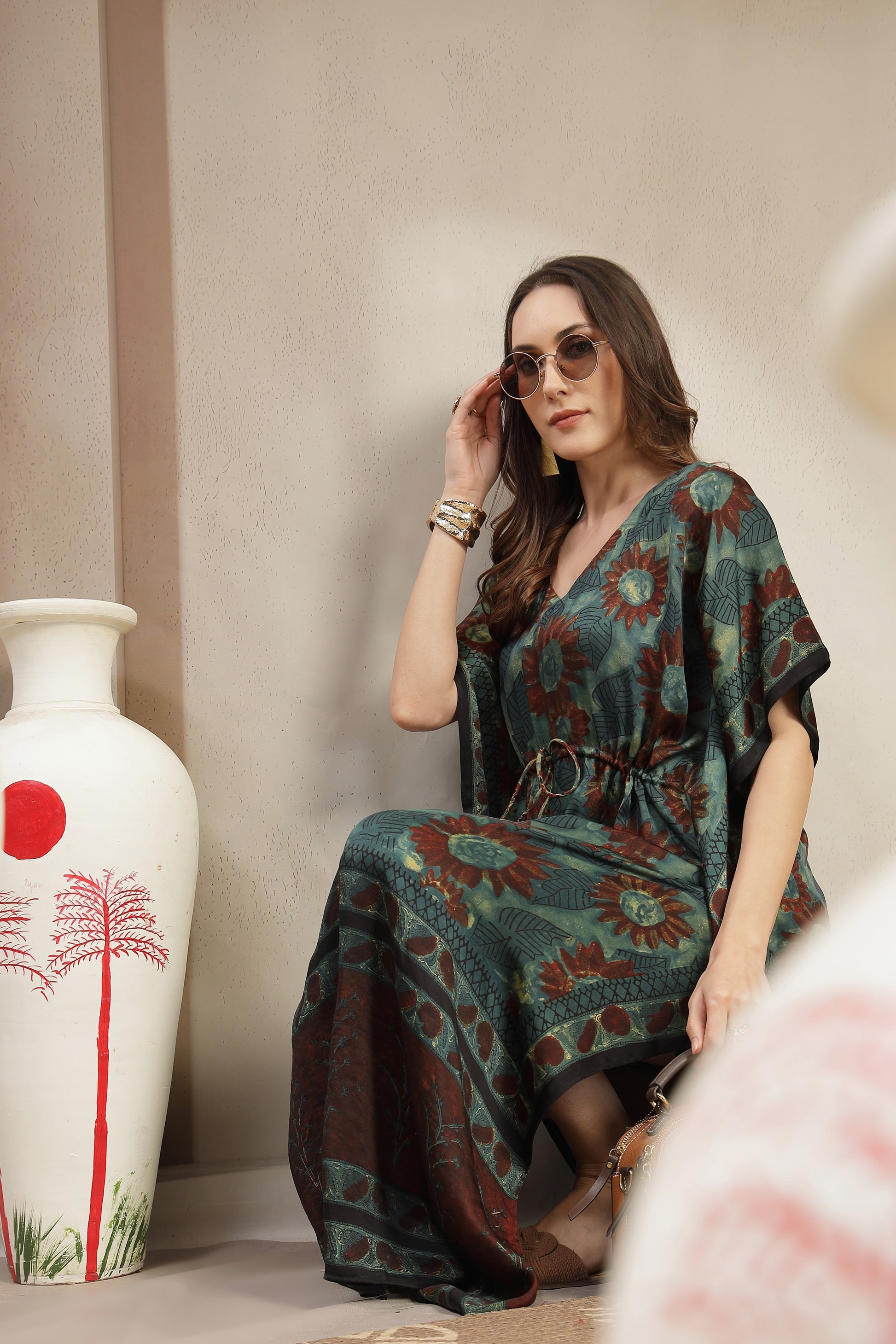 Elevate your everyday elegance with this luxurious Modal Satin Kaftan, designed to offer a perfect balance of comfort and sophistication. Crafted from premium modal satin, the fabric feels exceptionally soft against the skin with a subtle sheen that enhances its rich, earthy prints. The relaxed kaftan silhouette is complemented by an adjustable drawstring waist, allowing a flattering fit for all body types.