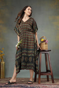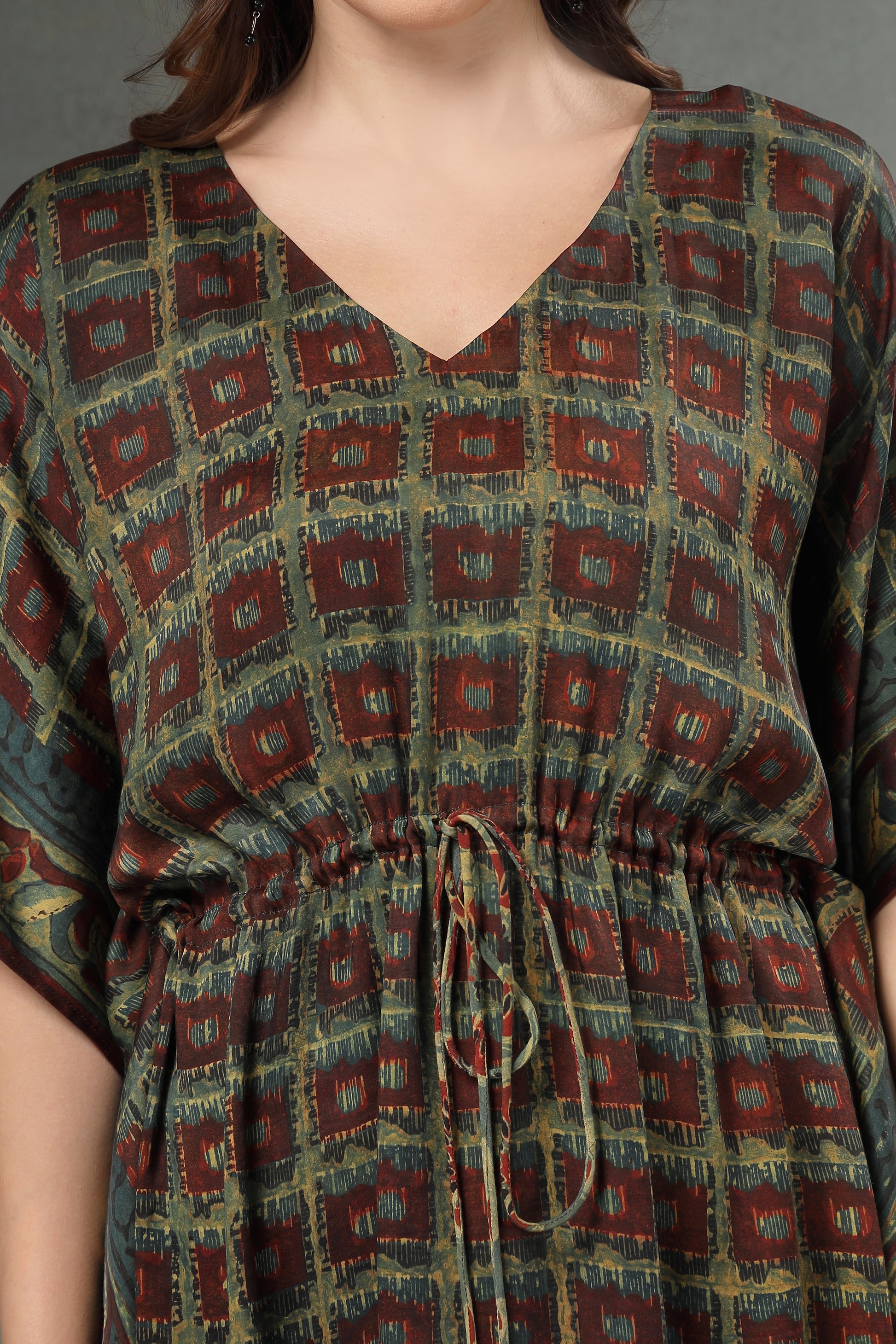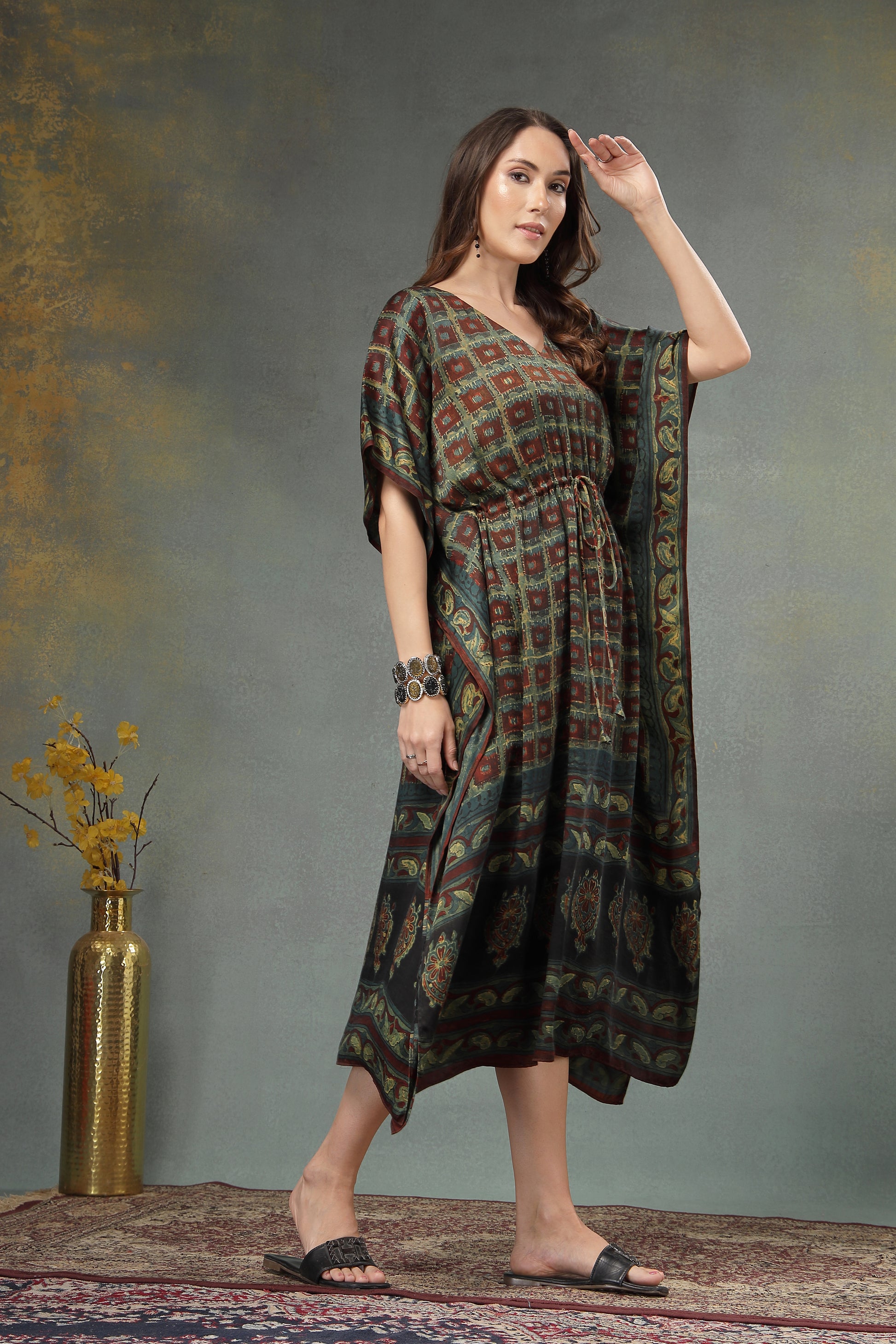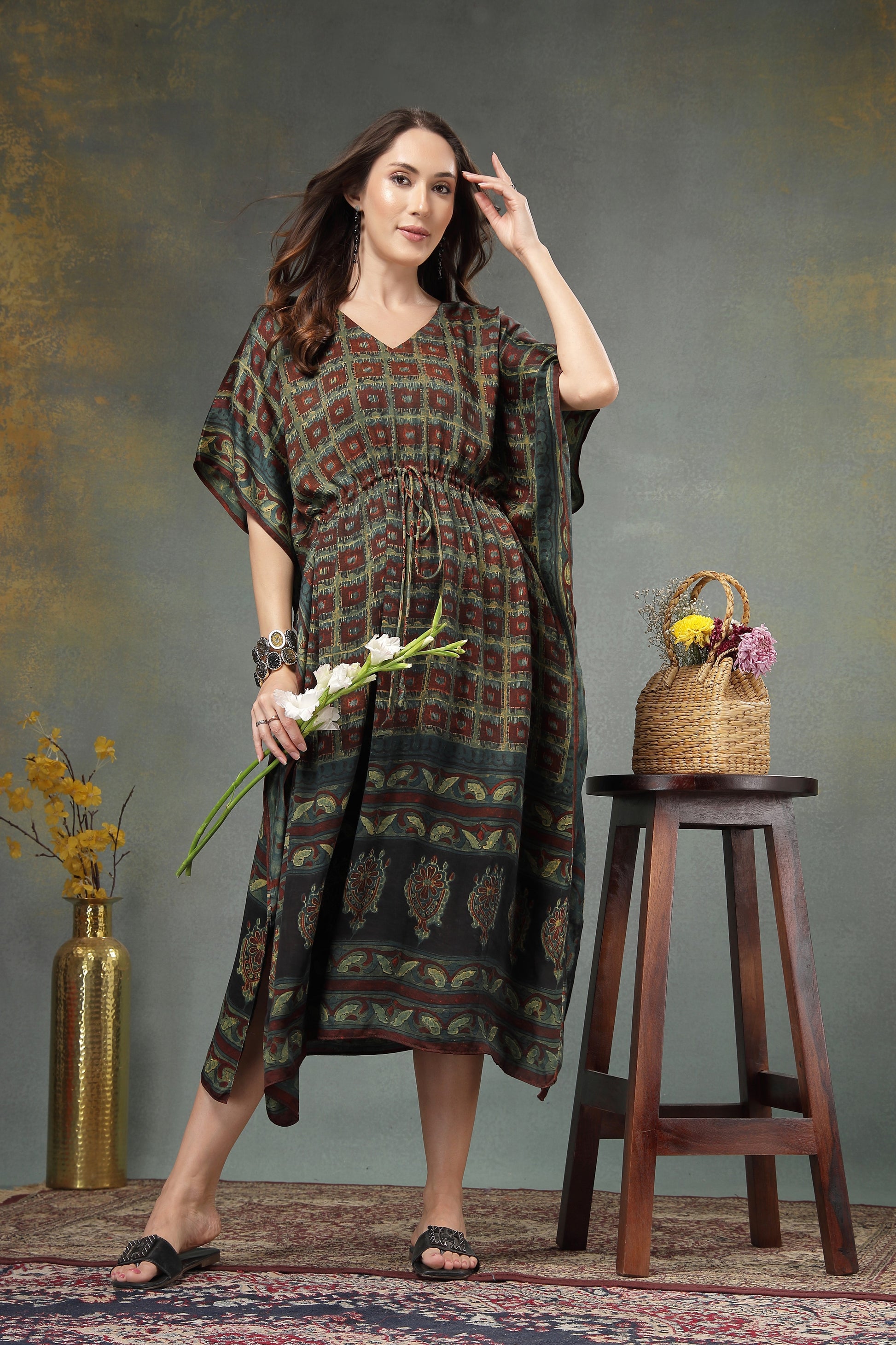 Elevate your everyday and occasion wear with this elegant Modal Satin Handblock Printed Kaftan. Crafted from luxurious modal satin fabric, this kaftan features exquisite handblock prints that reflect timeless artisanal craftsmanship. The soft sheen, fluid drape, and breathable texture make it perfect for effortless comfort with a touch of sophistication. Designed with a relaxed silhouette and adjustable drawstring waist, it flatters all body types while ensuring ease of movement—ideal for resort wear, casual outings, or festive gatherings.