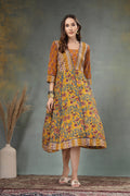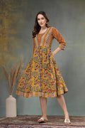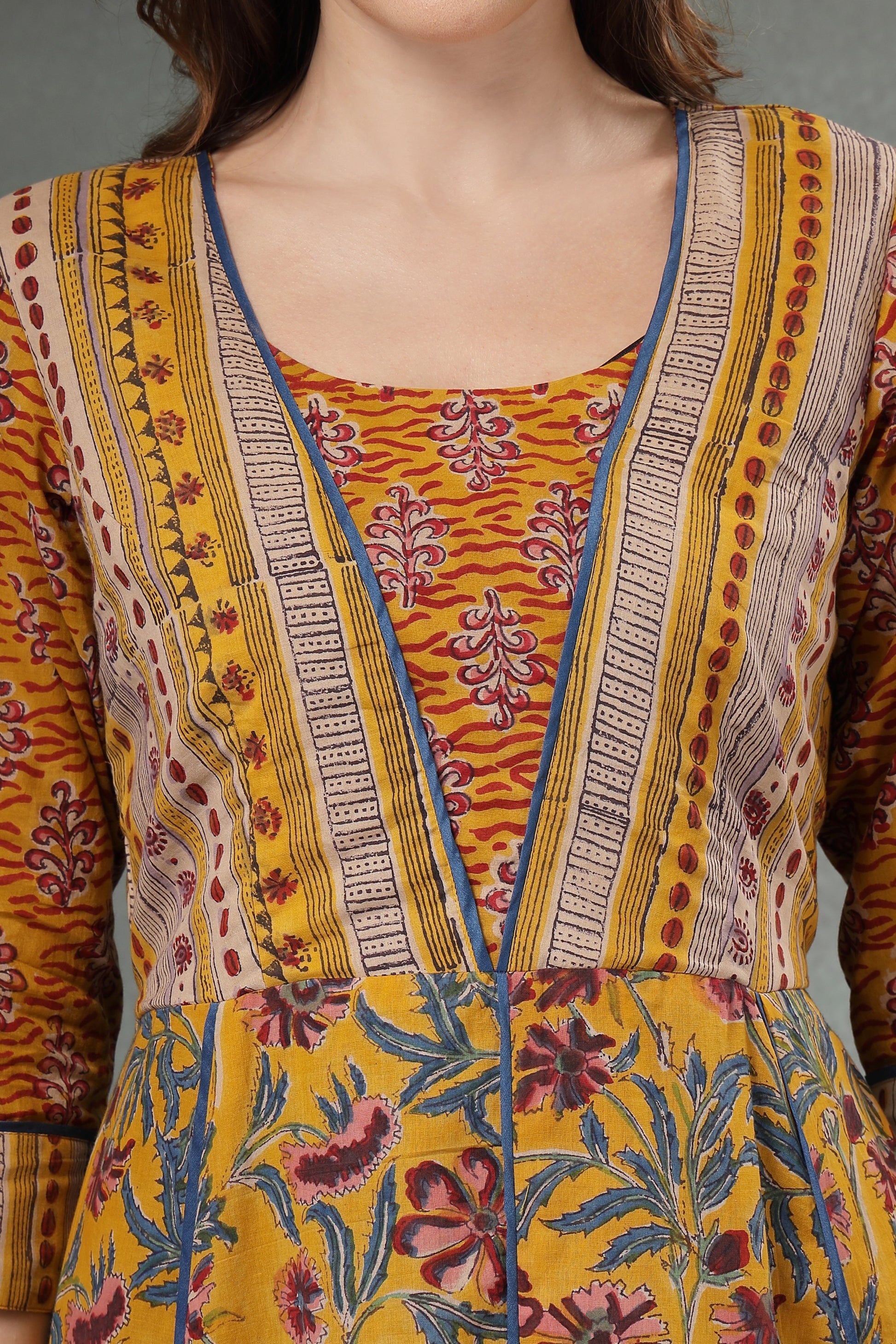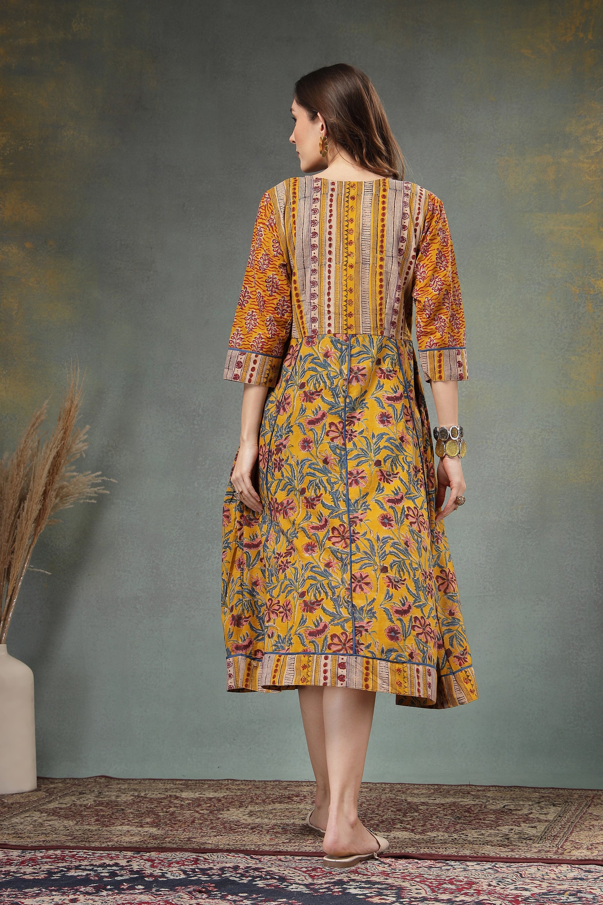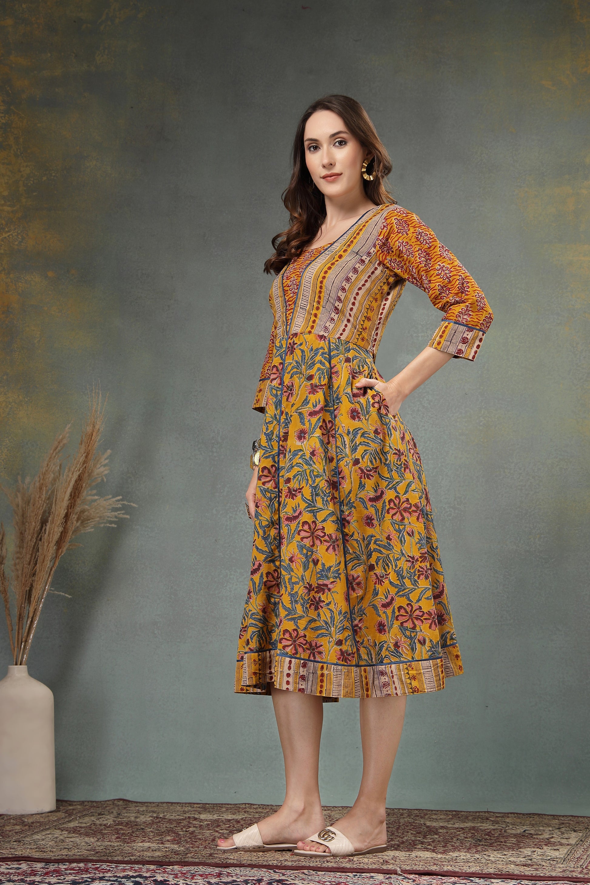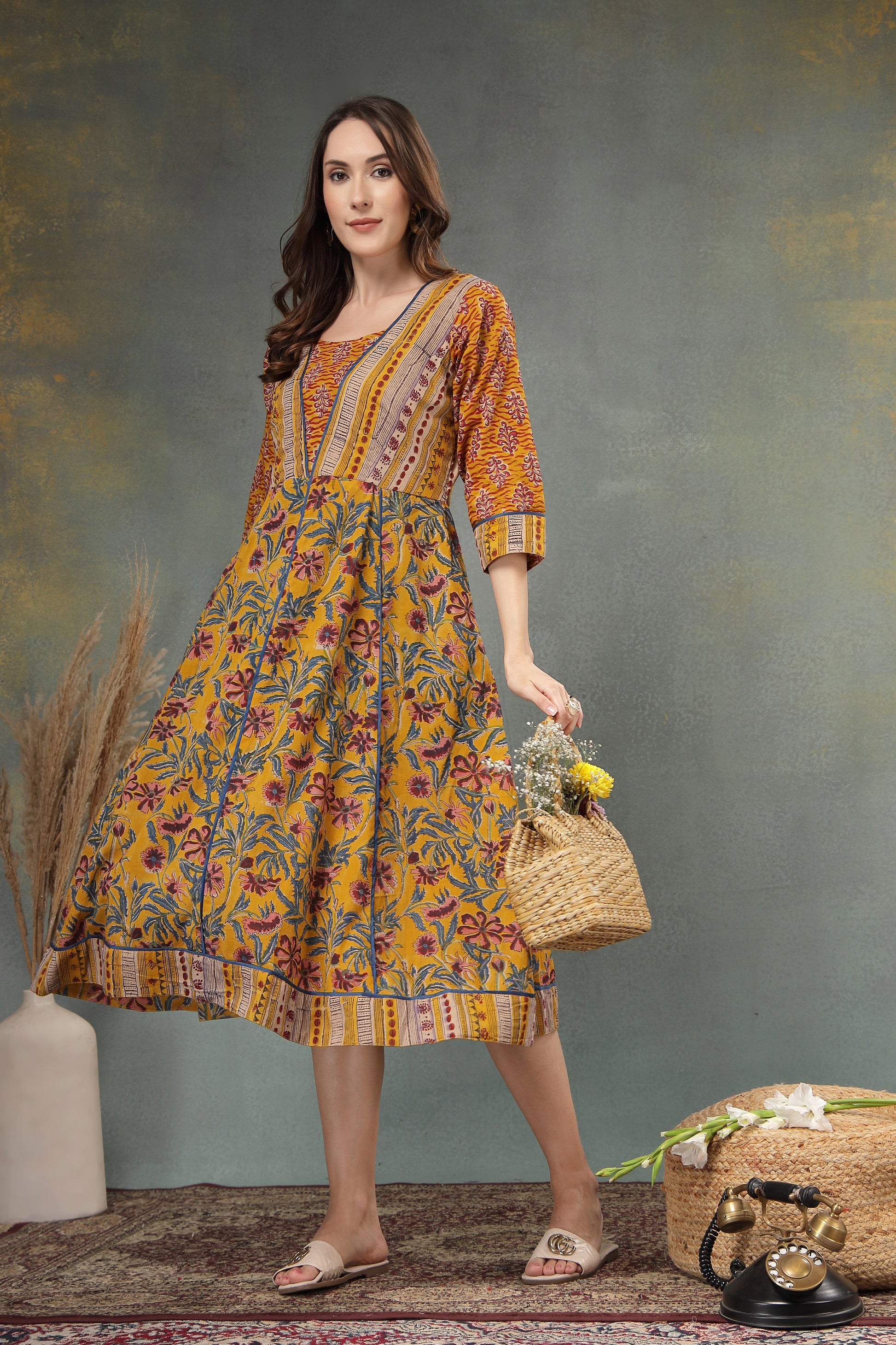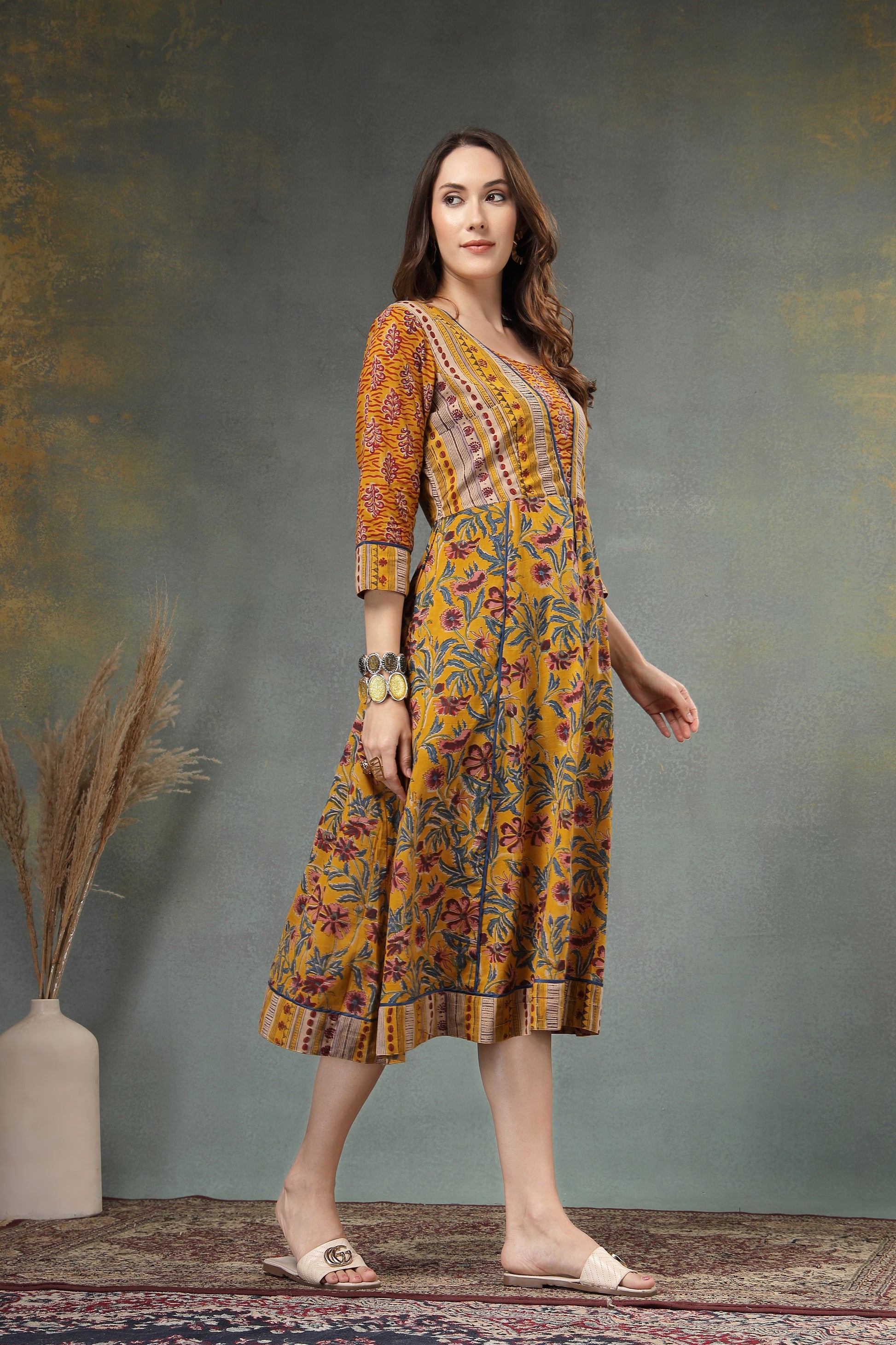 Mustard Floral Hand-Block Printed Cotton Anarkali Midi Dress