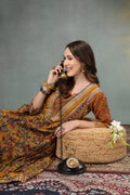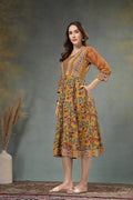 Whether you're heading to a casual brunch, a festive gathering, or a summer outing, this dress ensures you stay comfortable and stylish all day long. The mustard yellow hue, accented with deep floral tones and contrast piping, creates a vibrant yet sophisticated look that celebrates artisan craftsmanship.