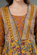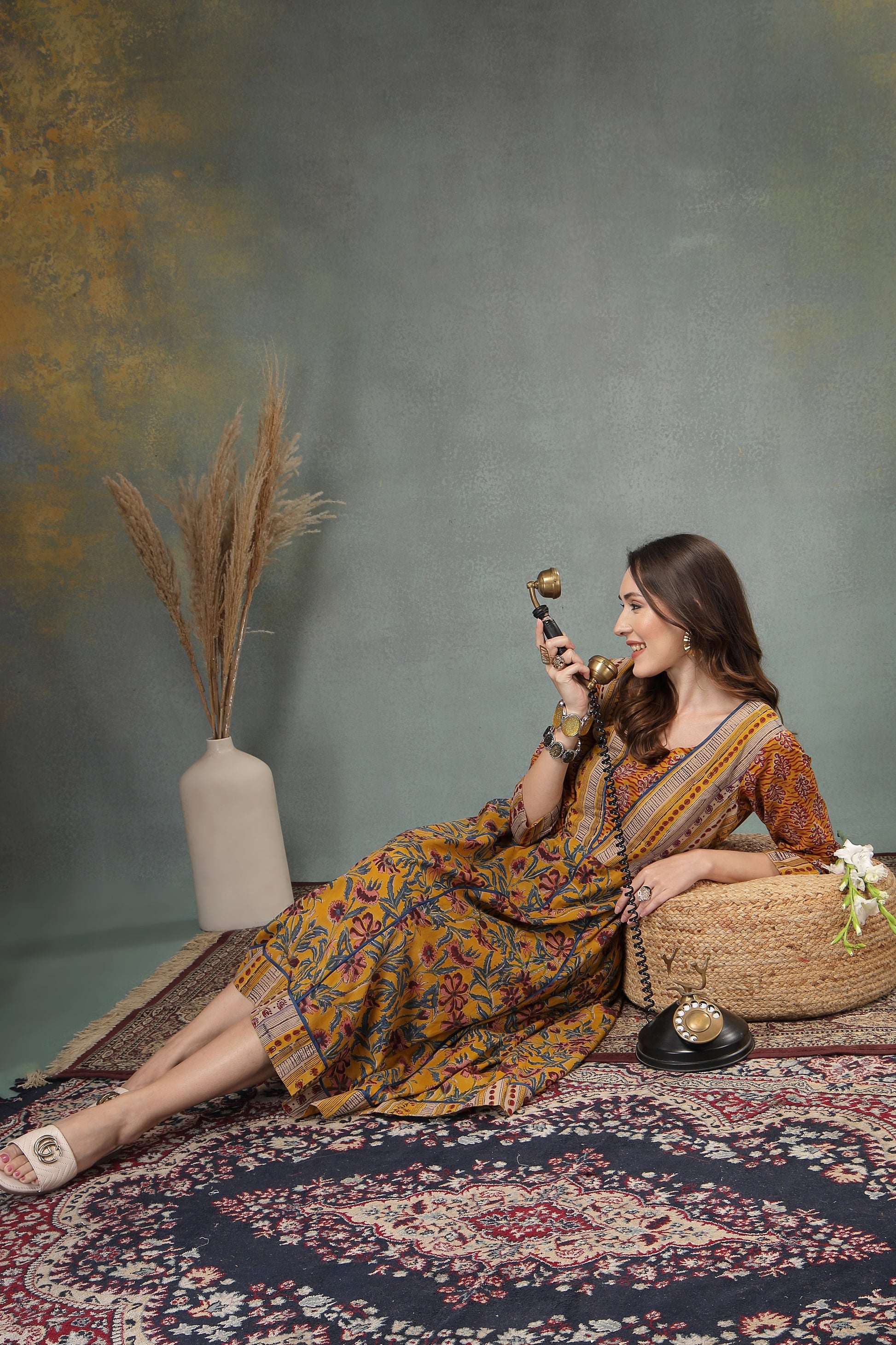 Embrace effortless elegance with our Mustard Floral Anarkali Midi Dress. Crafted from 100% premium breathable cotton, this dress features an exquisite mix of traditional hand-block prints and intricate patterns. The flared silhouette offers a graceful movement, while the unique paneled design adds a contemporary edge to a classic ethnic style.