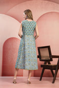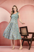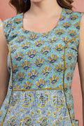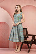 Brighten up your ensemble with our Hand-Blocked Paneled Cotton Dress. This midi-length garment artfully combines two complementary floral motifs on a sunny mustard yellow base. Its sleeveless, fit-and-flare silhouette offers a timeless, feminine look that transitions easily from a casual day out to a festive afternoon gathering.