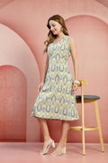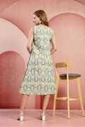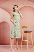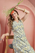 Olive & Grey Ikat Printed Cotton A-Line Dress with V-Neck