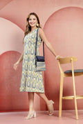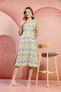 Elevate your everyday style with this elegant olive and grey ikat printed cotton dress. Crafted from soft, breathable cotton fabric, this sleeveless A-line dress features a flattering V-neckline and a comfortable knee-length silhouette. The timeless ikat-inspired print adds a subtle ethnic charm, making it perfect for casual outings, office wear, or daytime gatherings. Lightweight and easy to wear, this dress blends comfort with effortless sophistication.