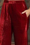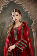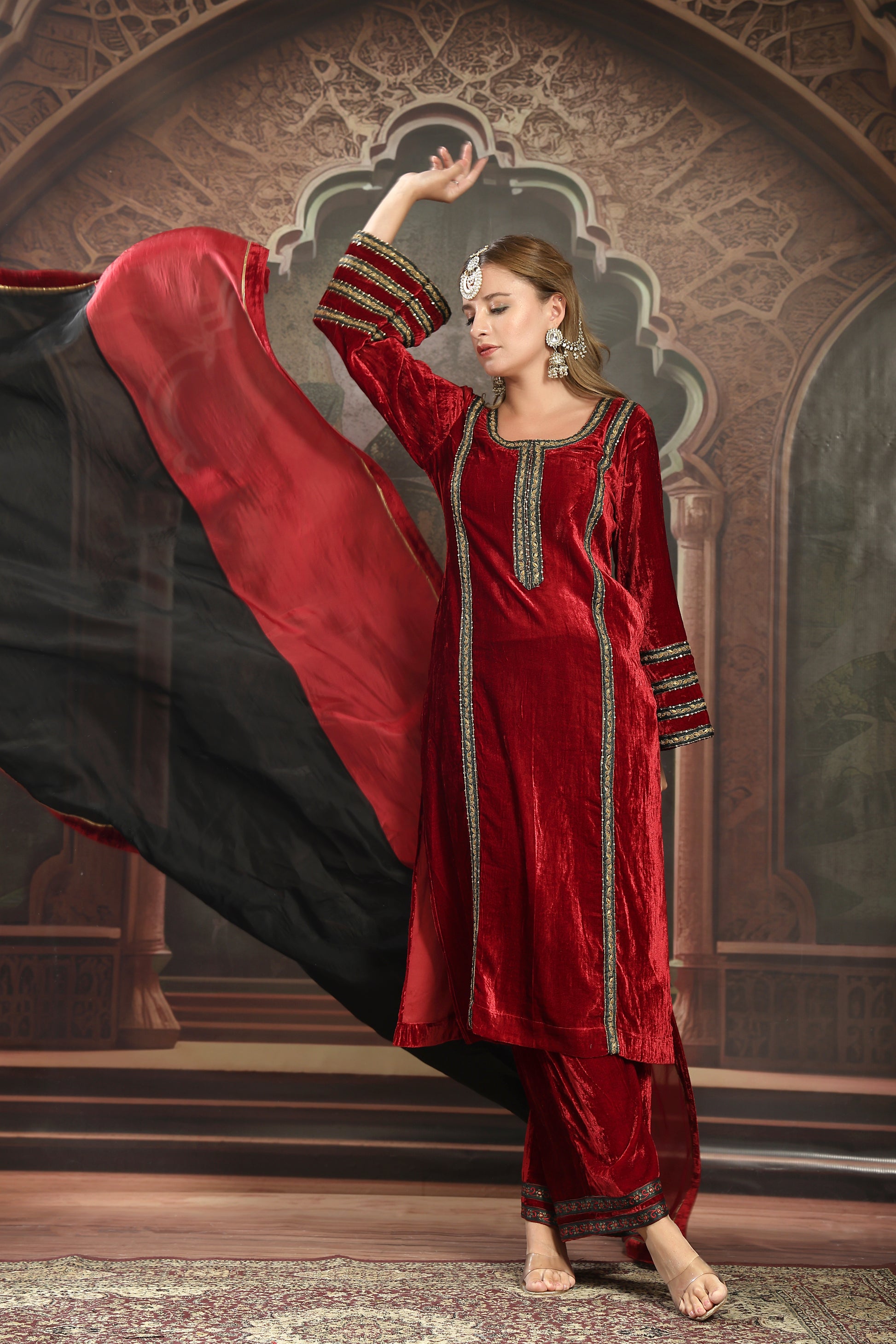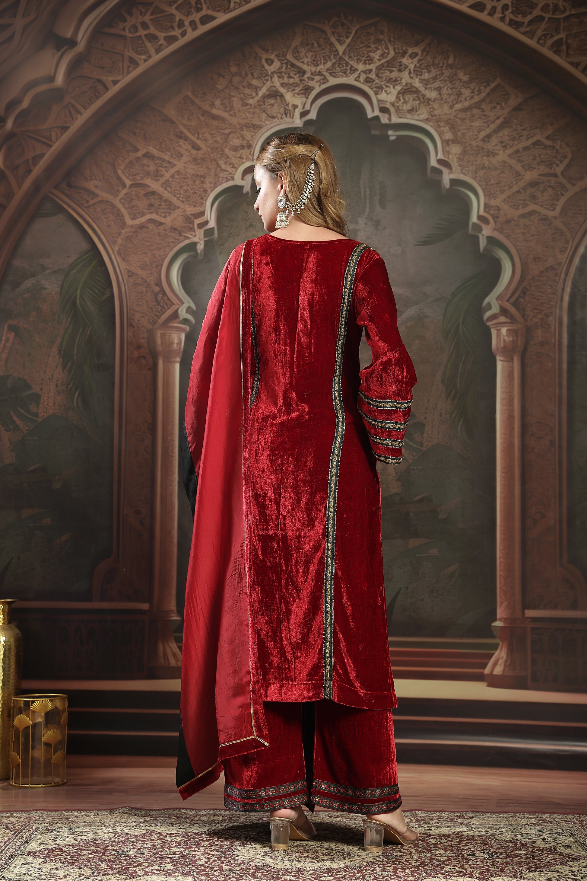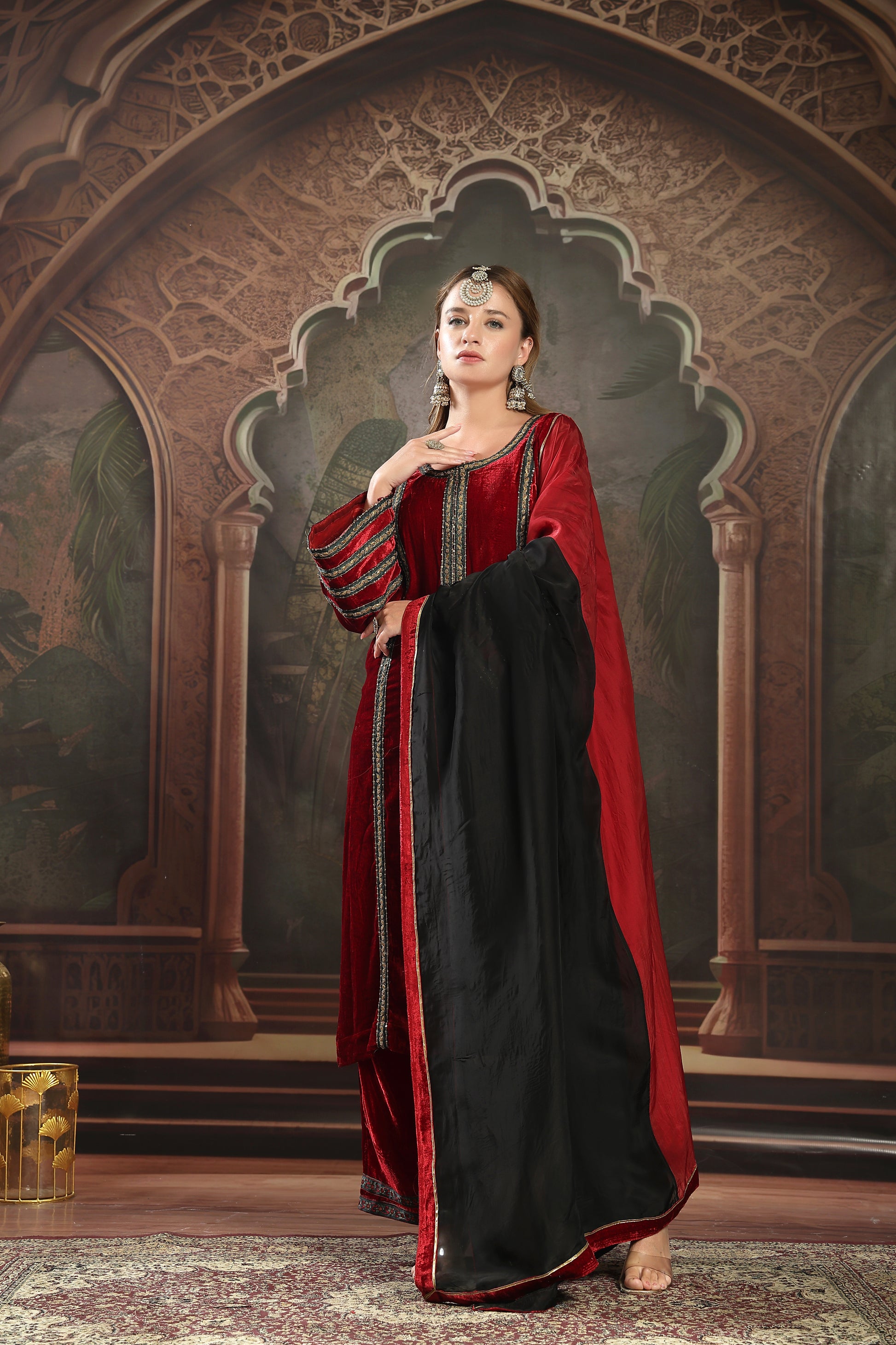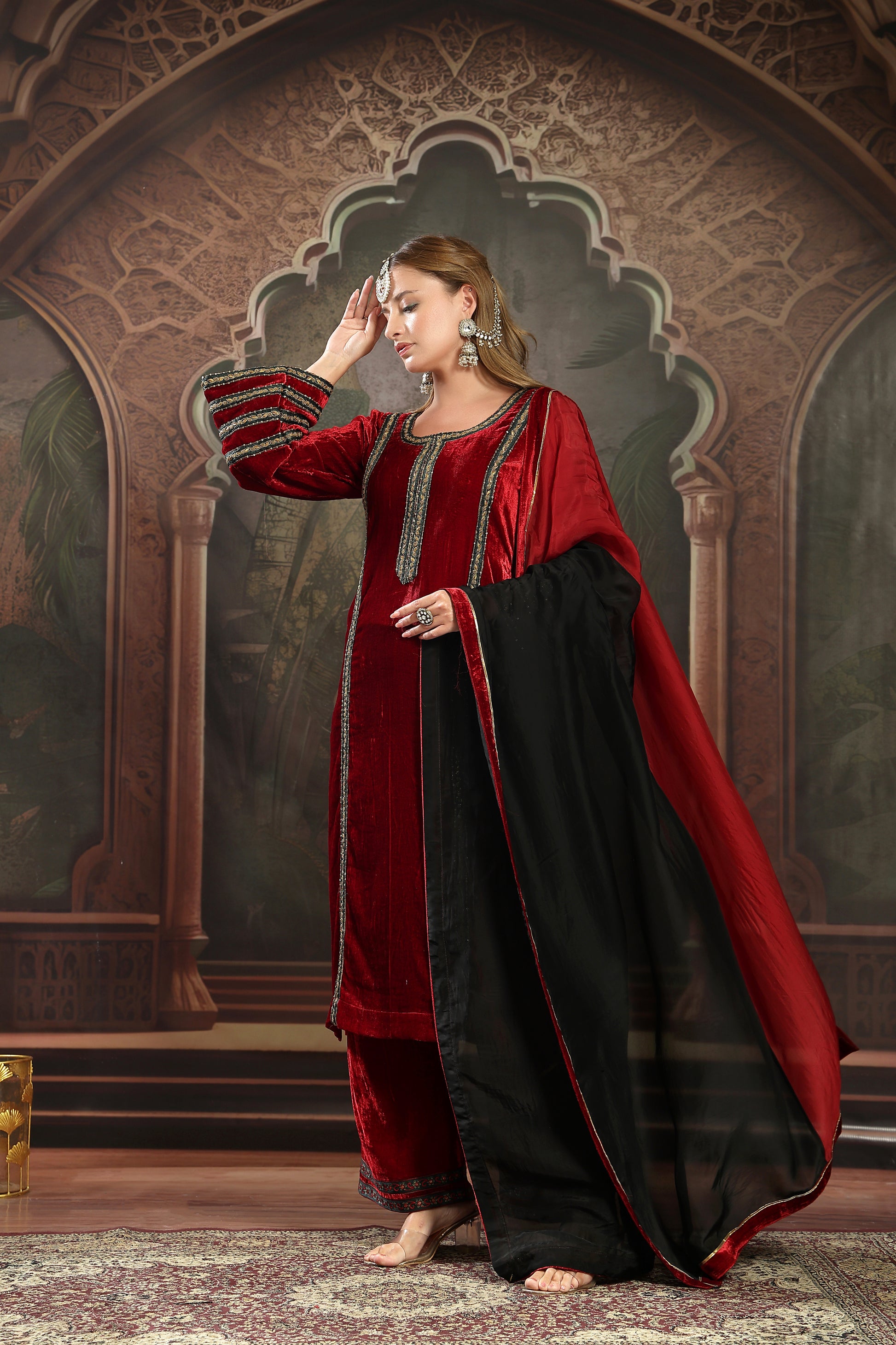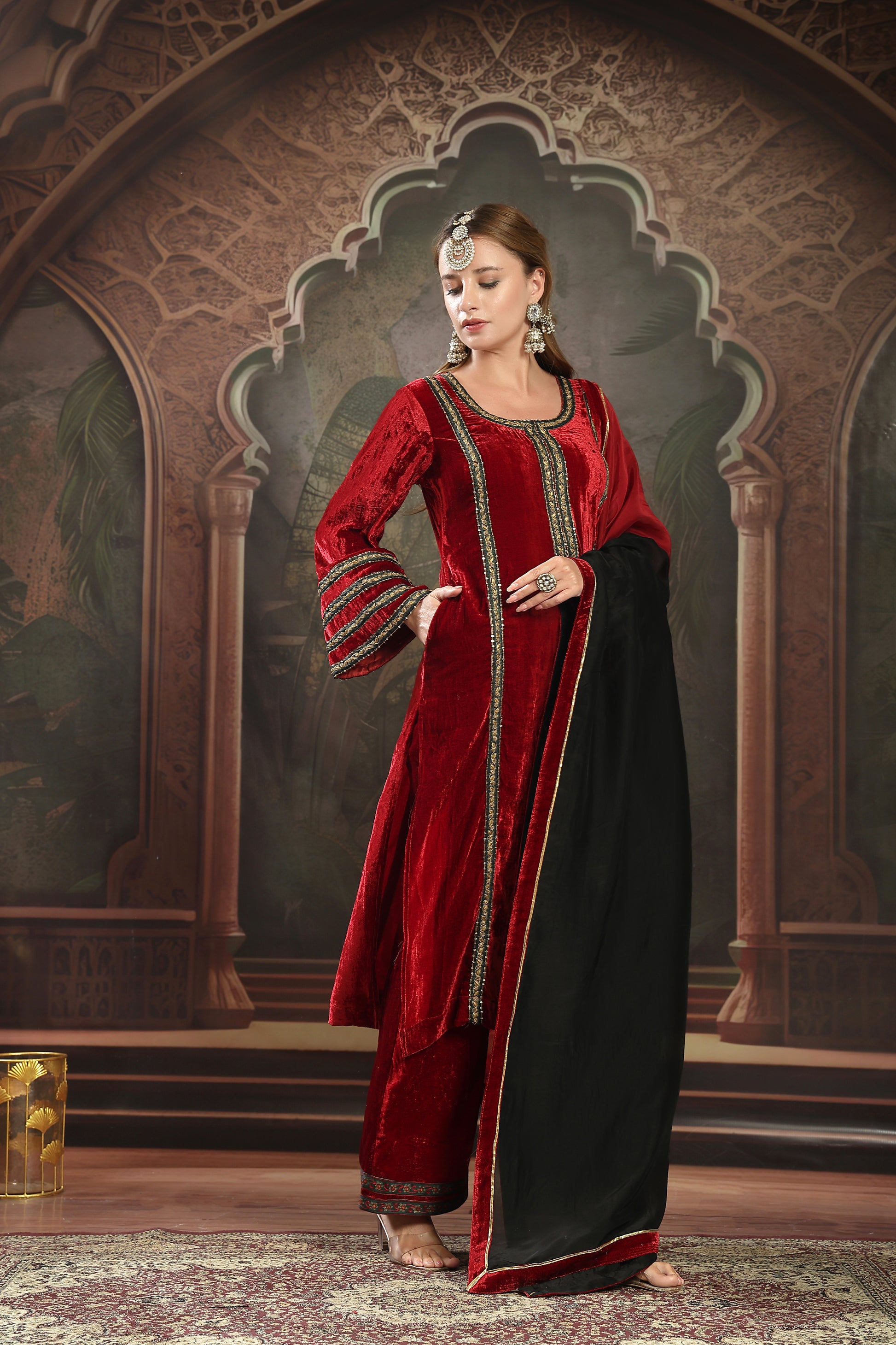 Regal Silk Velvet Embroidered Kurta Set – 3-Piece Luxury Ethnic Suite in Crimson & Noir