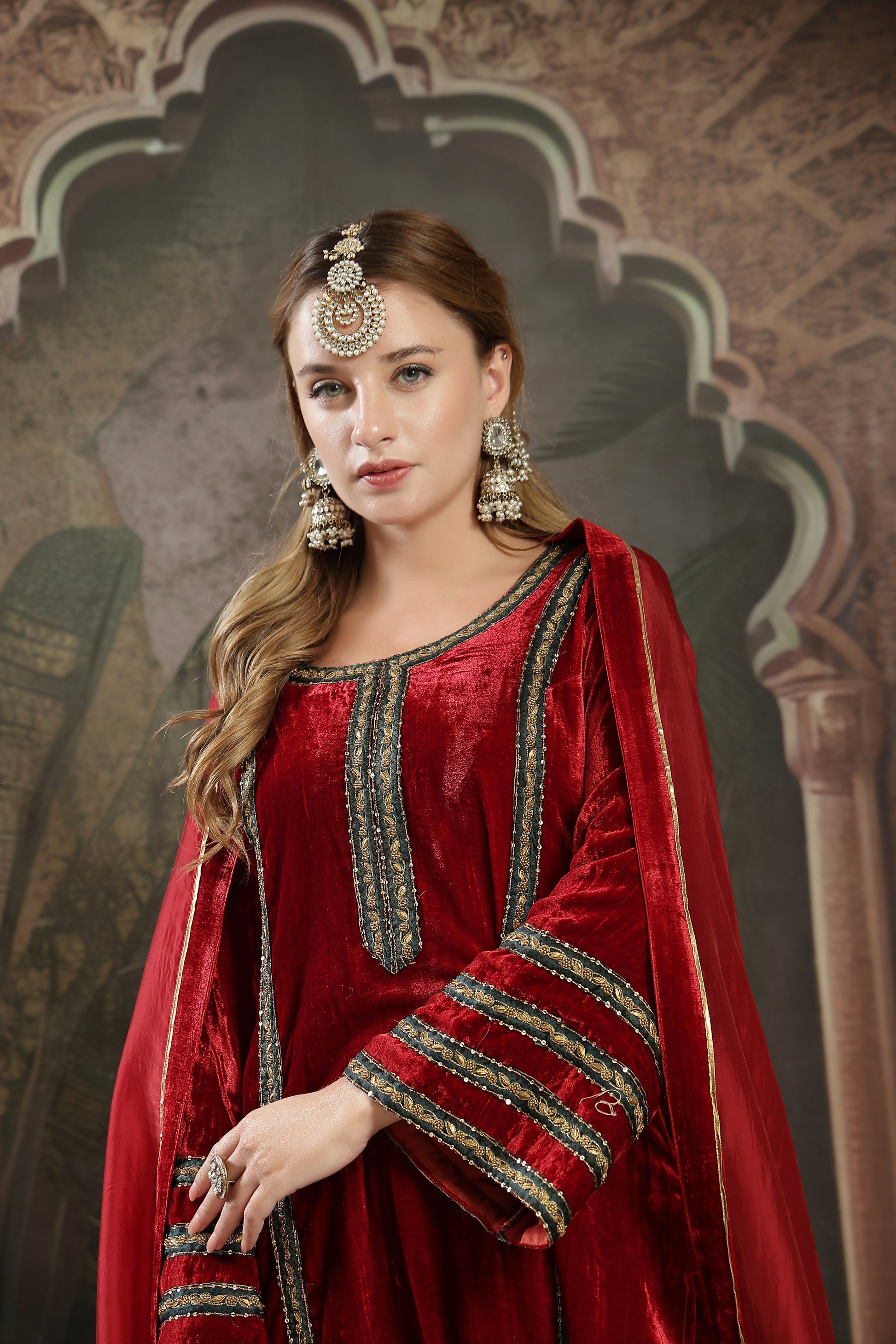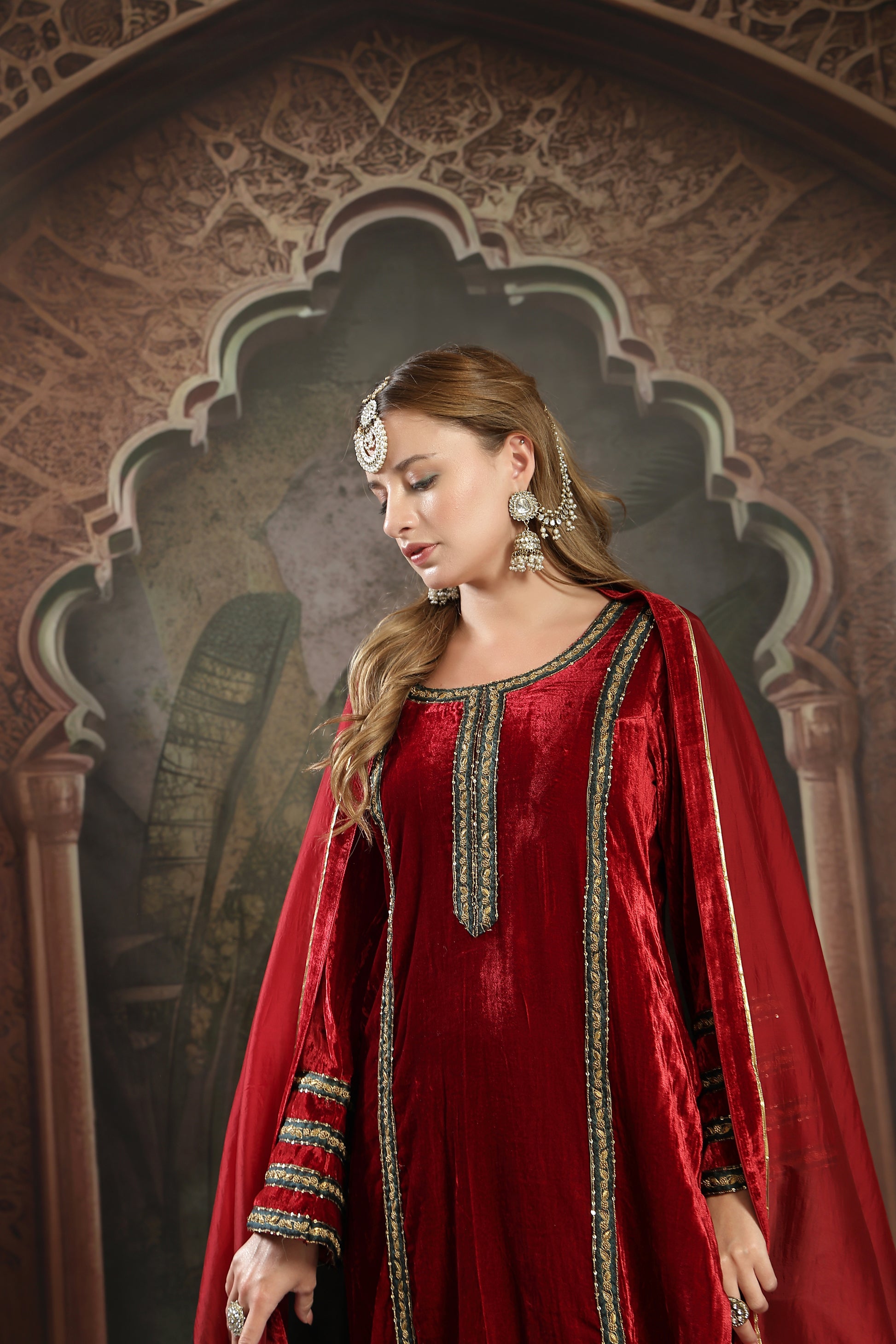 The longline kurta features a flattering straight silhouette, elevated by intricate Zari and thread-work embroidery that frames the neckline and follows the elegant vertical lines of the bodice. The flared sleeves are adorned with tiered embroidery bands, adding a touch of vintage drama to a modern cut. Paired with matching velvet trousers and a contrasting lightweight dupatta, this set is designed for high-profile winter weddings and festive celebrations where making an entrance is non-negotiable.