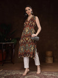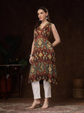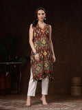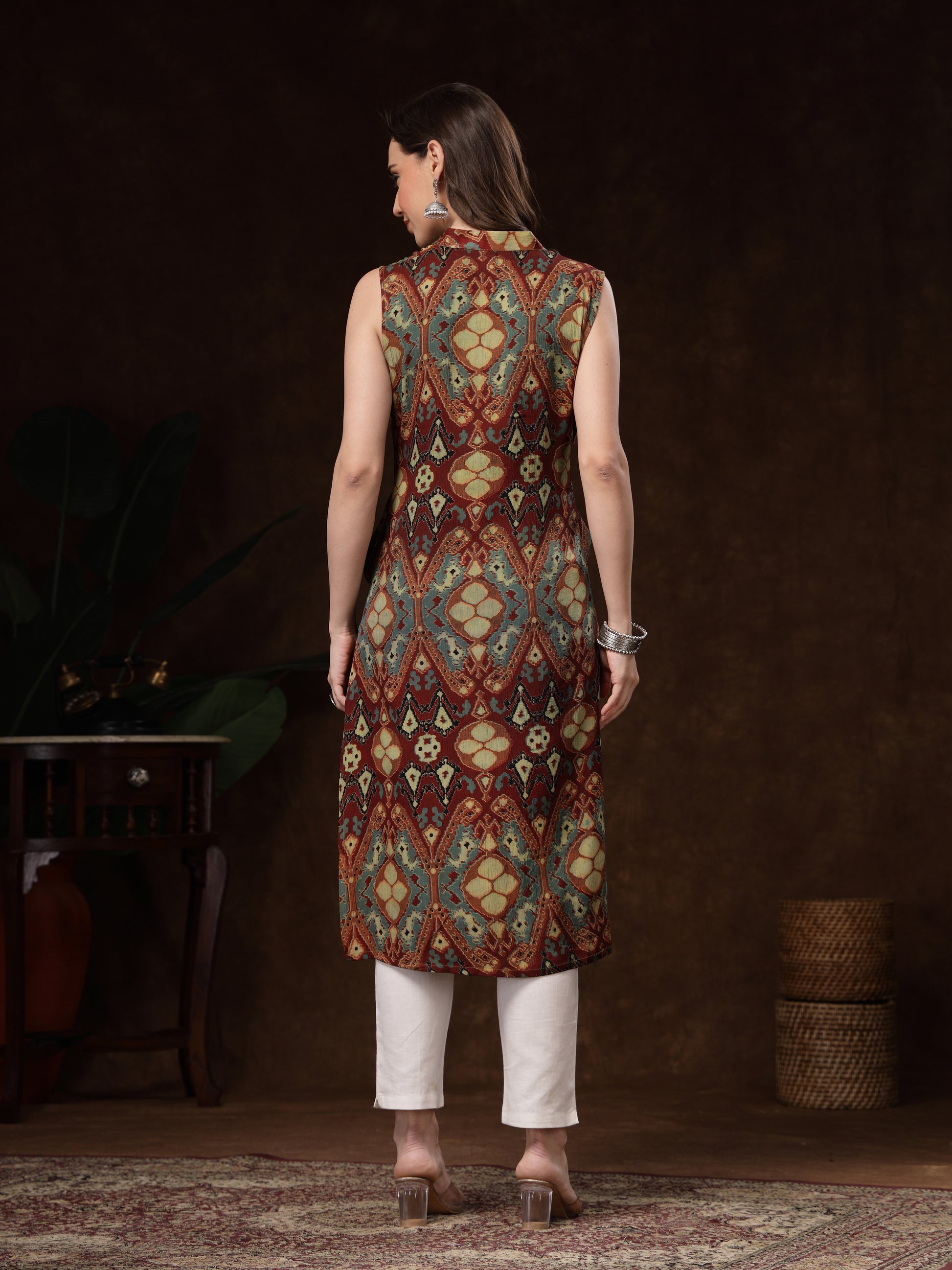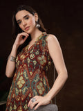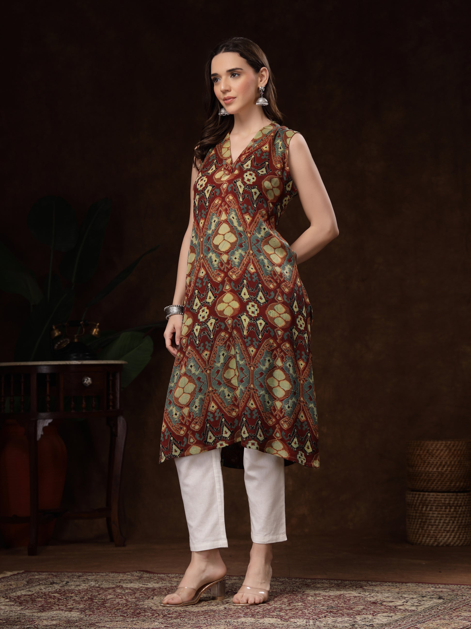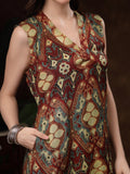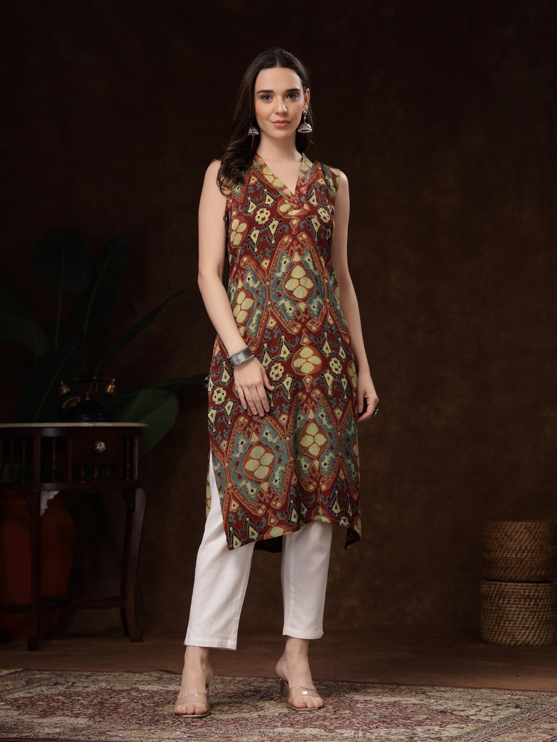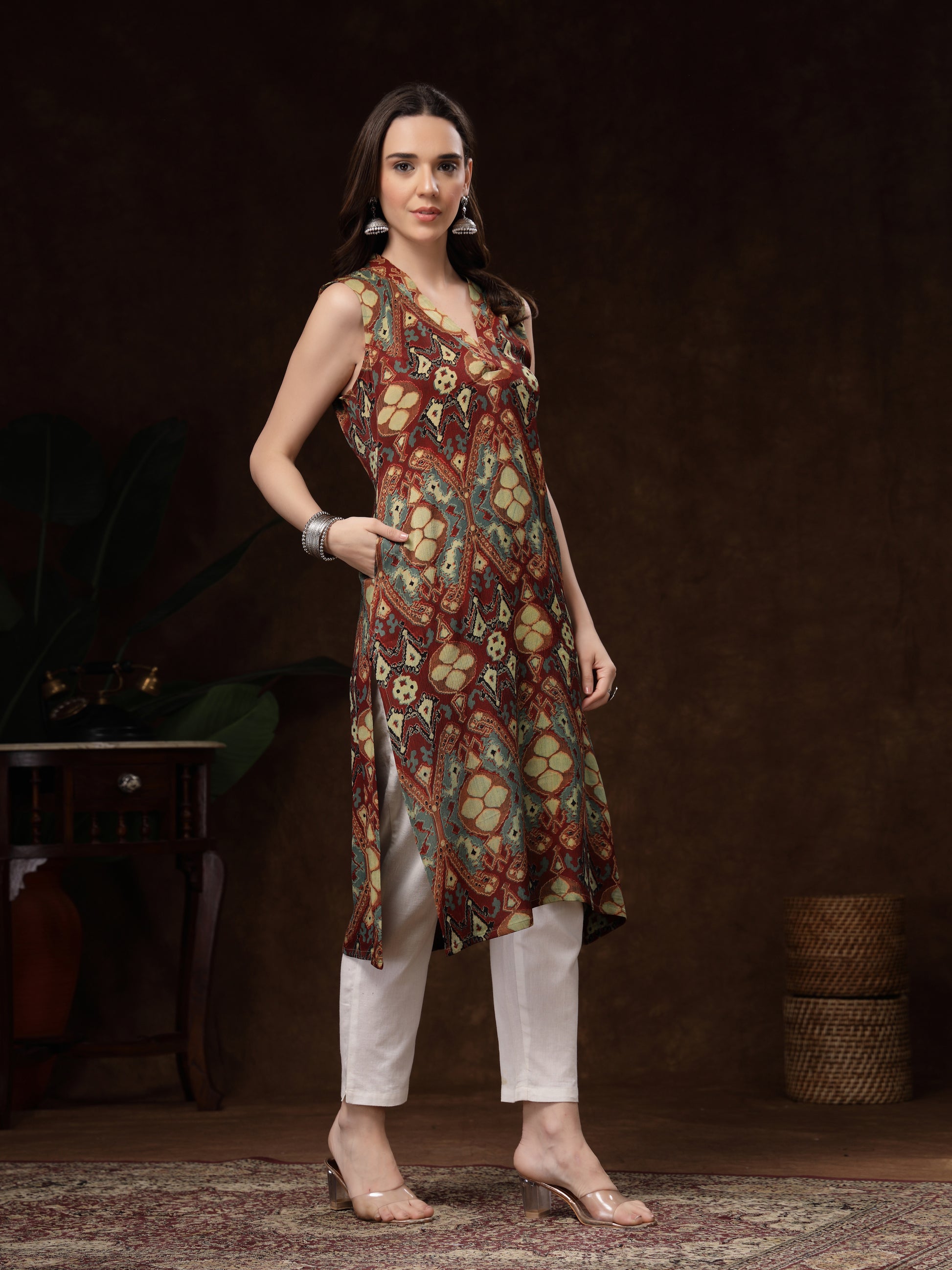 rust and teal printed sleeveless kurti. Crafted from soft, breathable crepe fabric, it drapes effortlessly and offers all-day comfort. The kurti features a stylish V-Neck.