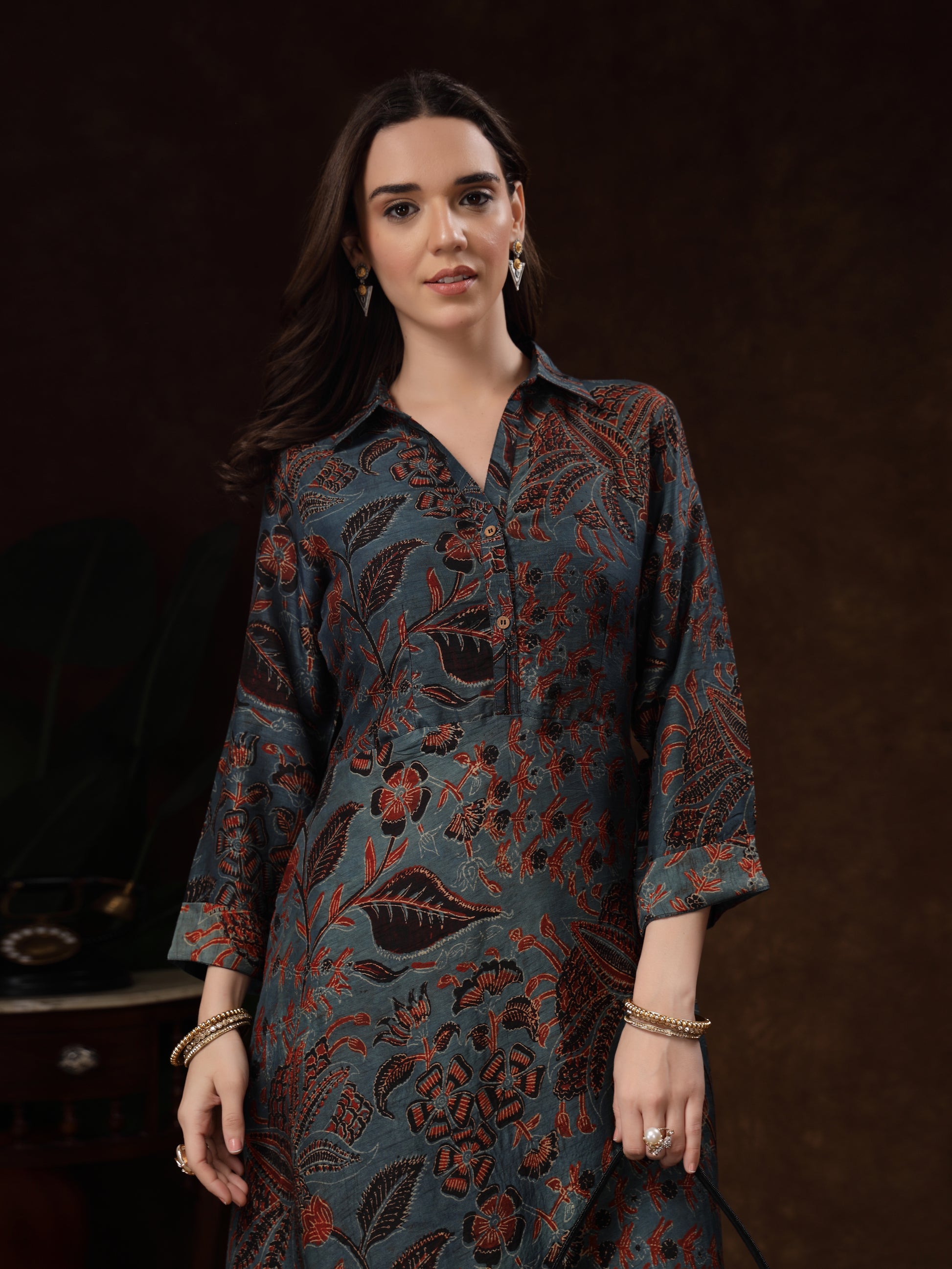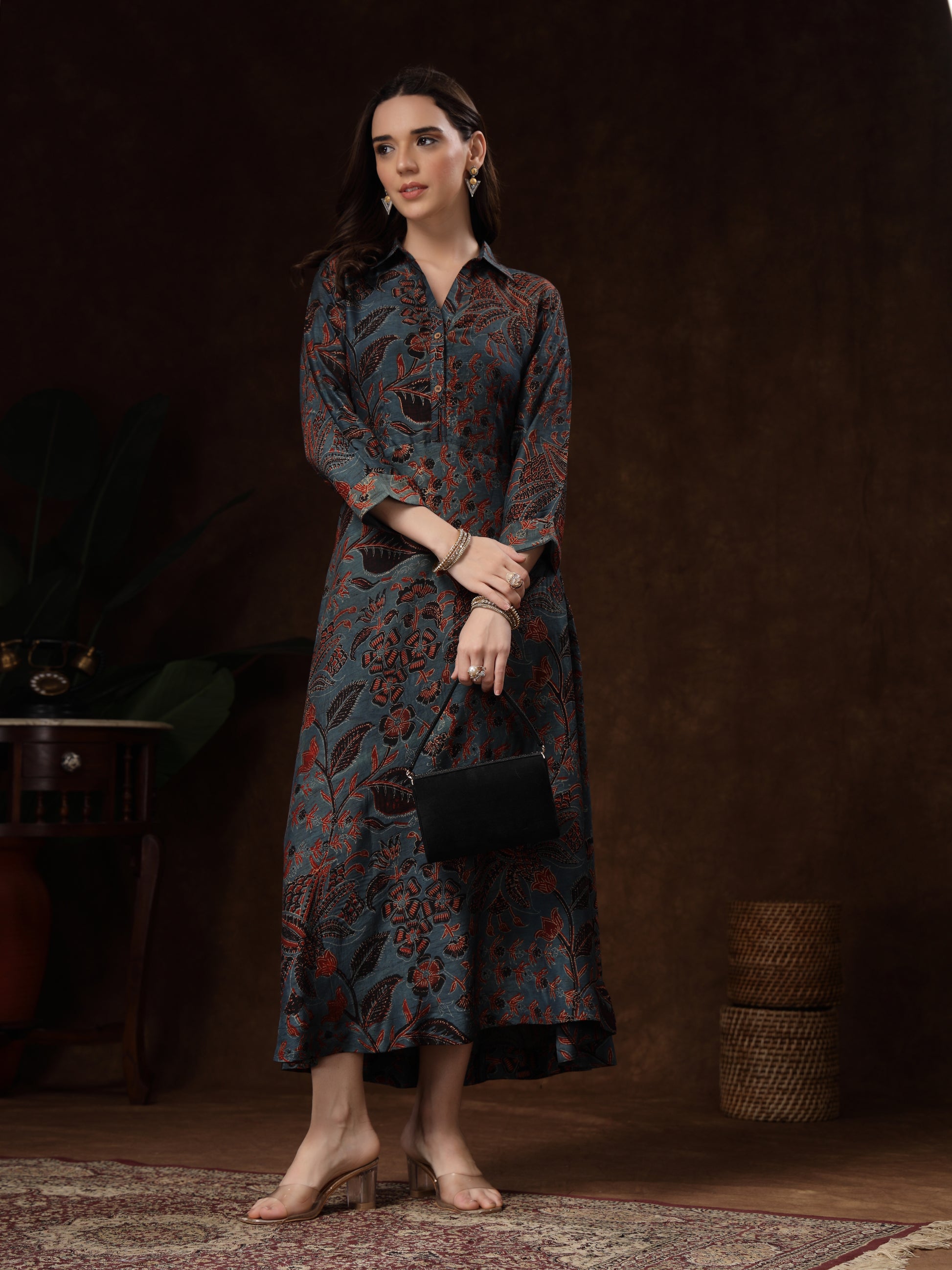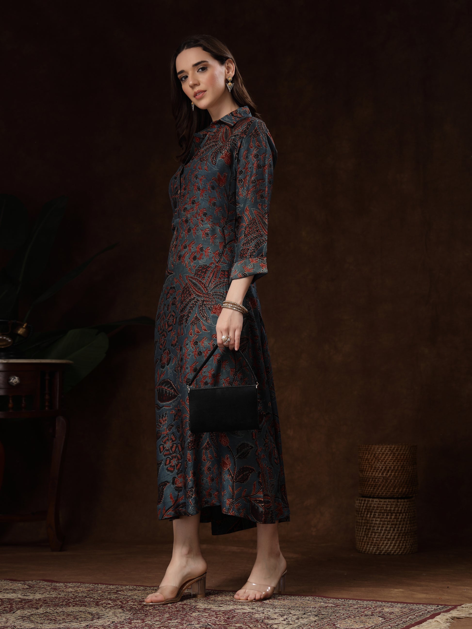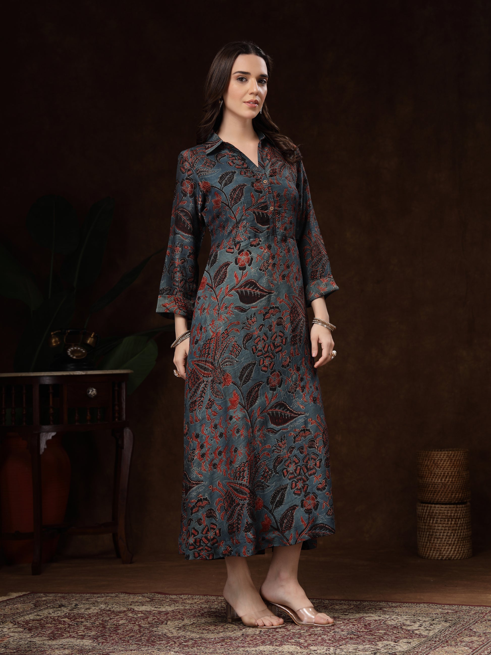 The collared neckline and three-quarter sleeves add a touch of sophistication, while the rich floral pattern brings a timeless charm. Perfect for festive gatherings, casual outings, office wear, or special occasions, this dress ensures you stand out with understated luxury.