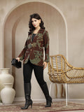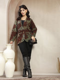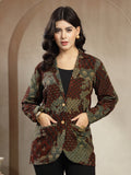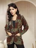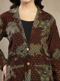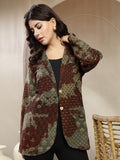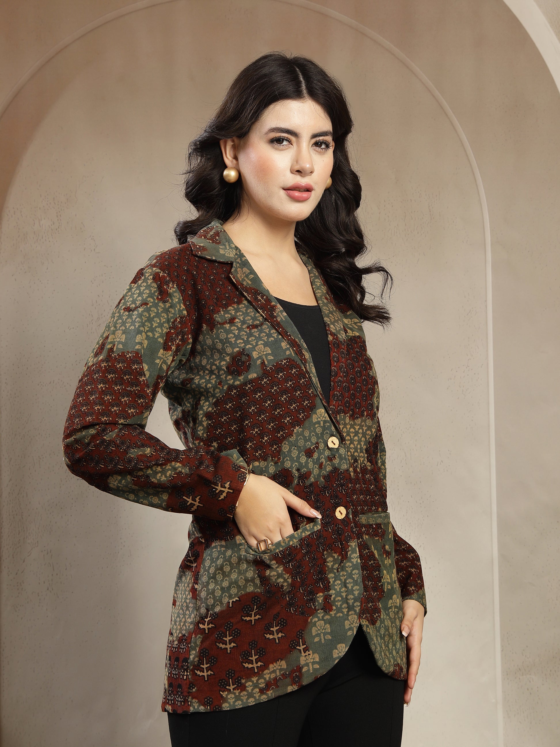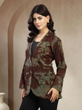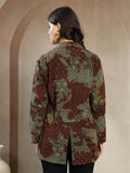 Elevate your everyday style with this beautifully hand block women’s cotrise Vanaspati print jacket. Featuring a blend of earthy tones—deep maroon, olive green, and subtle black—this jacket brings together traditional-inspired motifs with modern tailoring.